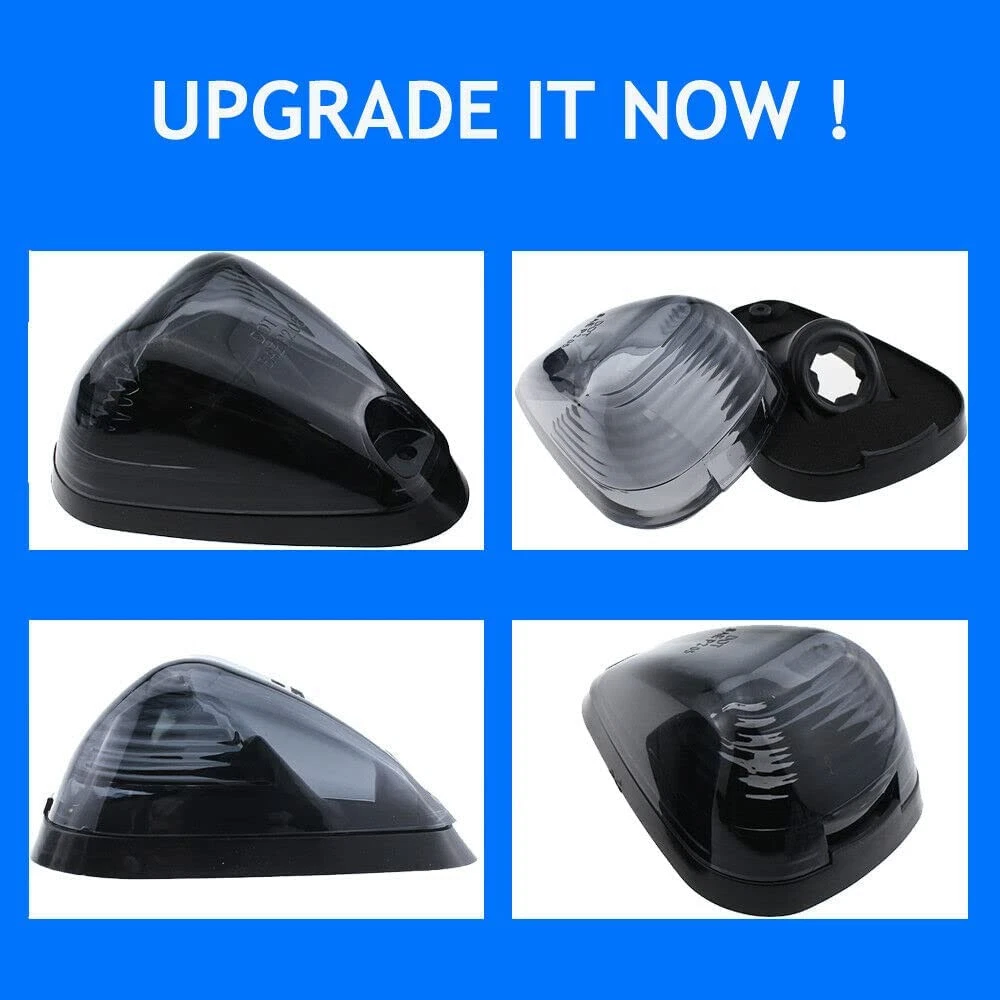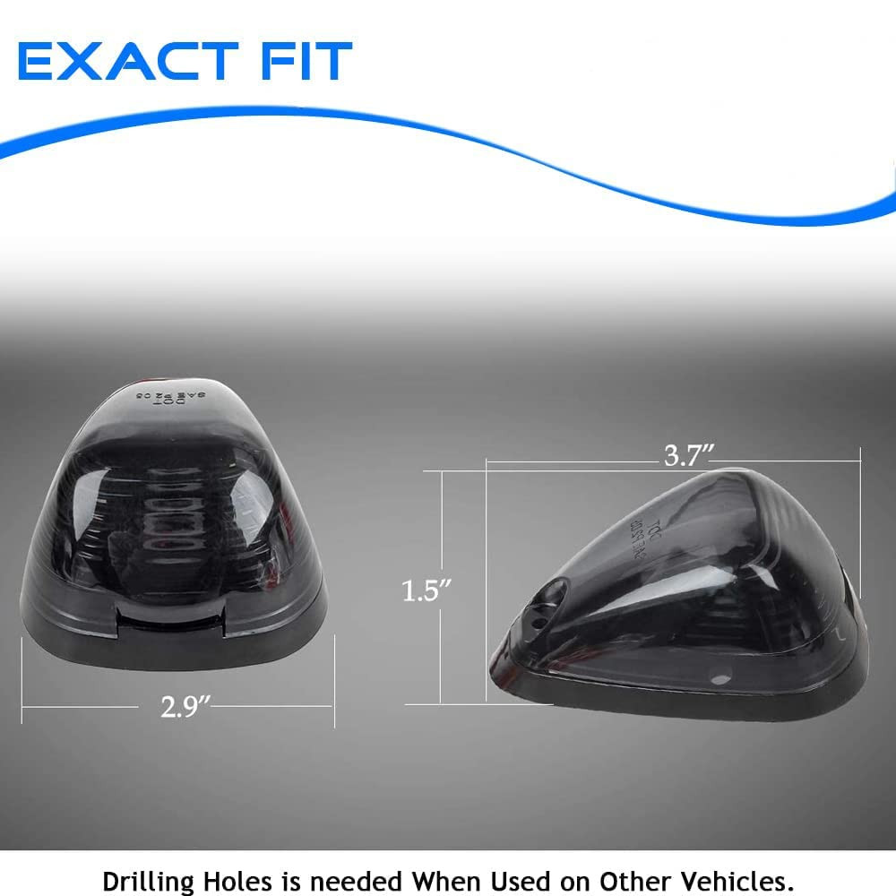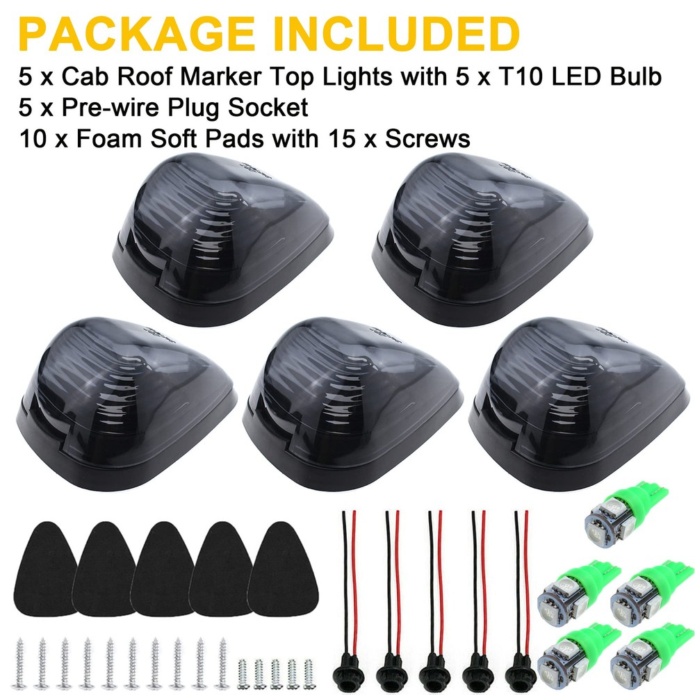 This Cab Roof Running Marker Light Set Complete Kit Compatible with 1999-2017 E150 E250 E350 E450 E550 F150 F250 F350 F450 F550 Super duty pickup truck with stock cab marker lights. Also Compatible with 2017 2018 E350 E450 Super Duty Trucks. (Do NOT fit 2017 2018 F250 - F550); Application: Cab Marker, Cab Marker Clearance Light, Roof Running Light, Roof clearance lights. Interchange Part Number: 8C34-15442-CB 8C34-15442-AD; 264143AM Lens Material: High quality: Every cab marker Lights kit features very strong ABS plastic lens and will not be fade from long time exposure to sunlight and weather elements; soft pads included, fit for fast feet or curved roofs Bulb size: 4 x 3" x 2"; Base size: 3.95" x 2.8" (LxW); Hole to hole distance: 1.7". Pack Includes: 5x Smoked Roof Cab Marker Lights with 5 bases (Assembly Kits) + 5x Green T10 194 168 LED Bulbs