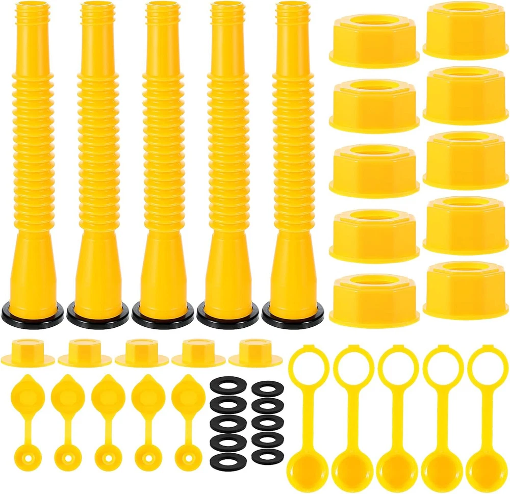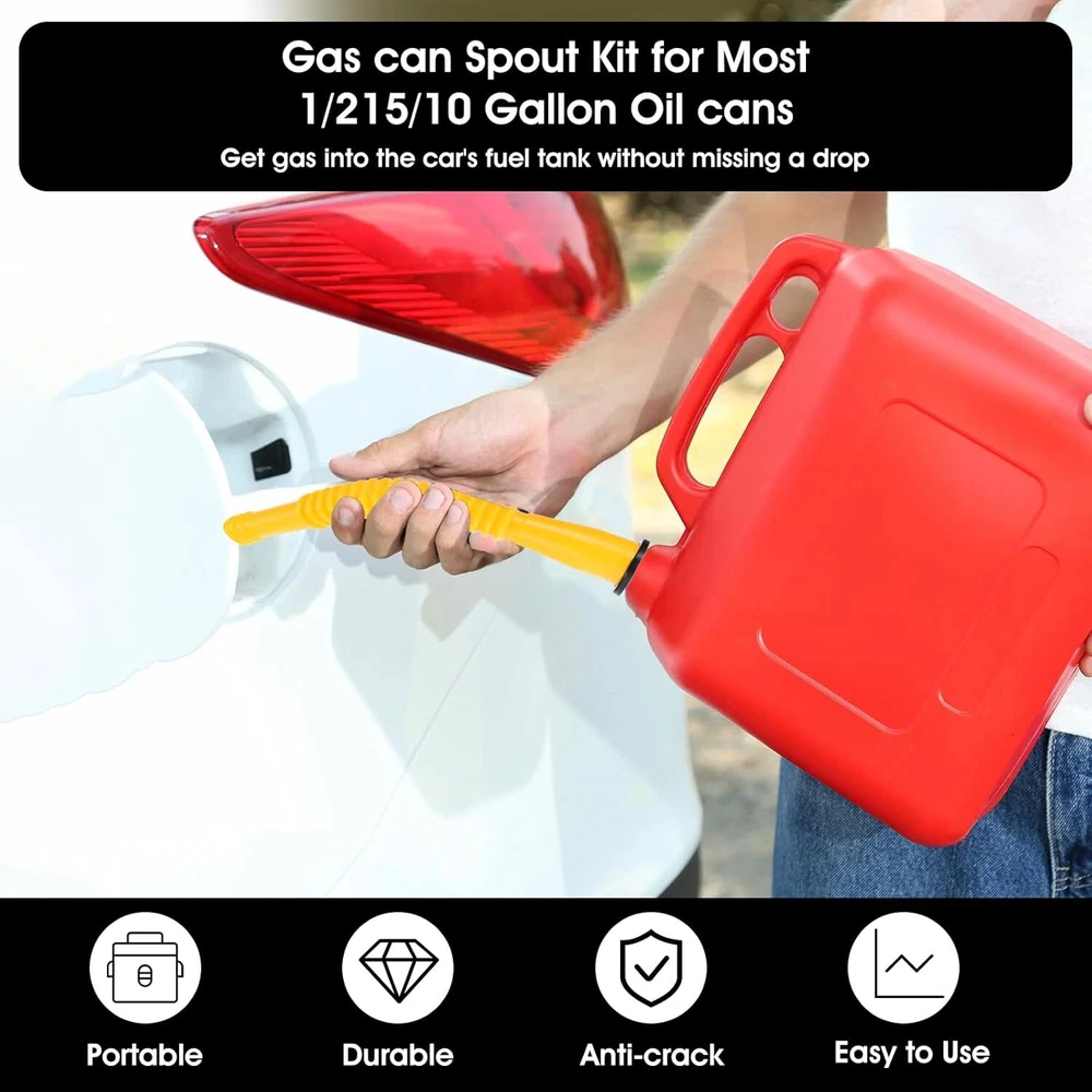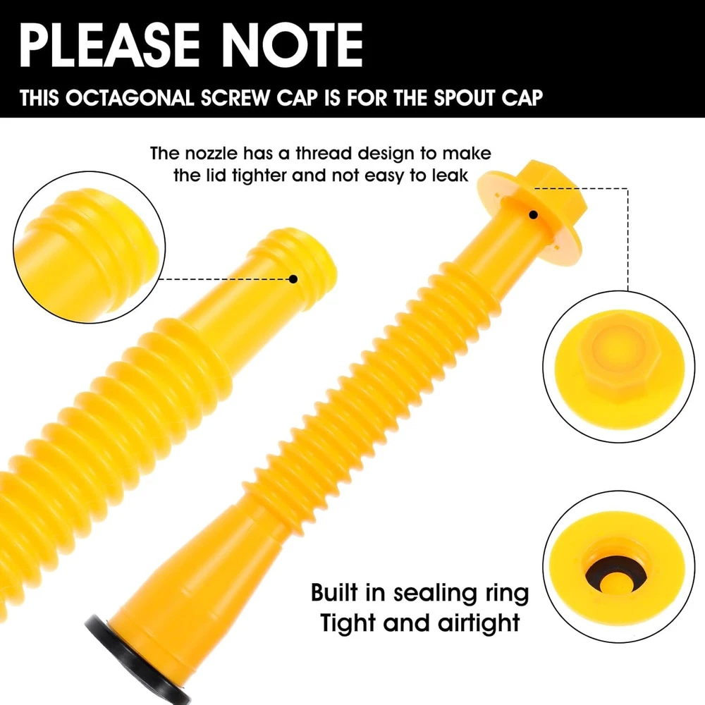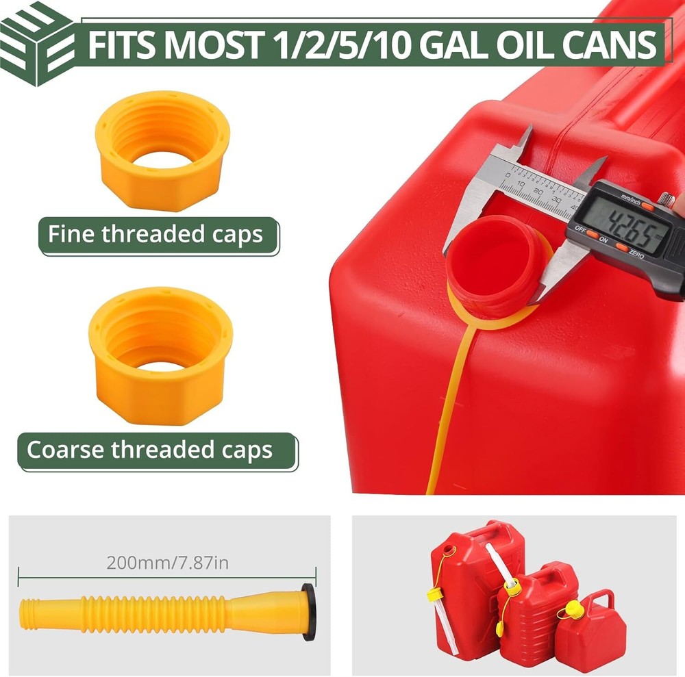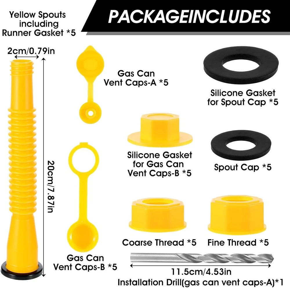 Product Features: ✨ Gas Can Spout Replacement Kit: Upgrade Your Gas Tank Cover for Versatile Use. ✨ Anti-overflow Design: Thanks to our anti-overflow design, the threaded spout tube and cap, along with a rubber sealing ring inside the cap, eliminate the risk of oil overflow. Simply tighten the spout cap after use, even during transportation or when the tank is positioned downward. ✨ We offer two types of gas can vent caps: To accommodate different oil cans. For cans without a vent, a quick drilling and installation process is all you need to start using our kit. For cans with a vent cap at the tail, our replacement vent cap can be easily installed, saving you the hassle of replacing the entire gas tank. ✨ Package Includes: Our comprehensive gas can spout replacement kit includes 5 Spouts and rubber gaskets, 5 spout sealing caps, 5 coarse threaded bases, 5 fine threaded bases, and 10 replacement vent caps. Upgrade your gas can today and save money by extending the life of your existing can instead of purchasing a new one. Product information: Product Name: Gas Can Spout Replacement Set Material: PE+Rubber Color: Yellow Size: As Shown Package included: 5x Flexible spout with rubber gasket 5x Coarse thread (1.75" Inch) caps 5x Fine thread (1.75" Inch) caps 5x Spout Sealing Caps 5x Gas Can Vent Caps-A 5x Gas Can Vent Caps-B 10x Black Gasket