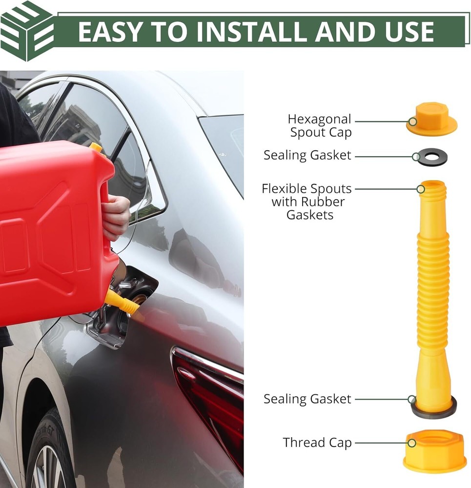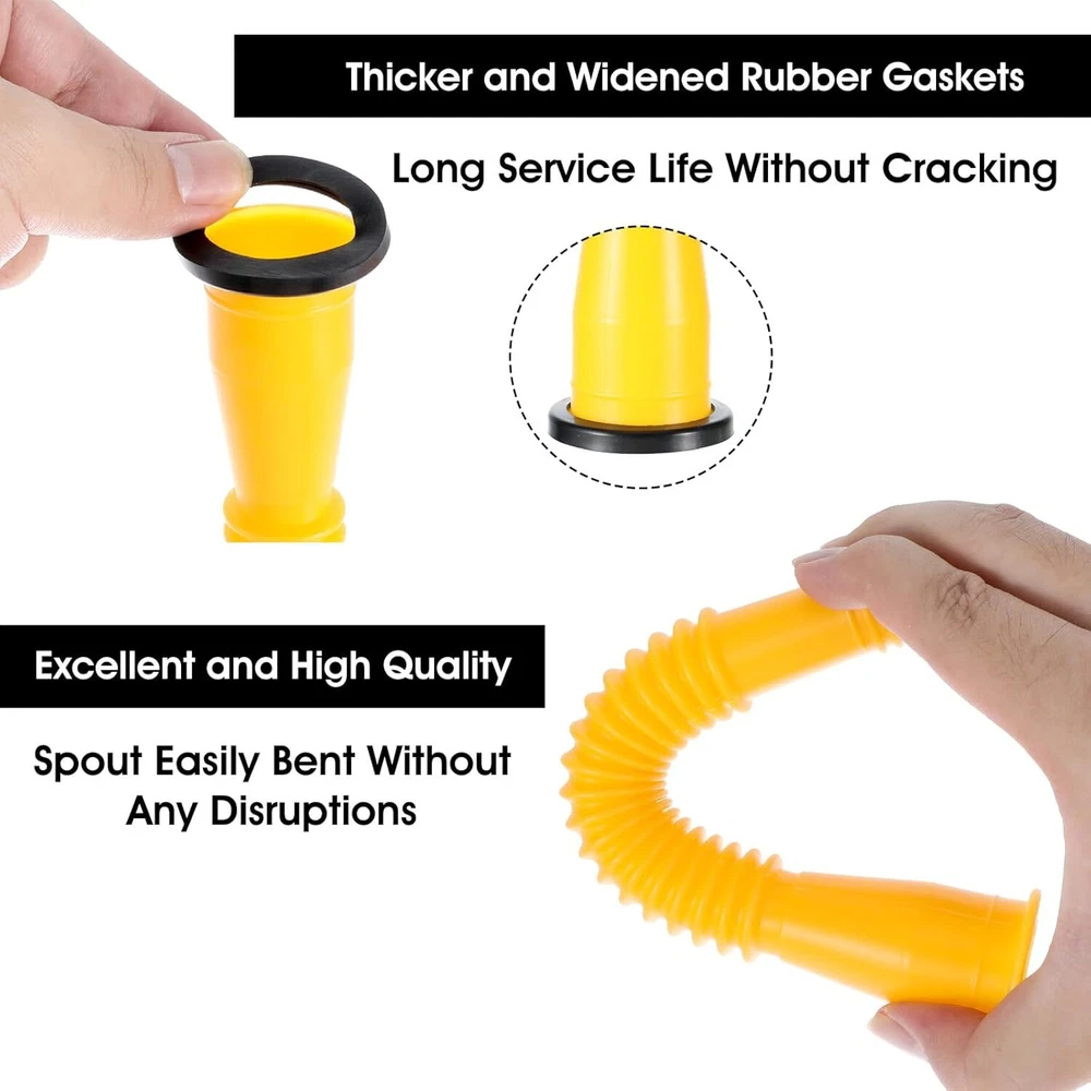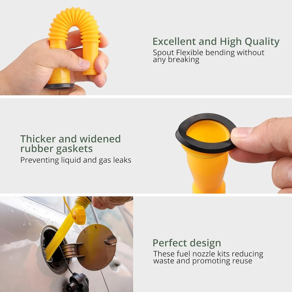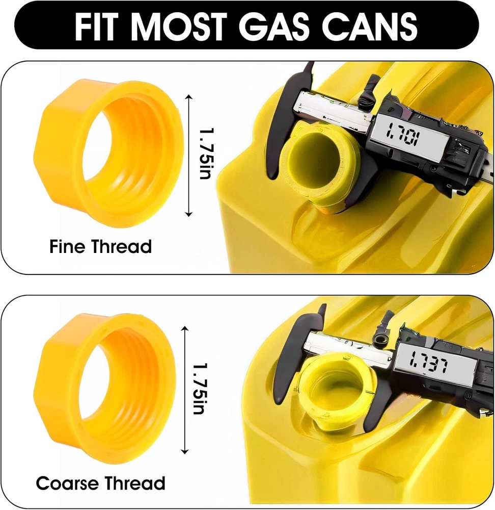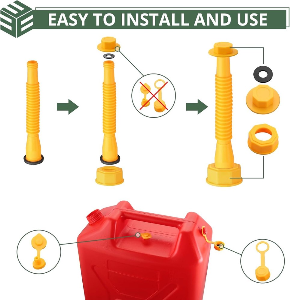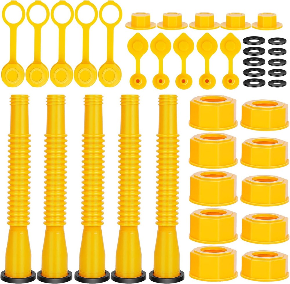 Product Features: ✨ Gas Can Spout Replacement Kit: Upgrade Your Gas Tank Cover for Versatile Use. ✨ Anti-overflow Design: Thanks to our anti-overflow design, the threaded spout tube and cap, along with a rubber sealing ring inside the cap, eliminate the risk of oil overflow. Simply tighten the spout cap after use, even during transportation or when the tank is positioned downward. ✨ We offer two types of gas can vent caps: To accommodate different oil cans. For cans without a vent, a quick drilling and installation process is all you need to start using our kit. For cans with a vent cap at the tail, our replacement vent cap can be easily installed, saving you the hassle of replacing the entire gas tank. ✨ Package Includes: Our comprehensive gas can spout replacement kit includes 5 Spouts and rubber gaskets, 5 spout sealing caps, 5 coarse threaded bases, 5 fine threaded bases, and 10 replacement vent caps. Upgrade your gas can today and save money by extending the life of your existing can instead of purchasing a new one. Product information: Product Name: Gas Can Spout Replacement Set Material: PE+Rubber Color: Yellow Size: As Shown Package included: 5x Flexible spout with rubber gasket 5x Coarse thread (1.75" Inch) caps 5x Fine thread (1.75" Inch) caps 5x Spout Sealing Caps 5x Gas Can Vent Caps-A 5x Gas Can Vent Caps-B 10x Black Gasket
