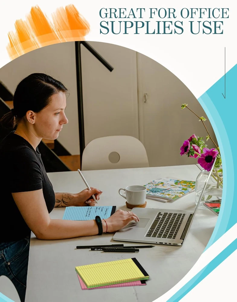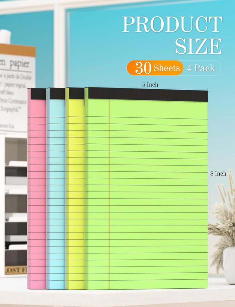 【LINED LEGAL PADS】- Each colored note pads measures 5” x 8" and contains 30 sheets per legal pad, which perfect for writing notes, letters, thoughts, reminders lists and more. Quality lined paper pads both sides with 9/32" college ruled lines lines format provides plenty of space for your notes. Colored legal pads 5x8 improve the efficiency of your note-taking. 【MICRO PERFORATED】- Notepads 5x8 sheet is designed with perforations at the top. Sheets measure 5x7 when torn out. These rows of small holes let you separate a notebook paper sheet from the rest of the pad without damaging the binding. Small legal pads 5x8 colored allowing you to remove pages effortlessly without damaging the sheet. 【STURDY THICK BACKING】- The hardboard back of the colored note pads 5x8 pink lined paper made of quality card stock material for writing support. The sturdy backing of the lined notepads paper 5x8 offers additional stability while you write, draw, and design. Writing pads 5x8 pastel legal pads allows you to take notes without a table or desk to lean on. 【WIDE APPLICATIONS】- This pink legal pad 5x8 pack is great for longer lists, and students, teachers, home, school or office, business, and more. You can use legal note pads 5x8 college ruled pink notebook paper create reminders, to do lists, notes with more room to write, you won't miss any important details, lined paper pads can be less straining on your eyes. 【YOU WILL GET】- This product includes 4 packs colored writing tablets with 30 sheets, total in 120 sheets, 5x8 inches in size. The lined paper tablets 5x8 spacing between horizontal lines is about 7mm. These mini legal note pads 5x8 note paper sufficient quantity can meet your daily study and work needs, without worrying about running out of paper. Product Description College Ruled: 9/32 inch line spacing with more rows to write on. Sturdy Backing: added writing pad support and stability while you write, draw. Perforated Top: easy removal of the sheets from the pad, without damaging sheet. Product Size: 5 x 8 in (W x L, includes binding) Tear out Size: 5 x 7 in. Colored Legal Pads 5 x 8 Note Pads Pink Notebook Paper for Office Supplies Colored Note Pads 5 x 8 Inch Writing Pads of Paper Good for Home Use legal pads 5 x 8 note pads are designed for your everyday writing needs. They work well for home-improvement projects, to-do lists. Enjoy smooth writing paper in a reliable everyday writing pad. The pads are perfect for jotting down job-interview questions, taking notes in the boardroom. Small Legal Pads Make Great for Writings, Drafts, Stimulate Child's Interest You can use legal note pads create reminders, to do lists, notes with more room to write, you won't miss any important details, lined paper pads can be less straining on your eyes. Each sheet is made from quality and premium paper that won't bleed through so you can maximize the use of every page. How many sheets are on each pad? They are 30 sheets per pad. Is there cardboard on the back? Cardboard on the back makes it easy to write without other support. Does it peel off easily and cleanly? The paper is perforated at the top and can be easily torn from the top without tearing. How well does this paper write with a fountain pen? Writing with a fountain pen won't bleed either. How wide is the writing space between the lines of the legal pads? These legal pads are college ruled (9/32" spacing between lines).