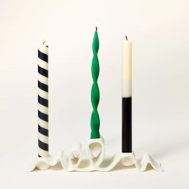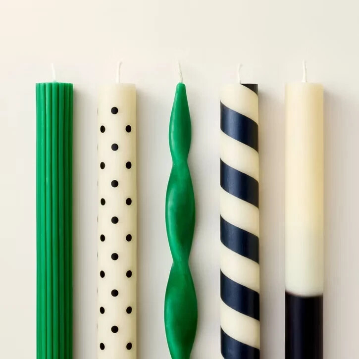 5ct Taper Candle Set Black/Cream/Green - kate spade new york x Target Set of 5 taper candles Cotton wicks Polka dot, solid, color block, stripe patterns 10" H x 0.866" D 80% paraffin and 20% palm wax 30 hours total burn time Unscented Number of Pieces: 5 Dimensions (Overall): 10" (H) x 5.1" (W) x 10.2" (D) Weight: 14.82 Oz