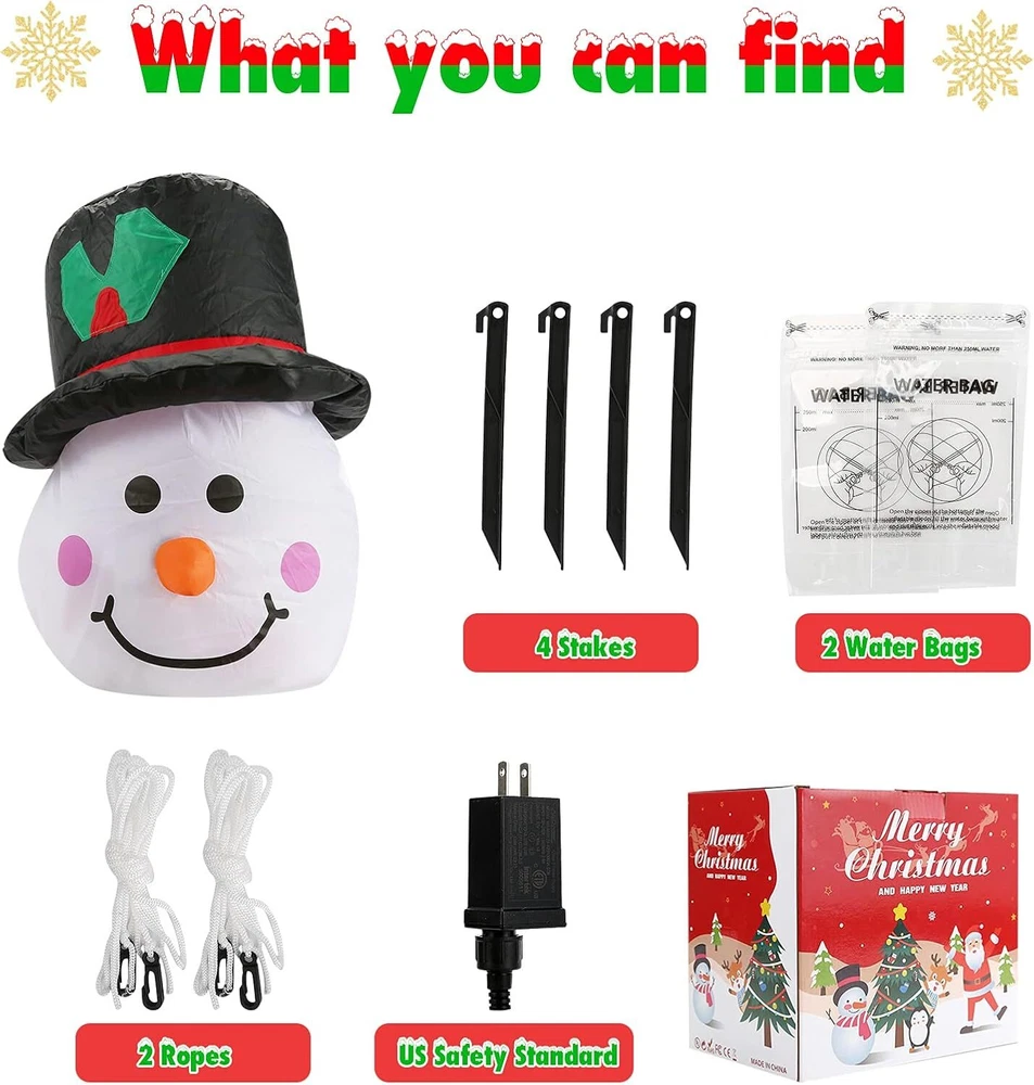 5ft Inflatable Snowman Christmas Outdoor Decorations Inflatables with Built-in Rotating LED Lights 5 Feet Blow Up Snow Man for Yard Garden Lawn Indoor Outdoor Item Description ❤ Inflatable with Festive Rotating LED: Light up your holiday with this inflatable snowman. The colorful rotating light looks amazing at night, creating a winter wonderland right in your own yard ❤Glowing Christmas Decorations: Deck the yard with the cute inflatable snowman wearing a top hat and holding a little present. It makes the perfect way to spread holiday cheer in your neighborhood and catch the eye of your family, friends, and anyone who happens to drive by ❤ Super Easy Setup: The happy snowman package includes everything needed for easy setup- powerful built-in fan, two waterbags, 4 stakes, 2 ropes. Just plug it in, stake it down and watch the magic unfold. When deflated, simple and compact to store without needing a lot of space ❤ Duarable Christmas Inftable: The blow up snowman is made of high quality polyester cloth, which is weatherproof and fades resistant. The UL certified adapter ensures safe indoor and outdoor use.Kindly note that the plug and fan are not waterproof ❤ Indoor and Outdoor Holiday Decorations: Standing 5 feet, the blow up snowman is great for different occasions at parties, home, office, classroom, shopping malls and more. Bring a happy Christmas atmosphere for your family and fiend › See more product details You definitely need one of the Inflatable snowman to add atmosphere. First of all, Christmas decorations can inflate quickly and deflate for easy storage. Second, our self-inflatable Christmas decorations are illuminated with internal Rotating LED lights to create a joyous glow at night. -Perfect decoration for parties, lawns and festivals. -Bright Rotating LED lights inside. Shine at night, bringing the best attraction for neighbors and guests. -Lightweight material, very easy to install and store, easy to carry, can be transported to any location for events. -When it shines at night, it will subconsciously attract the attention of neighbors, and the yard is full of festive atmosphere. Believe that Xmas blow up yard decorations can bring more joy to you or your friends, and our weather-resistant materials enable it to be used indoors or outdoors in winter. - Due to manual measurement, there may be small deviations in product size. Please refer to the actual product received. - Kindly note that the plug and fan are not waterproof. Payment We accept payment only through PAYPAL Shipping We ship products worldwide through standard express courier service, it will reach within 7 to 10 days to abroad buyers, we ship the product after recieved clear payment and give full information about shipment to the buyer Return We accept product return within 7 to 21 days from delivery date but product should be in original position and not in damaged condition,the return shipping charges will be buyer responsibility