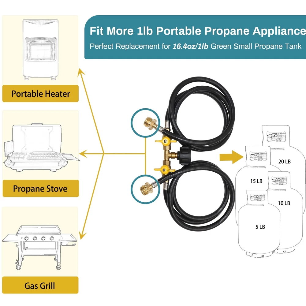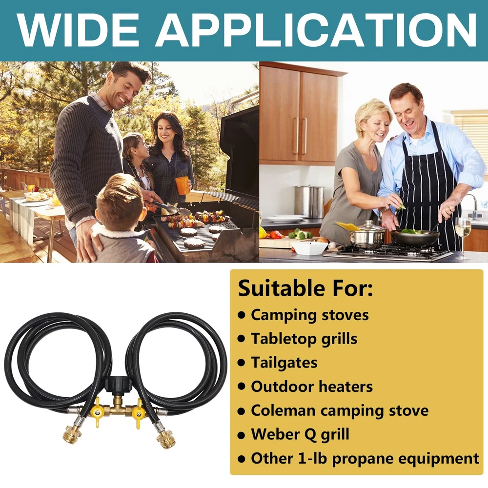 WIDELY APPLICATION: The propane 2 way Y splitter hose is with all equipment with QCC1/Type 1 connection and 1 lb to 20 lb propane tank, suitable for camping stoves, tabletop grills, tailgates, outdoor heaters, coleman camping stove, weber Q grill and more 1-lb portable propane equipment. EASY & CONVENIENT: This propane way splitter hose is a perfect for the 16.4oz/1 pound green small tank, and it can be directly connected to a 1-pound portable propane device without an additional regulator. UPGRADED DESIGN: The 2 way design allows you to connect appliance easily at the same time to the propane tank by hand without any tools. Equipped with a control valve on each way of the hose, convenient to control the flow. SUPERIOR QUALITY: Both adapters are made of solid brass, and the hose is made of high quality rubber, which allows a long-lasting life of the product. 350PSI propane tank outlet pressure, and the over flow&heating protection design can ensure safety. EXCELLENT SERVICE: We are confident with our products, so we provide year Service! If you have any questions, Please feel free to us. We will give you a satisfactory answer within 12 hours.