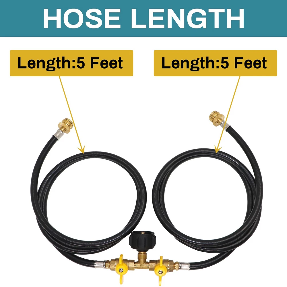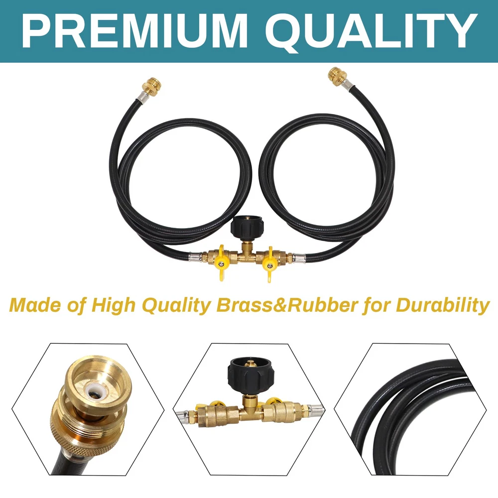 WIDELY APPLICATION: The propane 2 way Y splitter hose is compatible with all equipment with QCC1/Type 1 connection and 1 lb to 20 lb propane tank, suitable for camping stoves, tabletop grills, tailgates, outdoor heaters, coleman camping stove, weber Q grill and more 1-lb portable propane equipment. EASY & CONVENIENT: This propane two way splitter hose is a perfect replacement for the 16.4oz/1 pound green small tank, and it can be directly connected to a 1-pound portable propane device without an additional regulator. UPGRADED DESIGN: The 2 way design allows you to connect two appliance easily at the same time to the propane tank by hand without any tools. Equipped with a control valve on each way of the hose, convenient to control the flow. SUPERIOR QUALITY: Both adapters are made of solid brass, and the hose is made of high quality rubber, which allows a long-lasting life of the product. 350PSI rated propane tank outlet pressure, and the over flow&heating protection design can ensure safety. EXCELLENT SERVICE: We are confident with our products, so we provide one year Service! If you have any questions, Please feel free to email us. We will give you a satisfactory answer within 12 hours.