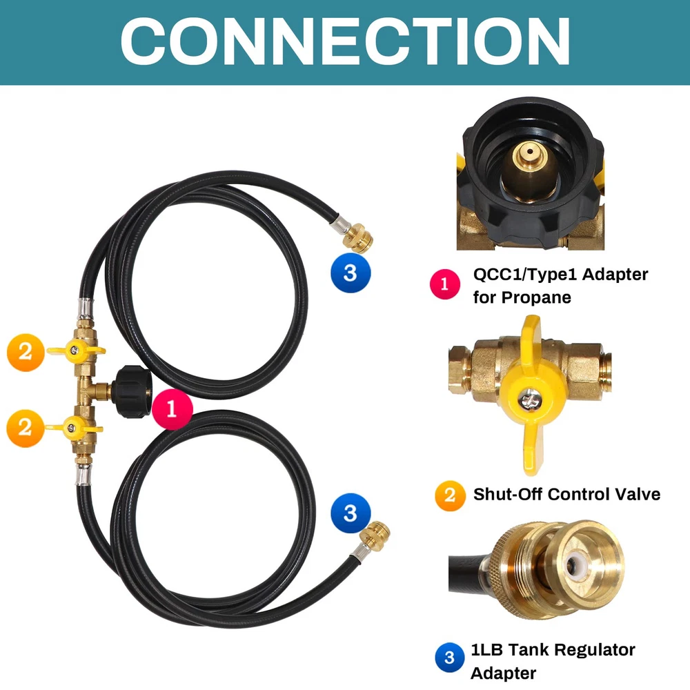 WIDELY APPLICATION: The propane 2 way Y splitter hose is compatible with all equipment with QCC1/Type 1 connection and 1 lb to 20 lb propane tank, suitable for camping stoves, tabletop grills, tailgates, outdoor heaters, coleman camping stove, weber Q grill and more 1-lb portable propane equipment. EASY & CONVENIENT: This propane two way splitter hose is a perfect replacement for the 16.4oz/1 pound green small tank, and it can be directly connected to a 1-pound portable propane device without an additional regulator. UPGRADED DESIGN: The 2 way design allows you to connect two appliance easily at the same time to the propane tank by hand without any tools. Equipped with a control valve on each way of the hose, convenient to control the flow. SUPERIOR QUALITY: Both adapters are made of solid brass, and the hose is made of high quality rubber, which allows a long-lasting life of the product. 350PSI rated propane tank outlet pressure, and the over flow&heating protection design can ensure safety. EXCELLENT SERVICE: We are confident with our products, so we provide one year Service! If you have any questions, Please feel free to email us. We will give you a satisfactory answer within 12 hours.