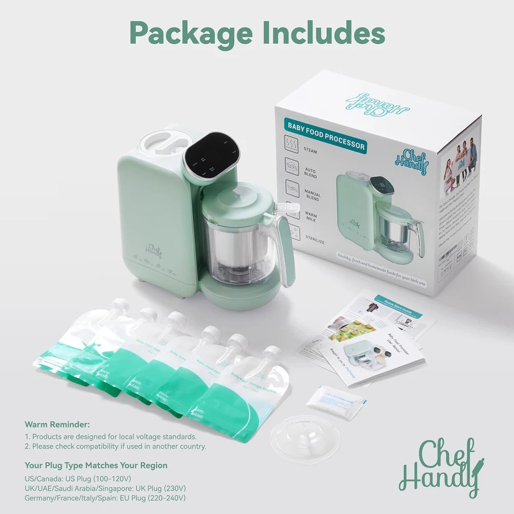 Item Type Name: baby food maker Voltage: 240 Volts Item Height: 11 inches Wattage: 300 watts Power Source: Corded Electric Blade Material: Stainless Steel gtin13: 741754217299 Product Care Instructions: Hand Wash Model Name: BFP -1600E Manufacturer: chefhandy Brand: chefhandy UPC: 741754217299 Is the item dishwasher safe?: Yes Item Weight: 4.9 item_weight_unit_of_measure: LB Special Features: Auto Shut Off Color: Green Country of Origin: China Recommended Uses For Product: Blend Item Dimensions D x W x H: 12"D x 5.6"W x 11"H