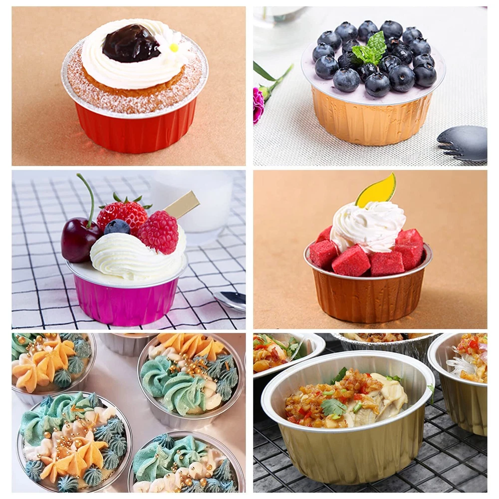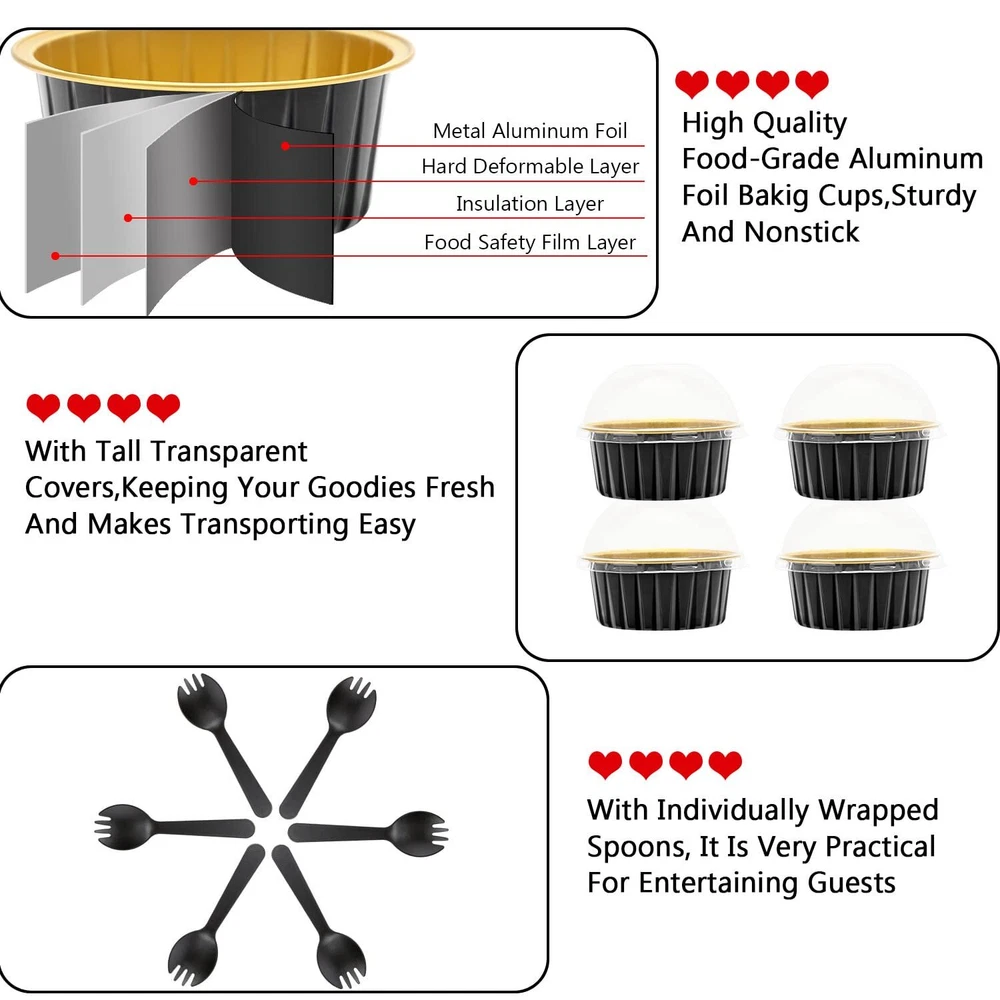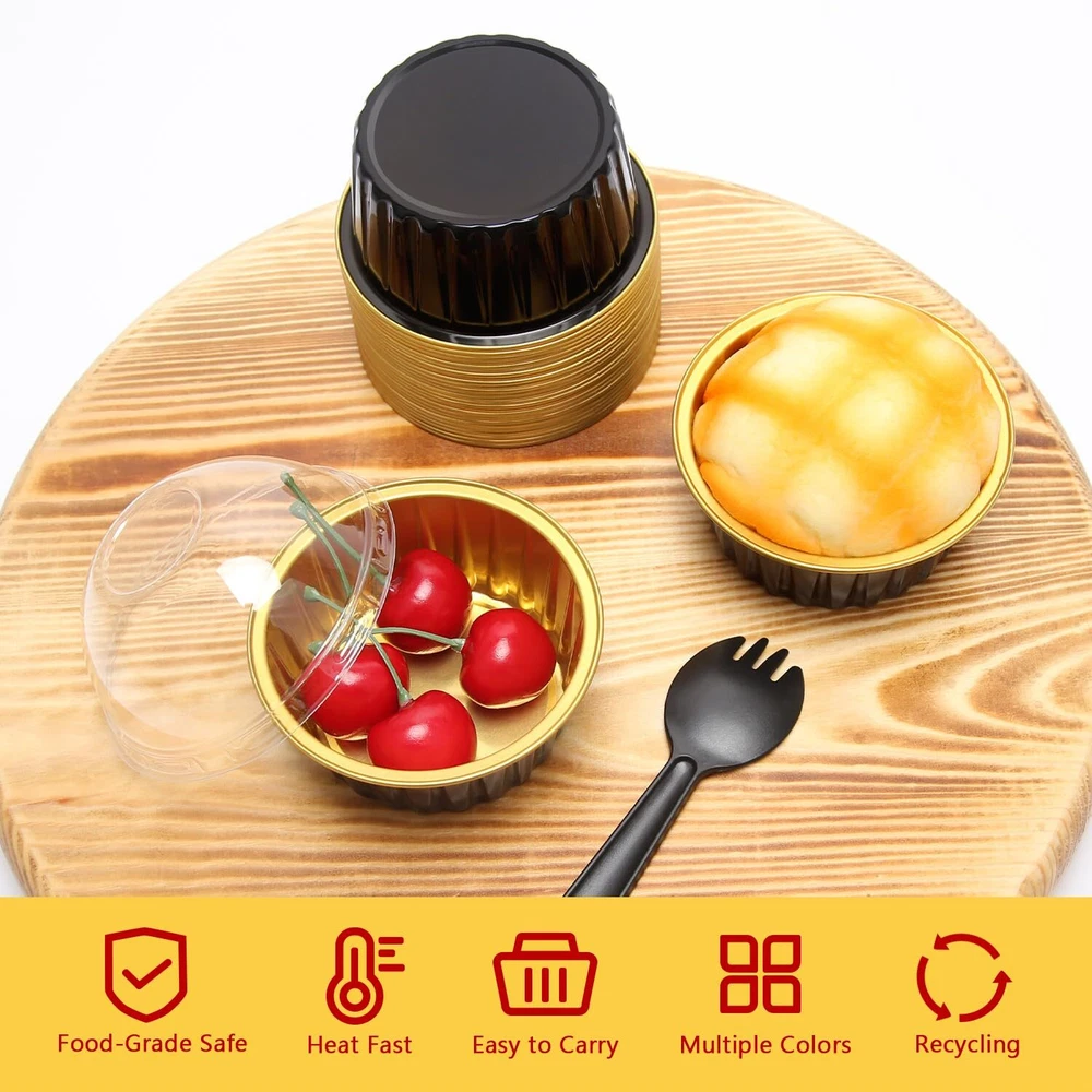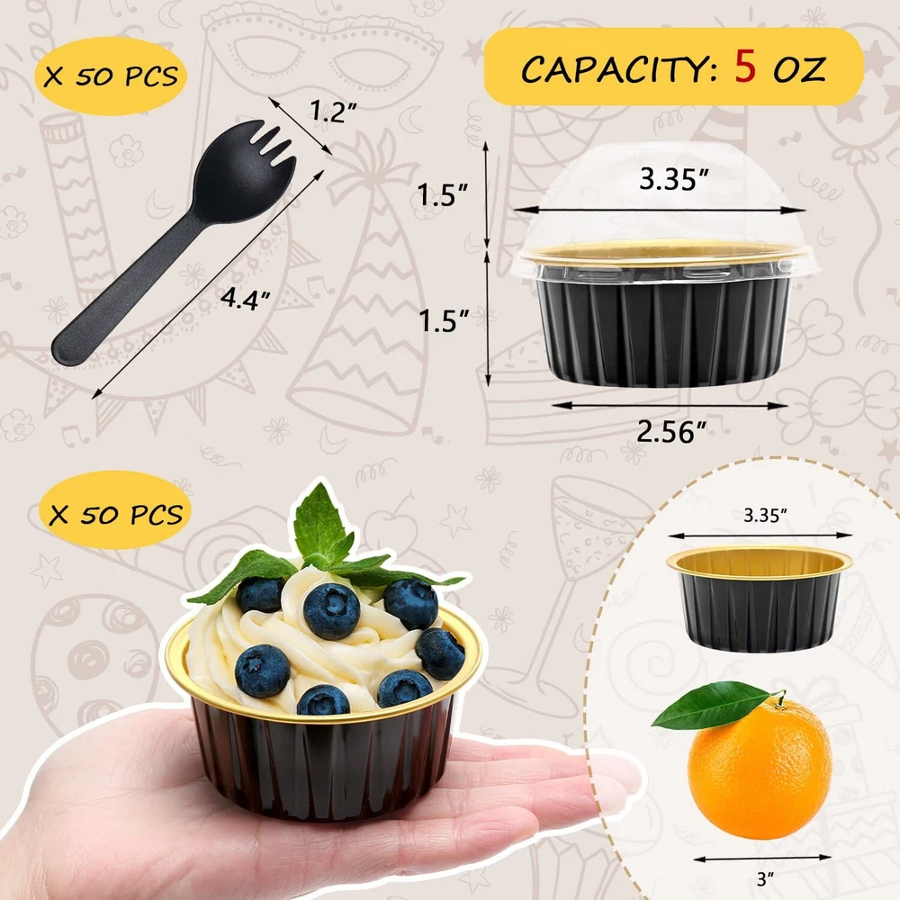 Specifications:The Package Includes:50 x Cupcake Cups + 50 x Clear Dome Lids + 50 x Black SpoonsMaterial:Solid Food-Aluminum FoilVolume:About 5 ounceDimensions: Cups: Top Circle: 3.35" , Bottom: 2.56 " , Height: 1.5"Dome Lids: Circle: 3.35" , Height: 1.5"Spoons:Length: 4.5" , Width: 1.3"Feature:NO BAKING TRAY NEEDED:The aluminum foil cupcake liners are sturdy and thick enough,which enable the cups stand well.WITH TALL DOME LIDS:The matching clear dome lid height 1.5", is more suitable for adding frosting to the baked cupcake.IDEAL DESSERT RAMEKINS:This muffin tins are great for cupcake,muffin,mini pie, small cake,souffle, pudding, cheesecake, jello,creme Brulee,snack and much more.WIDE APPLICATION:Our muffin liners with lids and spoons are suitable for family individual use, bakery and restaurants, alsosuitable for various occasions, such as weddings, baby showers,thanksgiving,Christmas,etc.Tips:1.Lids come with a combination of . Separate them when using please.2.The clear lids are not and cannot be put in the oven!Please allow cups to cool prior to applying lids.3.Please use anti-scald gloves to avoid burns when taking them out of the oven. 【Pack of 50 Sets】 - Including 50pcs cupcake liners with 50 matching transparent dome lids,and 50 individually wrapped spoons.Sturdy muffin cups with lids, facilitate you to carry cupcakes muffin out with no need of cupcake holders. 【Mini Aluminum Foil Baking Tins】 - These jumbo muffin cups are made of food-aluminum foil that has excellent thermal conductivity, shortening baking time. They are oven, grill, air fryer and refrigerator safe and can withstand temperatures of up to 250℃/482℉.(NOTE:The clear lids are not !) 【5oz Cupcake Baking Cups with Lids】 - These cupcake cups size: 3.3"D x 1.5"H;The matching clear dome lid height 1.5".The tall dome cover is more suitable for adding frosting to the baked cupcake. Ideal ramekins for cupcake,muffin,mini pie, small cake,souffle, pudding, mini cheesecake,creme Brulee,custard and much more. 【Easy To Use】 - This small baking tins is not easy to deform in the baking process,not only can be used as a small cupcake pan.Matching the top cover,but also a exquisite package container.without demudding and waste time washing the baking tray, you can enjoy baking more. 【Wide Usage 】- These cute mini pans with lids and spoons are great for home and outdoor usage such as birthday party, wedding,baby shower,thanksgiving,Christmas and Halloween,etc.holiday celebration,And picnic, camping and other leisure activities. Also ideal for restaurants, bakery, chef,and other catering venues.