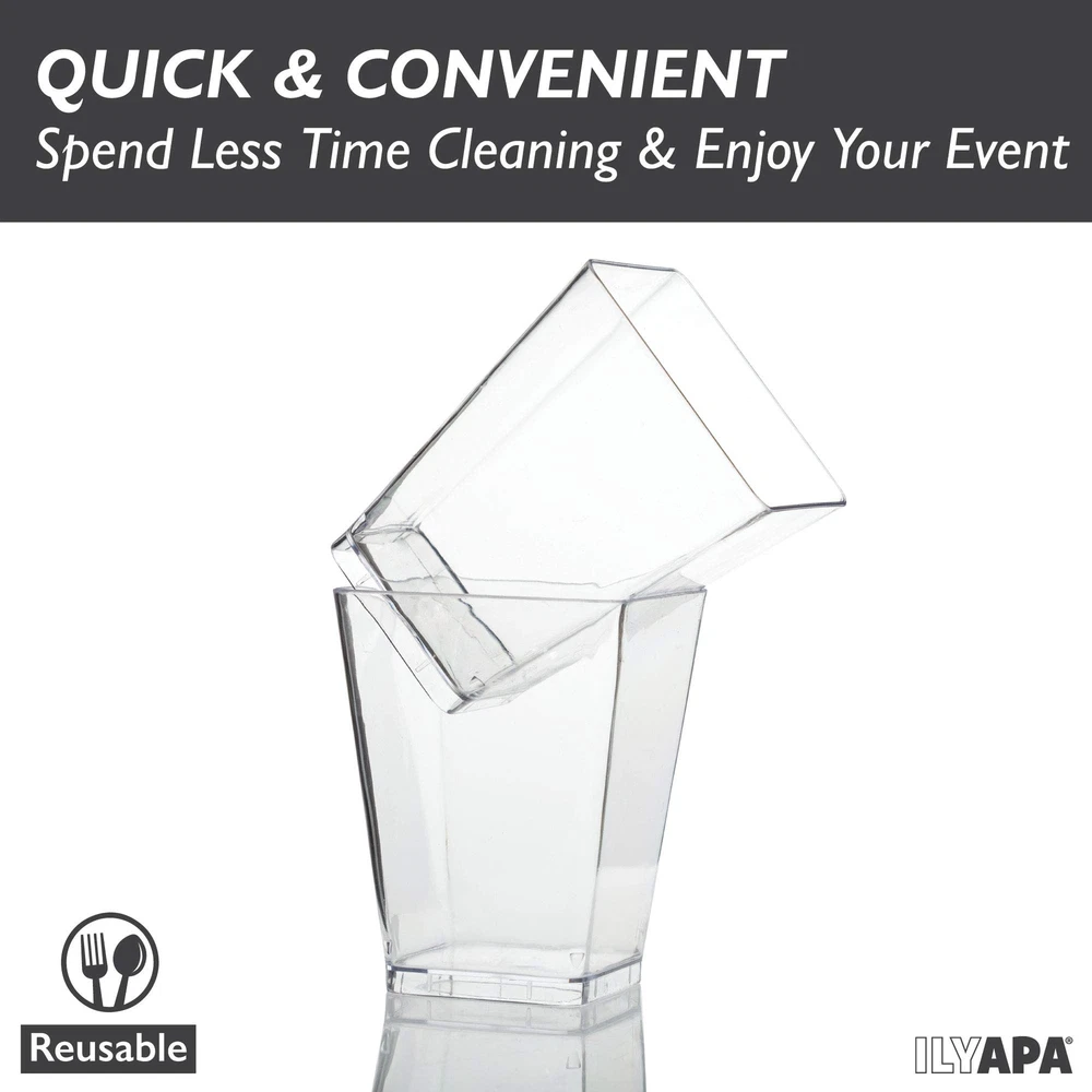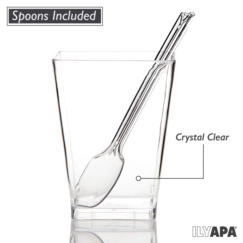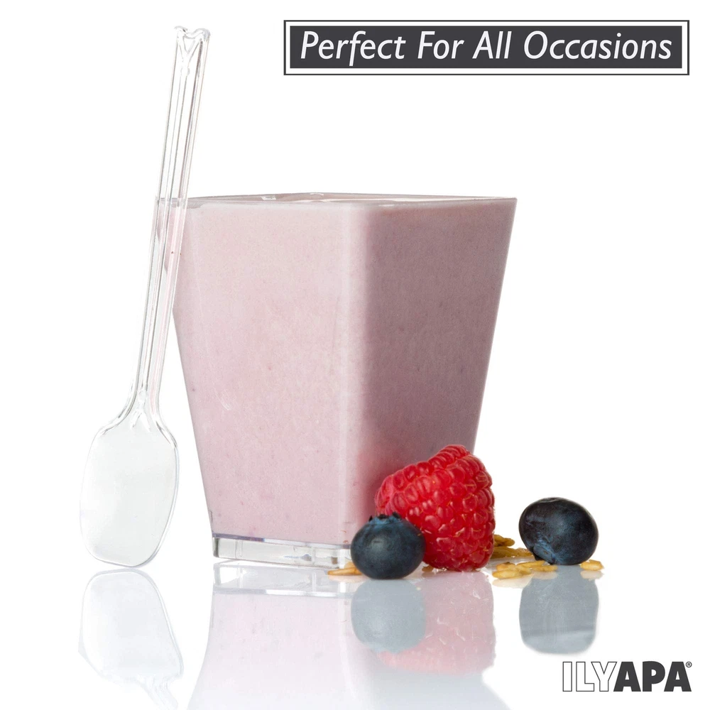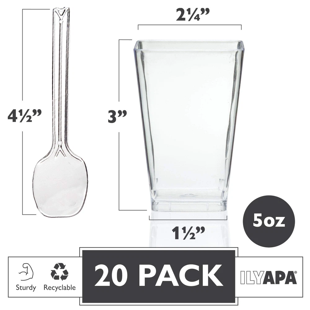 Stylish and Elegant These fashionable mini dessert cups offer a simple way to make your desserts look professional. Their sleek, modern design and crystal clear premium plastic enhance the look of any delectable dessert, hors d'oeuvres or appetizers you serve. From chocolate mousse to puddings, parfaits, jello shots, tiramisu, cheesecakes and more, these dessert shooters add a major "wow" factor to all your culinary creations. Super Easy to Use These quick, convenient 5 oz dessert samplers are perfectly sized. Ready in seconds; simply fill and serve. Our dessert shot glasses are perfect for parties, weddings, mitzvahs, engagement parties, family gatherings, BBQs, dinners, reunions, confirmations, baby showers, and more! Recyclable or Reusable Dispose of these 100% recyclable serving cups worry-free after your party, or simply wash and stack them for later events. Bon Appetit! We know you'll love 's 20 Mini Plastic Dessert Cups with Spoons. Click "Add to Cart" and order today! "clear plastic dessert cups 5 oz. dessert cups dessert in a cup mini dessert cups with plastic cup dessert 5 oz dessert cups 5 oz dessert cup mini cups for dessert dessert shot glasses dessert in a cup clear dessert cups dessert shooter cups disposable dessert cups mini dessert cups with plastic dessert cups dessert cups dessert shooters" Enhance any Occassion - With these stylish and premium dessert shooter cups! These 5oz square plastic serving cups come with 20 spoons, everything you need to serve 20 guests. These small desert cups are perfect for breakfast, brunch, appetizers, and more! Durable and Elegant - 's premium and crystal clear hard plastic shot glasses 5oz have a solid, quality feel, and stand up to the needs of your party or gathering. The best part is, once your event is over, there are no dishes to do! Simply wash and reuse them, or dispose of them! Stylish & Cost Efficient - These clear 5oz plastic dessert cups are durable, quality products that cover your event's needs for serving people at a low, economical cost. perfect for Christmas parties, holiday celebrations, banquets, weddings, birthday parties, company gatherings, and other catered events. Recyclable or Reusable - Dispose of these 5oz square 100% recyclable serving cups worry-free after your party, or simply wash and stack them for later events. Satisfaction Guaranteed - stands behind all of its products 100%. We use strong durable packaging to guarantee that your mini plastic dessert cups arrive in the best condition possible.