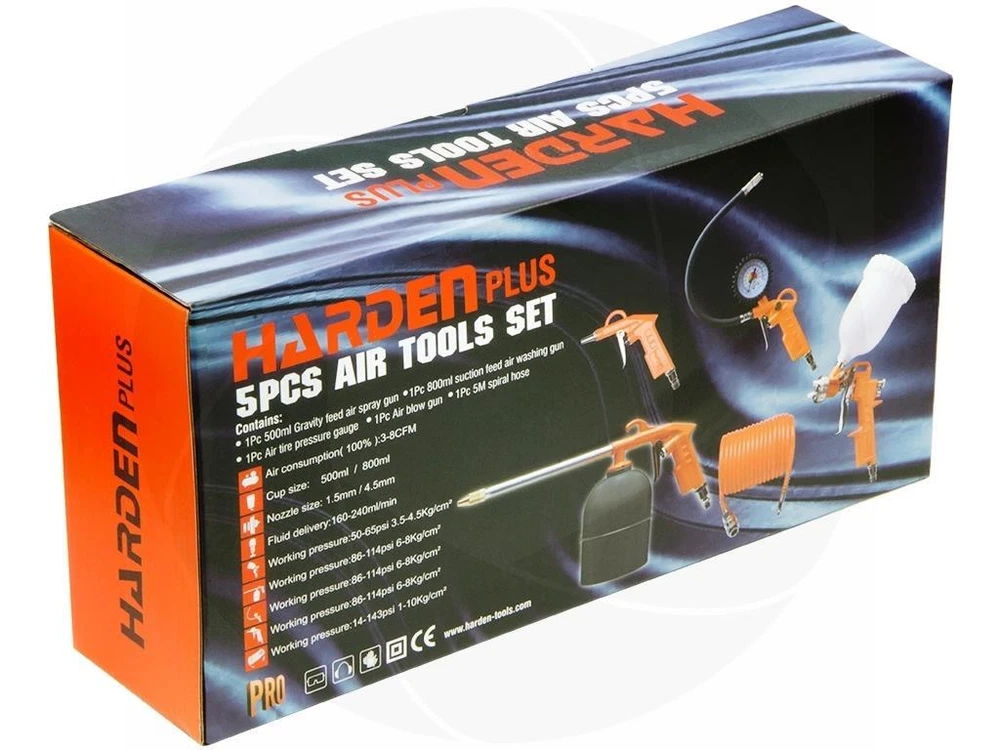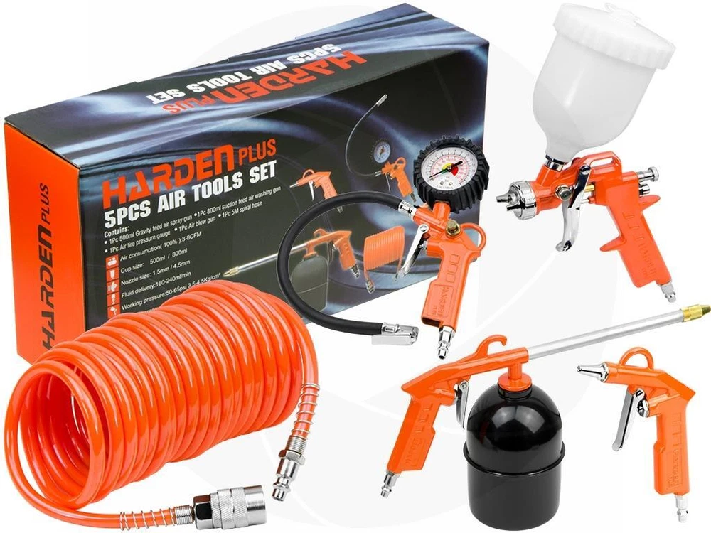This Harden five pieces air tool set consists of the most commonly used air tools. The set contains a spray gun, tire inflator with pressure gauge, air blow gun, air engine cleaning gun and a five meters PU hose. These tools are suitable for various brands of compressors that are equipped with 1/4 inch American style connector. Features: Suitable for a wide variety of jobs around the house Spray gun is for easy and smooth lacquering and applying primer application Air blow gun is suitable for spraying various liquids and cleaners, including degreasers Tire inflator with pressure gauge for easy and quick inflation of tires 0-225PSI Air nozzle for cleaning dust from the workplace, or blowing, drying water for fast drying Spiral hose increases the working range, can be used with other types of air tools Specifications: Brand: Harden Model: 681901 Air inlet size: 1/4in NPT 1/4in threaded connectors Air spray gun: 500ml, Gravity feed Air blow gun: nozzle length 20mm Air washing gun: 800ml, suction feed Air tire inflating gun: 0-16 bar and 0-225 psi Spiral air hose length: 16.4ft or 5 meters Weight: 4lbs or 1.83kg Package includes: Air spray gun Air blow gun Air washing gun Air tire inflating gun Spiral air hose Retail box Get images that make Supersized seem small. THE simple solution for eBay sellers. Track Page Views With Auctiva's Counter