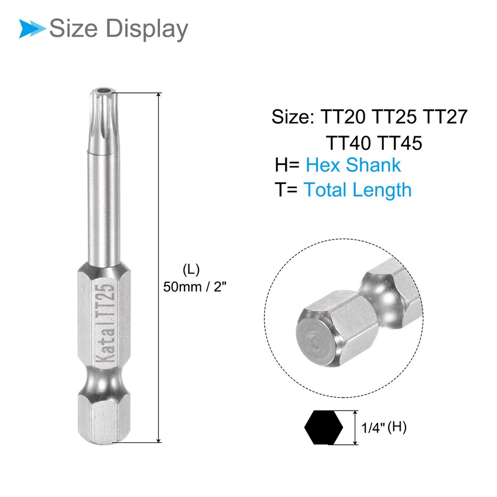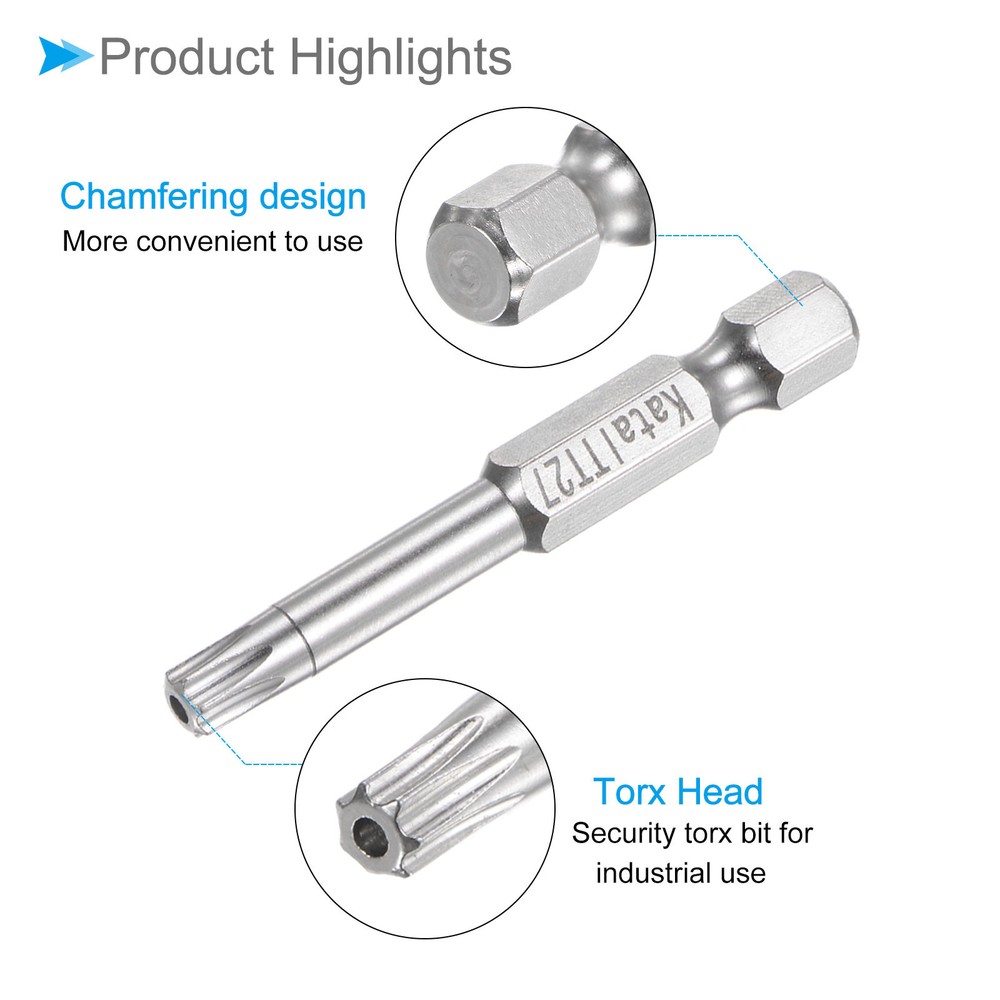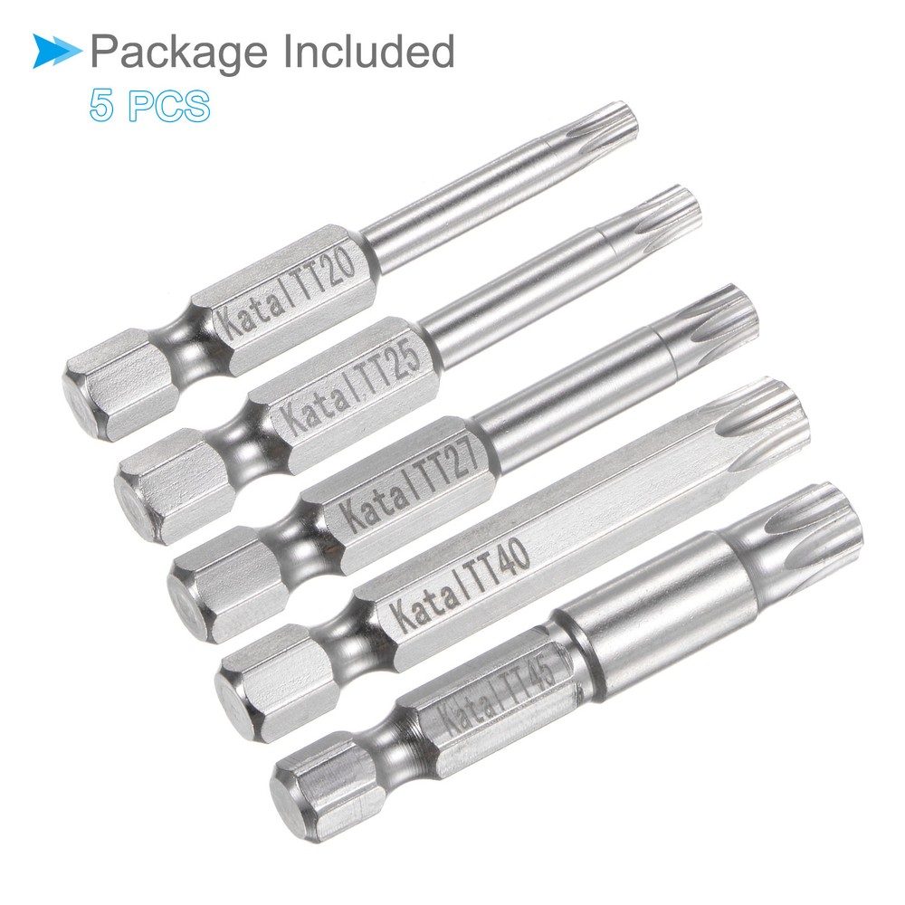 Document Attributes:* Material: S2 Alloy Steel* Size: TT20 TT25 TT27 TT40 TT45* Hex Shank: 1/4"* Total Length: 50mm / 2"What Is Included:* 5 Pieces x Magnetic Security BitApplications & Features:--- Screwdriver bits set can be used in furniture installation, car maintenance, electronic factory, office installation, kitchen installation, etc.--- The magnetic bit tip can hold the screw securely before installation and after removing the screw to improve efficiency.--- Security bits are made of S2 alloy steel, with good toughness, the surface of the security torx bit set is nickel plating treatment for good anti-rust and wear-resistant and durability, and is suitable for industrial use.Useful Tips:--- Do not turn the screws with mismatched sizes to avoid damage to both the screw and the drill. 5pcs Magnetic Star 7 Point Bits TT20-TT45 S2 Steel 7 Point Torx Screwdriver Bits Attributes: * Material: S2 Alloy Steel * Size: TT20 TT25 TT27 TT40 TT45 * Hex Shank: 1/4" * Total Length: 50mm / 2" What Is Included: * 5 Pieces x Magnetic Security Bit Applications & Features: --- Screwdriver bits set can be used in furniture installation, car maintenance, electronic factory, office installation, kitchen installation, etc. --- The magnetic bit tip can hold the screw securely before installation and after removing the screw to improve efficiency. --- Security bits are made of S2 alloy steel, with good toughness, the surface of the security torx bit set is nickel plating treatment for good anti-rust and wear-resistant and durability, and is suitable for industrial use. Useful Tips: --- Do not turn the screws with mismatched sizes to avoid damage to both the screw and the drill. Hot Item Payment 1.We accept eBay payment . 2.Payment must be received within 7 business days of auction closing. Shipping 1.We ship to your eBay or Paypal address. Please make sure your eBay and Paypal address is correct before you pay. 2.Items will be shipped within 1-3 business day when we received payment. 3.Delivery time depends on destination and other factors. Description Policy 5pcs Magnetic Star 7 Point Bits TT20-TT45 S2 Steel 7 Point Torx Screwdriver Bits Attributes: * Material: S2 Alloy Steel * Size: TT20 TT25 TT27 TT40 TT45 * Hex Shank: 1/4" * Total Length: 50mm / 2" What Is Included: * 5 Pieces x Magnetic Security Bit Applications & Features: --- Screwdriver bits set can be used in furniture installation, car maintenance, electronic factory, office installation, kitchen installation, etc. --- The magnetic bit tip can hold the screw securely before installation and after removing the screw to improve efficiency. --- Security bits are made of S2 alloy steel, with good toughness, the surface of the security torx bit set is nickel plating treatment for good anti-rust and wear-resistant and durability, and is suitable for industrial use. Useful Tips: --- Do not turn the screws with mismatched sizes to avoid damage to both the screw and the drill. Hot Item Payment 1.We accept eBay payment . 2.Payment must be received within 7 business days of auction closing. Shipping 1.We ship to your eBay or Paypal address. Please make sure your eBay and Paypal address is correct before you pay. 2.Items will be shipped within 1-3 business day when we received payment. 3.Delivery time depends on destination and other factors.