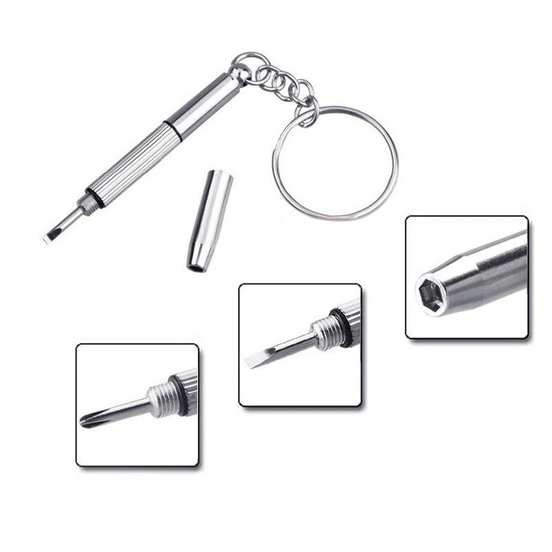 100% Brand new and high quality This multifunctional screwdriver is applied for repairing glasses and watch widely. The repair tool include: Flat head screwdriver / Phillips screwdriver / Star nut driver Can be used to repair or screw up screws for eyeglasses, sunglasses, watches, cellphones and other precise devices With a keychain, portable and easy to hang Material: Aluminum steel Total length (without Keychain): Approx. 6cm Keychain diameter: Approx. 2.3cm Package includes: 5 x Eyeglass Screwdriver Repair Kit Preview: