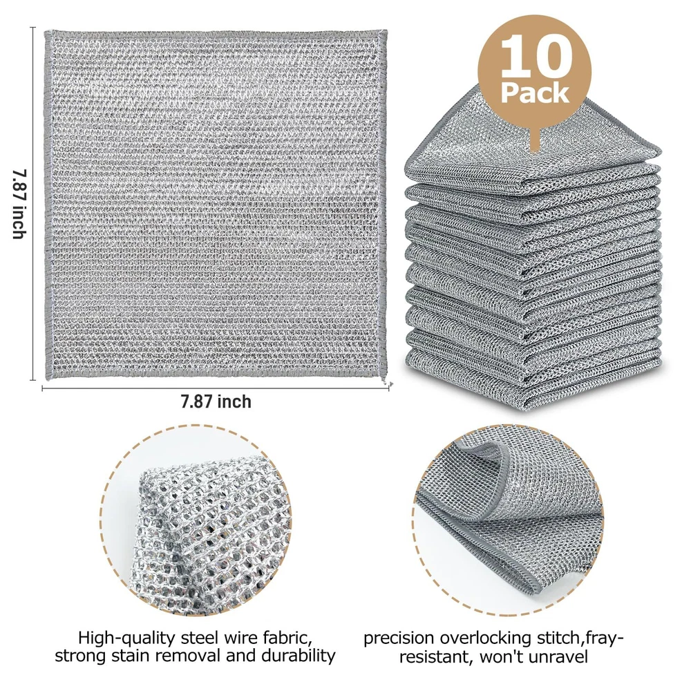 Wide range of uses: Non-scratch wire cleaning cloth for wet or dry, can be used for utensils of different materials, such as pots, bowls, plates, countertops, sinks, stoves, etc. that need to be cleaned High-quality material: This steel wire rag is made of high-quality fabric and silver mesh, with a diamond-shaped double-layered surface, more bubbles, enhanced cleaning effect, wear-resistant, will not tear, and can be reused Easy to use: Size 7.87*7.87 inches, foldable and unfoldable for use, not easy to stick to grease, will not accumulate dirt, and is very easy to clean and dry Easy care: After cleaning work, use some mild detergent, rinse and dry. Convenient for next time use After cleani good helper in the kitchen: Our products include 5 pcs or 10 pcs of multifunctional wire dishcloths, a good helper in your kitchen. If there are any problems with the product, please feel free to contact me and we will provide the best solution work, use some mild detergent, rinse and dry,onvenient for next time use