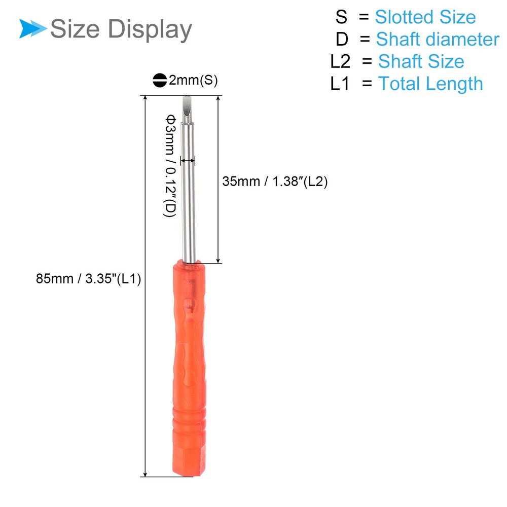 Document Attributes:* Slotted Size: 1.5mm* Shaft Size: 3mm x 35mm / 0.12" x 1.38" (D*L)* Total Length: 85mm / 3.35"What Is Included:* 5 Pieces x Mini Slotted ScrewdriverApplications & Features:--- Suitable for Eyeglasses, watches, laptops, cameras, children's toys, smoke detectors, ventilation, etc.--- The handle is made of TPR and PP material which is non-skid with flexible cap, easy and pretty comfortable to grip in hand and convenient to use for different kinds of repairs--- The precision screwdriver tips are made of good S2 steel, specially hardened with heat treatment which is more precise and sturdy than those CRV bits for long time use.Useful Tips:--- When using, do not use a screwdriver as a pry bar or chisel. 5pcs Tiny Slotted Screwdriver 2mm Flat Head Screw Driver W Non-Slip Red Grip Attributes: * Slotted Size: 1.5mm * Shaft Size: 3mm x 35mm / 0.12" x 1.38" (D*L) * Total Length: 85mm / 3.35" What Is Included: * 5 Pieces x Mini Slotted Screwdriver Applications & Features: --- Suitable for Eyeglasses, watches, laptops, cameras, children's toys, smoke detectors, ventilation, etc. --- The handle is made of TPR and PP material which is non-skid with flexible cap, easy and pretty comfortable to grip in hand and convenient to use for different kinds of repairs --- The precision screwdriver tips are made of good S2 steel, specially hardened with heat treatment which is more precise and sturdy than those CRV bits for long time use. Useful Tips: --- When using, do not use a screwdriver as a pry bar or chisel. Hot Item Payment 1.We accept eBay payment . 2.Payment must be received within 7 business days of auction closing. Shipping 1.We ship to your eBay or Paypal address. Please make sure your eBay and Paypal address is correct before you pay. 2.Items will be shipped within 1-3 business day when we received payment. 3.Delivery time depends on destination and other factors. Description Policy 5pcs Tiny Slotted Screwdriver 2mm Flat Head Screw Driver W Non-Slip Red Grip Attributes: * Slotted Size: 1.5mm * Shaft Size: 3mm x 35mm / 0.12" x 1.38" (D*L) * Total Length: 85mm / 3.35" What Is Included: * 5 Pieces x Mini Slotted Screwdriver Applications & Features: --- Suitable for Eyeglasses, watches, laptops, cameras, children's toys, smoke detectors, ventilation, etc. --- The handle is made of TPR and PP material which is non-skid with flexible cap, easy and pretty comfortable to grip in hand and convenient to use for different kinds of repairs --- The precision screwdriver tips are made of good S2 steel, specially hardened with heat treatment which is more precise and sturdy than those CRV bits for long time use. Useful Tips: --- When using, do not use a screwdriver as a pry bar or chisel. Hot Item Payment 1.We accept eBay payment . 2.Payment must be received within 7 business days of auction closing. Shipping 1.We ship to your eBay or Paypal address. Please make sure your eBay and Paypal address is correct before you pay. 2.Items will be shipped within 1-3 business day when we received payment. 3.Delivery time depends on destination and other factors.