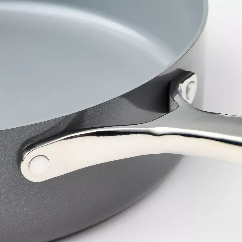 Highlights 5qt nonstick ceramic-coated sauté pan Aluminum construction is ideal for even heat distribution Smooth, nonstick surface with no PTFE or PFOA To protect nonstick cooking surface, use only with silicone, nylon or wood cooking utensils Induction, gas and electric stove compatible Oven safe up to 450 degrees F Dishwasher safe but hand washing recommended for longer product life