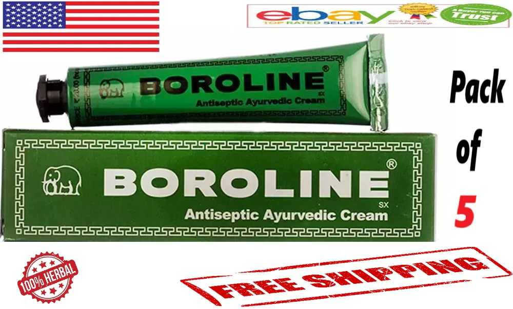5x 100% Natural Boroline Cream (20gm) Antiseptic Ayurvedic Cream (FREE SHIPPING) The name Boroline is derived from its ingredients, 'Boro' from boric powder, which has antiseptic properties, and 'oline' as a variant of the Latin word oleum, meaning oil. The cream is a combination of essential oils and waxes and its remarkable antiseptic properties are a result of boric powder and zinc oxide. This potent combination of ingredients protects the affected skin against germs and facilitates the rapid growth of epidermal cells. Key Ingredients: Boric Acid, Zinc Oxide and Anhydrous Lanolin Indications: It is indicated in cracked heals, sunburns, dry skin, and skin rashes. Key Benefits: Boroline Cream contains protective properties and it does not wear off in extremely dry and chilly conditions Boroline Cream softens rough hands and elbows It heals cracked heels, sunburns, and scars Boroline Cream protects your skin against rashes and irritation It soothes itchy skin and prevents skin infections from spreading Directions For Use: In case of deep cuts, apply Boroline when the wound is closed and dry or as directed by your healthcare professional.