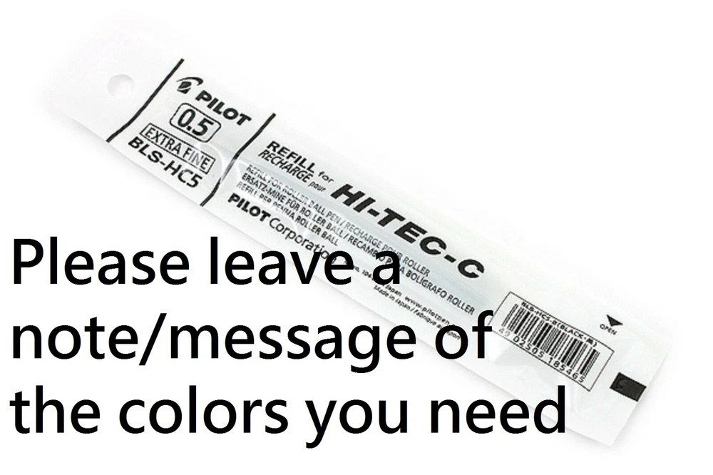 5x Pilot Hi-Tec-C 0.5mm Pen REFILLS This listing is for 0.5mm refills! BLS-HC5 4 colors are available - Black, blue, B lue -B lack and red Each set is 5 refills, you can choose any 5 colors. Made in Japan by PILOT PEN CO.LTD Pilot Hi-Tec-C pens are special pens that are currently very popular in Japan. They are highly sought after in the US, but are very difficult to find in stores. The fine tipped point of Pilot Hi-Tec-C pens allow you to write with incredible precision. Moreover the ink is chemically formulated so that it will not bleed after it dries. Hi-Tec-C fans immediately recognize the brilliant design of these pens. They are available in 0.25 mm, 0.3 mm, 0.4 mm, and 0.5mm sizes and in a variety of colors. Quick airmail delivery from Taiwan to Woldwide! Typically 6-10 working days. Smooth and fine writing with beautiful colors! Great pens for your work or study! If you have any special request, just send a message! Please check our other items when shopping! Airmail delivery from Taiwan to Worldwide For delivery estimate to your country, please see below.