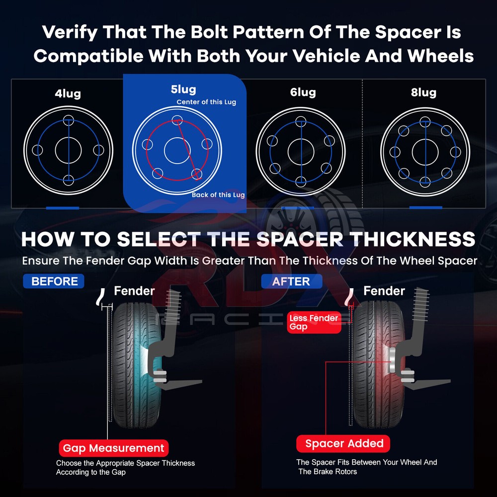 Adapter Thickness: 32mm (1.25 Inch) Each Side Quantity: 4 Pieces Bolt Pattern: 5x115 (Hub) to 5x114.3 (Wheel) Center Bore: 74mm Thread Pitch: 12mm X 1.5 Adapter Type: Bolt pattern conversion adapter (Lug centric) This adapter set includes open end lug nuts to secure the adapters onto your factory hubs Your Factory wheel studs may extend past the surface of the wheel adapters. In this case you will need to: 1. Adjust the factory studs to a shorter length. 2. Check that the wheels have open slots (cavities) between the fastener holes. 3. Replace the factory studs with a new set of shorter studs.