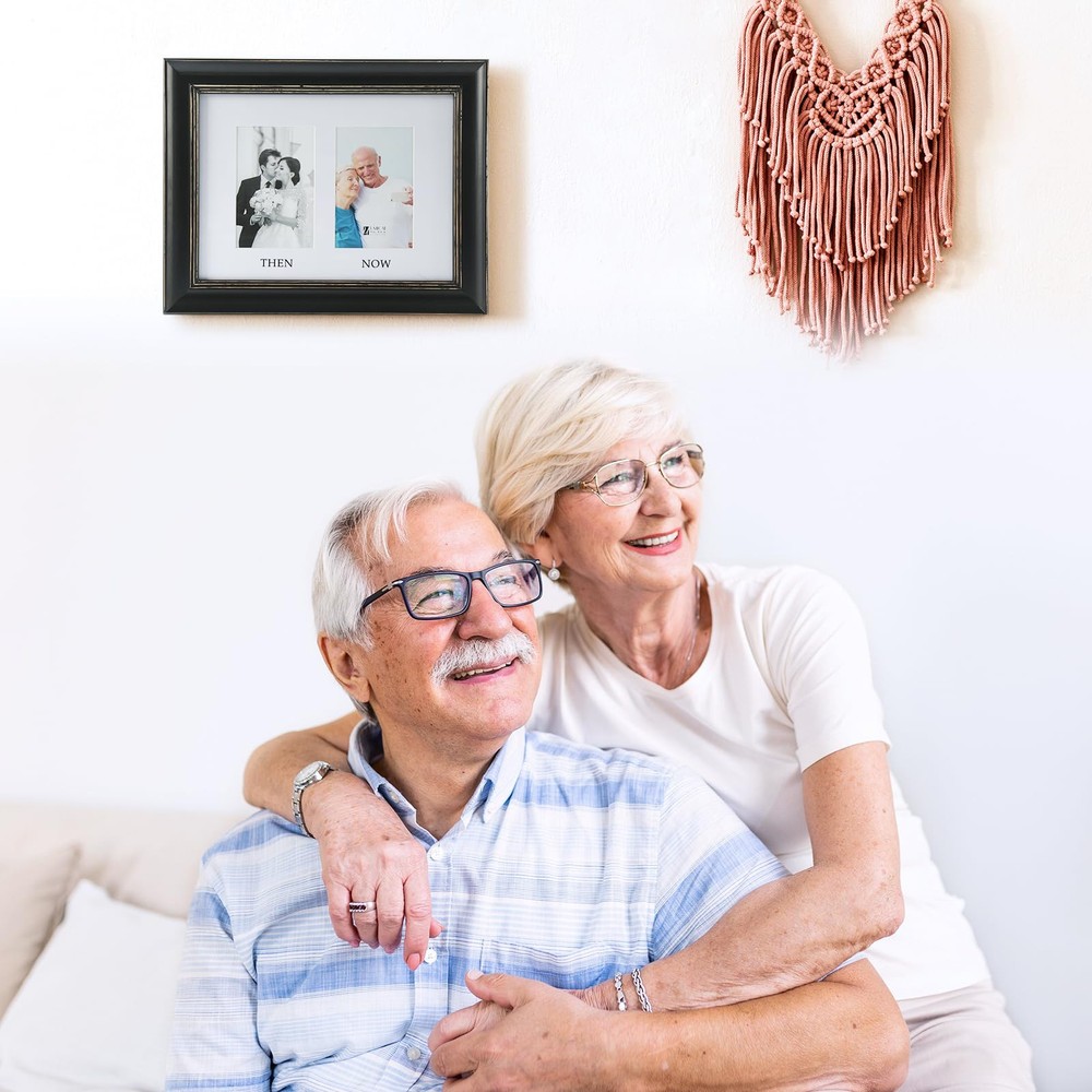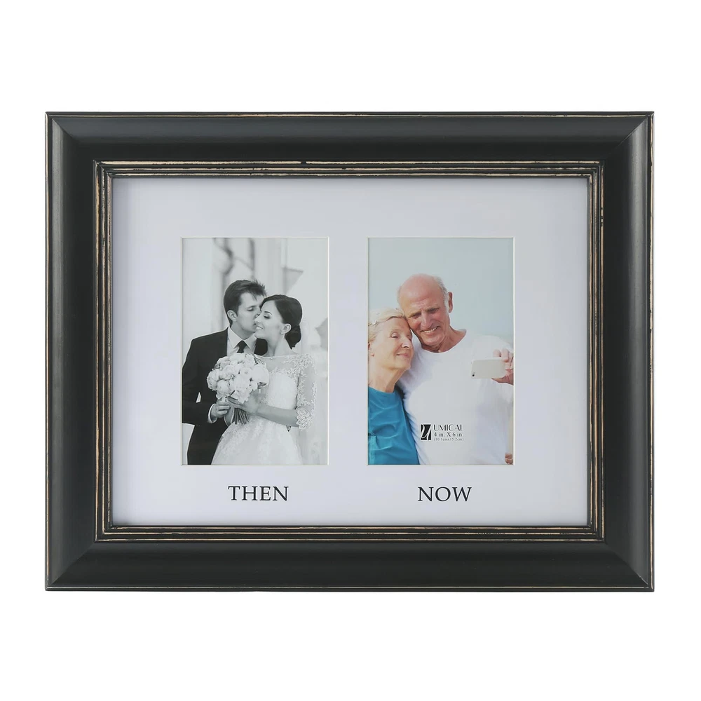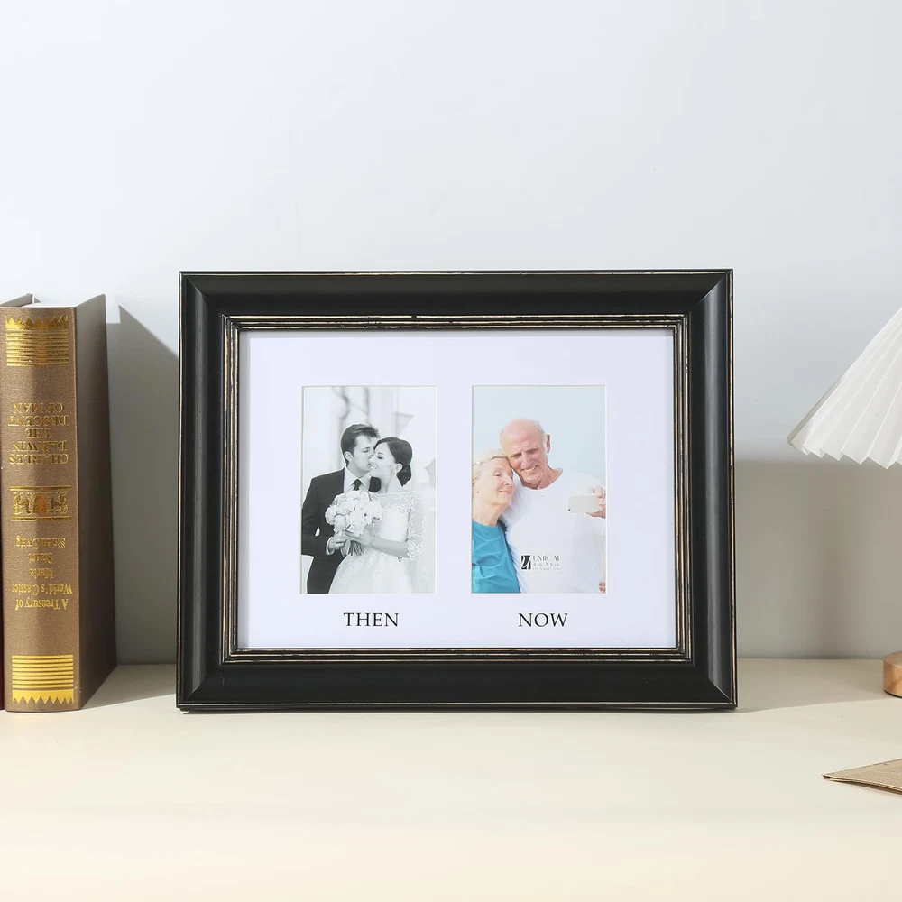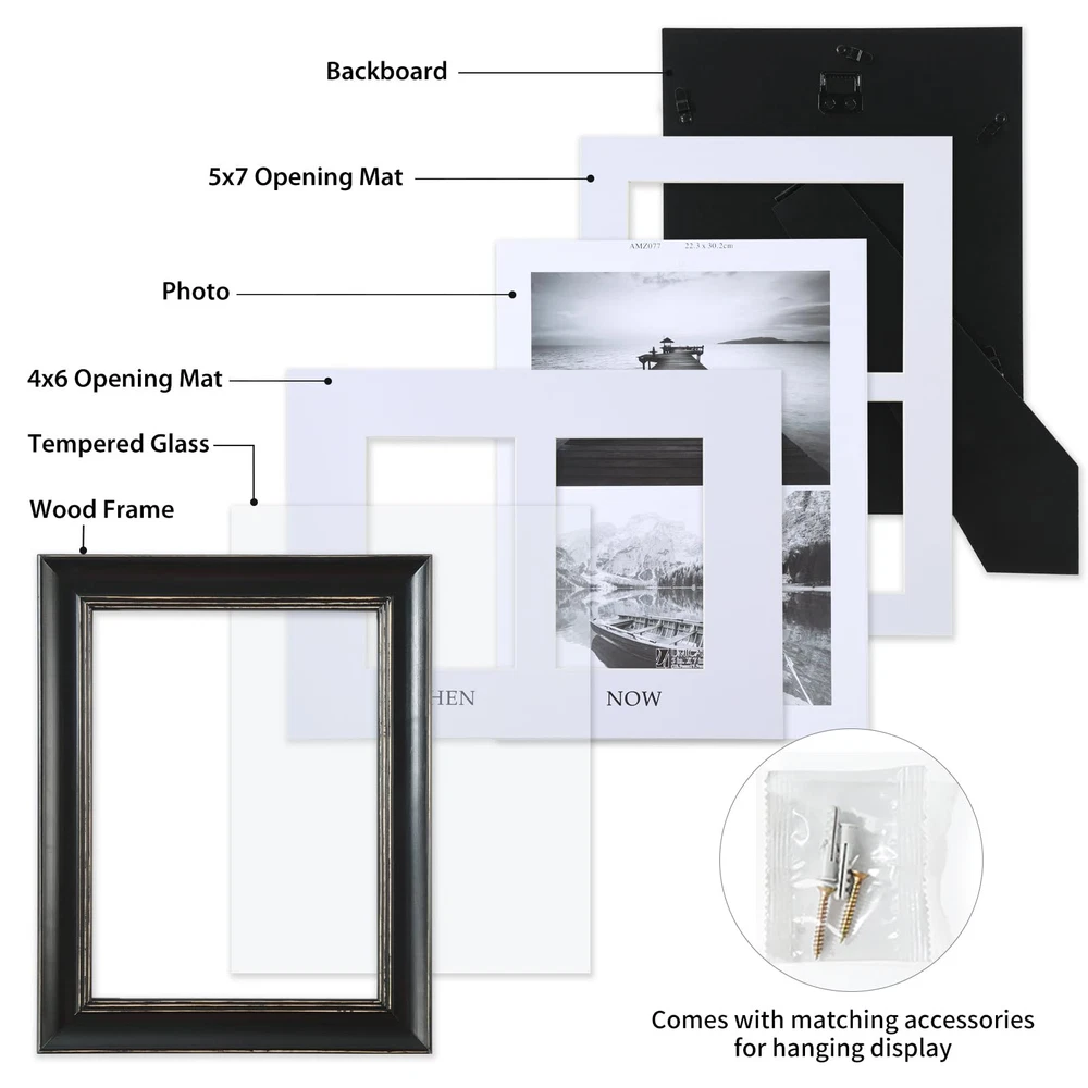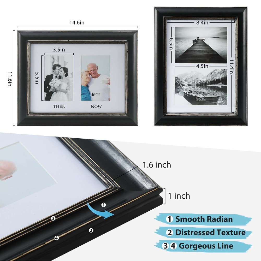 Distressed Look Picture Frame: Our vintage style 5x7 picture frames are crafted from wood and finished in a distressed finish; the wooden frame is not normal flat frames as you find in the market, but has a smooth radian for unique and vintage look; gorgeous line in black wooden frame with distressed texture shows better levels and fits any home decor. 5x7 picture frame holding the memories and perfect for self use or as a gift for family or friends on New Year or other holidays Comes With 2 Mats: 2 Mats! The frame measures 11.6”x14.6”, and 1" thick. Great value 5x7 2 opening picture frame comes with two pieces bevel cut mat to meet your different demands, one mat for displaying (2)5”x7” photos, and the other mat for (2)4”x6” THEN and NOW photo. Kindly note that the actual mat openings are 3.5x5.5 inches and 4.5x6.5 inches, that way your 4x6 and 5x7 photo doesn't fall through the opening Quality Material: Durable, gallery-style wood 2 opening 5x7 picture frames; the frame's front has a tempered glass that gives a clear view of your pictures and preserves your photographs, cards and memories; the sturdy backboard to keep the photos in place; the swivel tabs is designed to load your photos, cards, and memories easily, quickly and securely; the triangle hangers for vertical or horizontal wall hanging; the quality kickstand for tabletop or shelf standing display Protective & Decorative: Elegant look collage 5x7 photo frame works in many styles of decor and prefect for home, office and studio decoration. Suitable for decorating living room, bedroom, gallery wall, office and any space. Perfect for your photos, landscape pictures, prints, drawings, artworks, then and now photos Worry-free After-sales Service: Please understand that wood and glass item is easily damaged in transit, if that happens, please contact to us first, we will give you a satisfactory solution timely; order with confidence, click and add to cart today