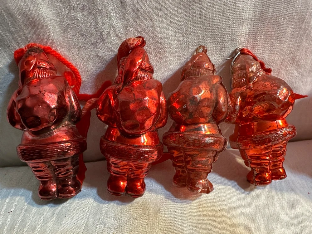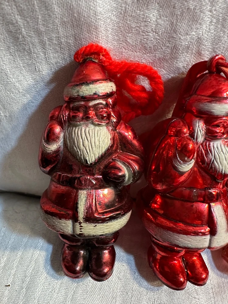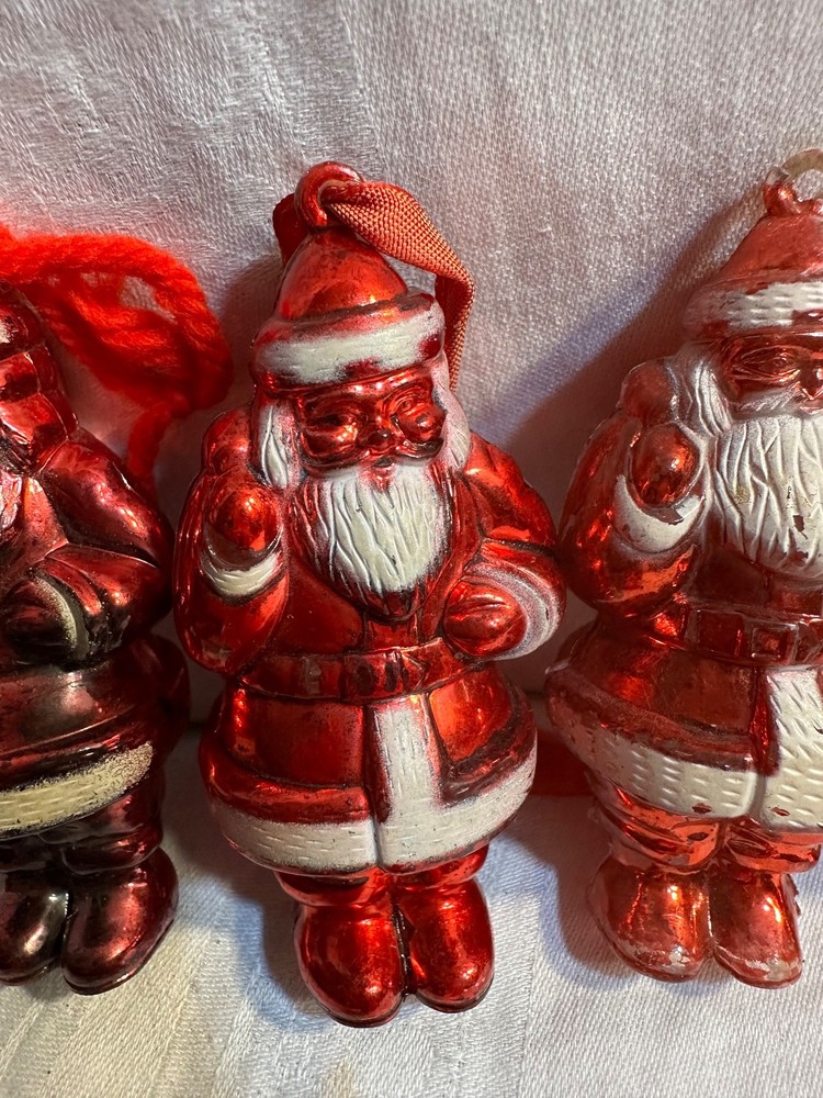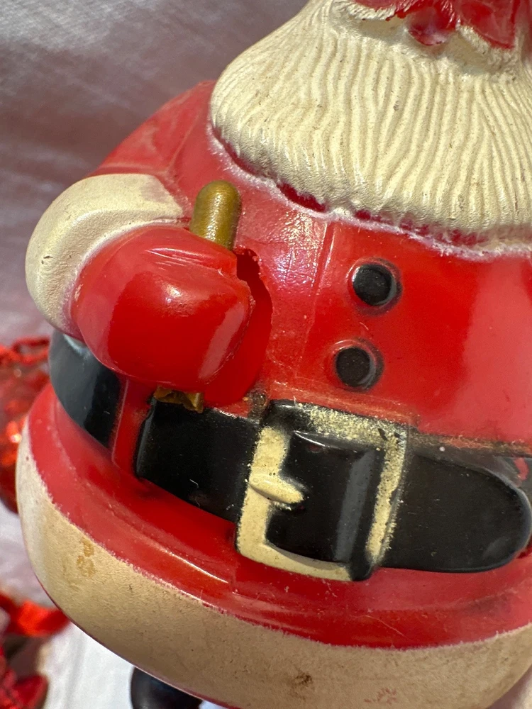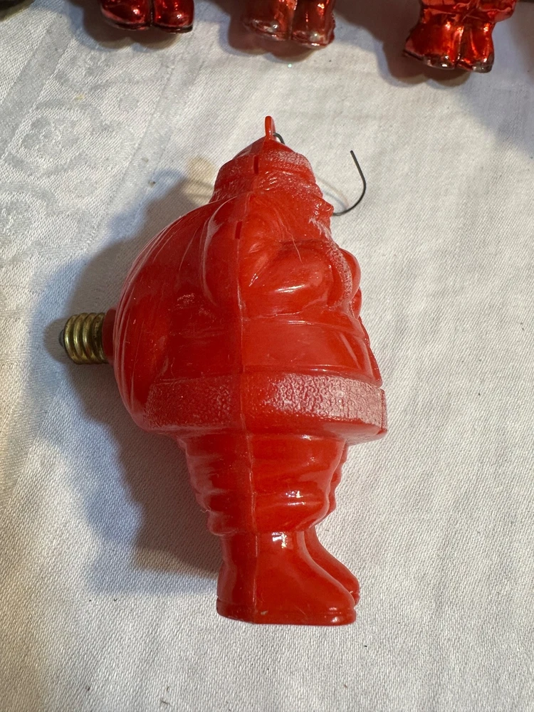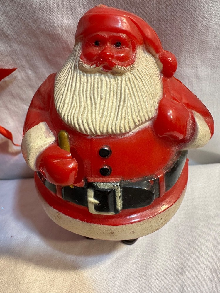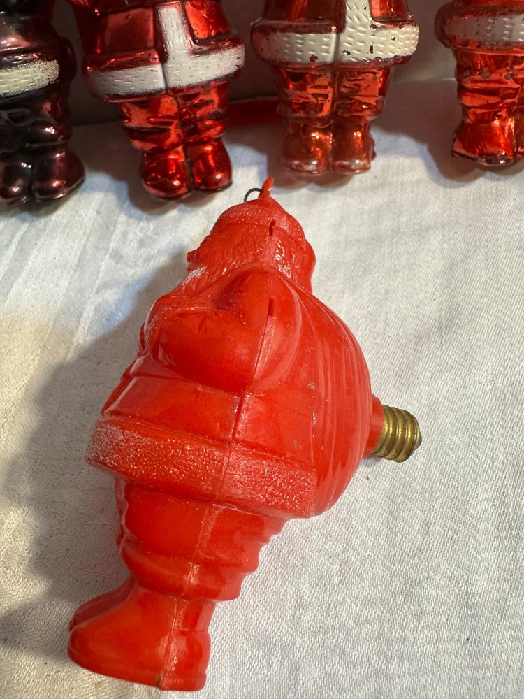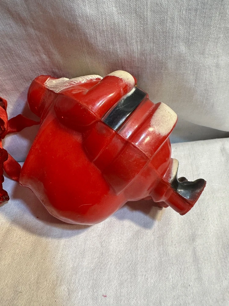This product is a collection of 6 Santa Claus memorabilia items from the 1950s, including 4 Irwin ornaments, 1 candy dish, and 1 Goodlight Santa. Made of plastic, these vintage pieces are perfect for Christmas collectors looking to add a touch of nostalgia to their holiday decor. The red color and iconic Santa designs make them a festive and charming addition to any seasonal display. Each item is a tangible piece of Christmas history from the mid-20th century, making them a special and unique find for collectors of holiday memorabilia. See photos for condition