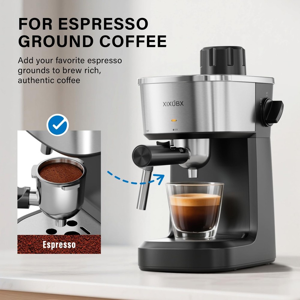 The 6Bar Espresso Machine features one-button operation for easy coffee brewing and milk frothing, ideal for beginners and enthusiasts. It delivers a quick 3-minute extraction with low-noise performance. Includes a marked cup and front indicator for clear visibility. Dual temperature control ensures stable flavor, while steam separation and auto pressure release enhance safety. The compact design fits various spaces, and the removable parts make cleaning simple. One-Button Operation: Only one button control effortlessly handles both coffee brewing and milk frothing, making it extremely user-friendly. Works perfectly with extremely fine coffee powder, suitable for users from beginners to professionals Fast Brewing & Precise Espresso: 6 bar pressure and an 800W heating system brew rich coffee in just 2 minutes. The easy-pour glass cup with clear markings ensures precise measurements, delivering fresh, authentic espresso quickly and effortlessly Powerful Functional Configuration: Bimetal temperature control keeps water steady for consistent coffee. Steam-water separation prevents dilution, ensuring rich flavor. The steam wand creates creamy milk foam for lattes, cappuccinos, and more Compact & Premium Design: Measuring 12.99”×9.06”×6.69”, this compact espresso machine fits kitchens, offices, apartments, or small countertops. The stainless steel cup warmer preheats cups to keep coffee hotter longer, enhancing the drinking experience Automatic Pressure Relief: After brewing, leftover pressure is automatically released, preventing sudden bursts of hot steam or water when opening or removing parts. This protects internal components, extends machine lifespan, and ensures safe, worry-free use. Easy Cleaning & Safety Features: Detachable drip tray and steam wand head make cleaning simple. Equipped with a high-temperature fuse and automatic shut-off for water shortage. Overfilled water drains from the brewing head to prevent excess pressure Usage Tip: If you have any questions about using this product, please feel free to ! Please read the product manual carefully before using the coffee machine. You can click to visit the or the product description section to watch more instructional videos