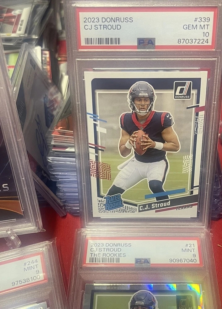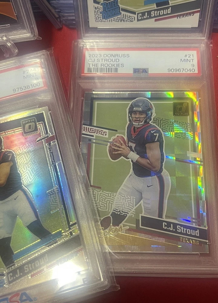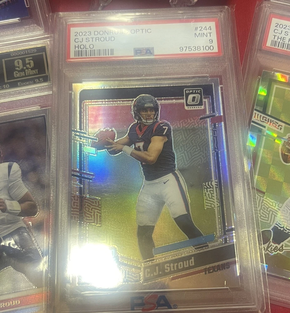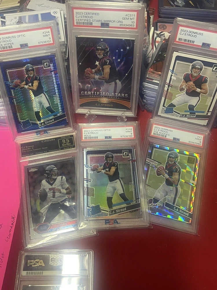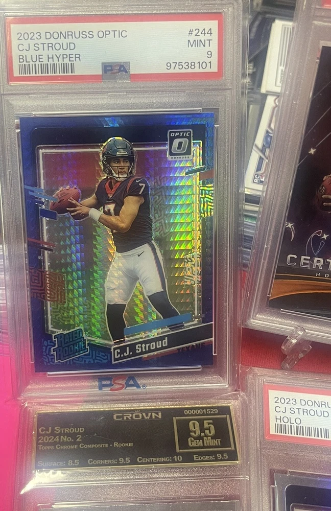 This product is a lot of six NFL football cards featuring C.J. Stroud, a rookie player for the Houston Texans. The cards are manufactured by Panini and are original, short print, and serial numbered. They are part of the base set, collectors edition, and have a parallel and insert feature. The cards are graded PSA GEM MT 10/9 and are in standard size. There is 1 crown 9.5 2024 cj card as well in the lot as you can see in the pictures. The league is the National Football League (NFL) and the season is 2023. The cards are made in the United States and are not autographed.