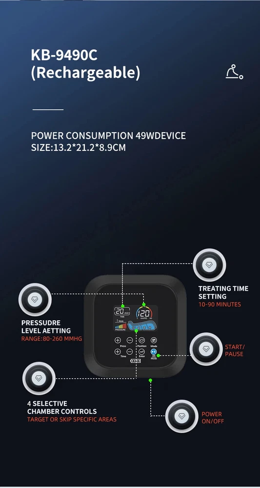 Details Images 1. ODM and OEM service available. 2. Factory direct price , competitive for distributor. 3. Professional pressure therapy apparatus supplier. 4. Quality gurantee: All Items Are Returnable and Exchangeable. 5. The top TPU materail for sleeves. 6. Pump silent operation with extreme low noise. 7. Portable and easy for home use, Mini Massager. 8. Elegant touch panel easy operation and direct view. 9. Factory ISO13485 certified, TUV CE approved. Our Advantages