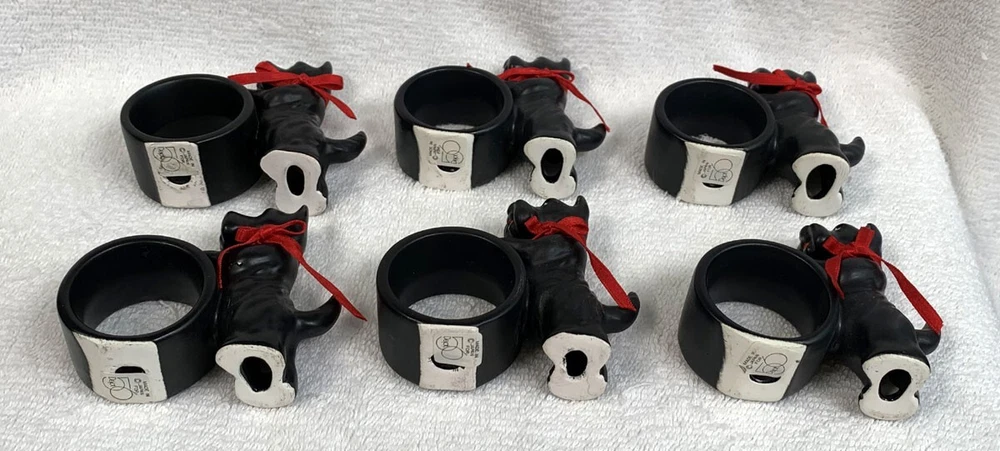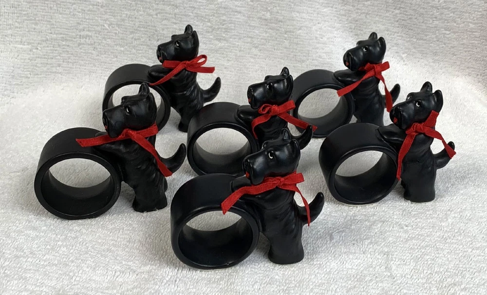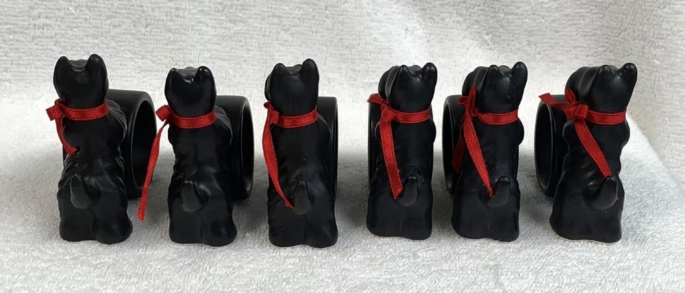 6 preowned Dept 56 napkin rings Ceramic Black Scottie dogs with a red ribbon around the neck The dog stands 3" tall No damage