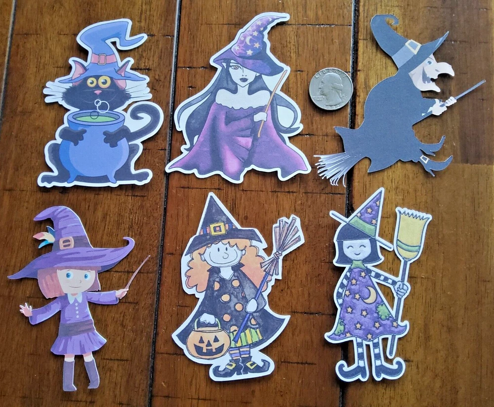 6 Beautiful Halloween Witch Designs Die Cut Card Toppers - Lot 10Ae Made on cardstock. Size of each design is 4 inches. These will be a great addition to your crafting supplies. I also have several listings of ready-made greeting card sets and lots if you would care to check those out. **Shipping next business day by Ebay letter .** Additional sets purchased at the same time will ship for $1 each. Thanks for looking.