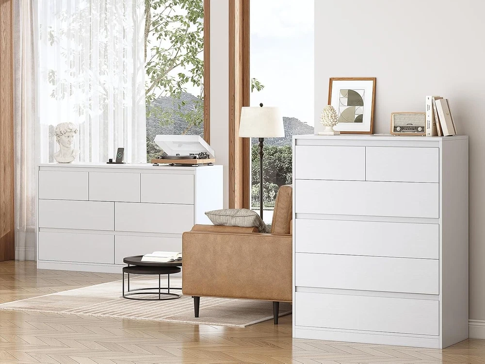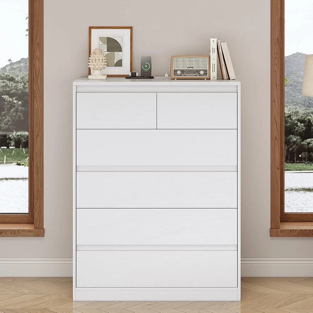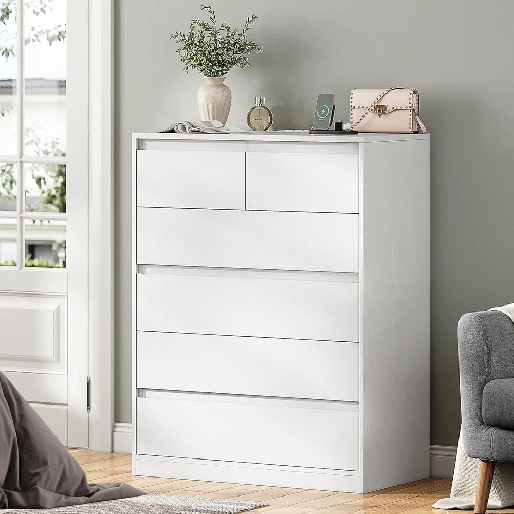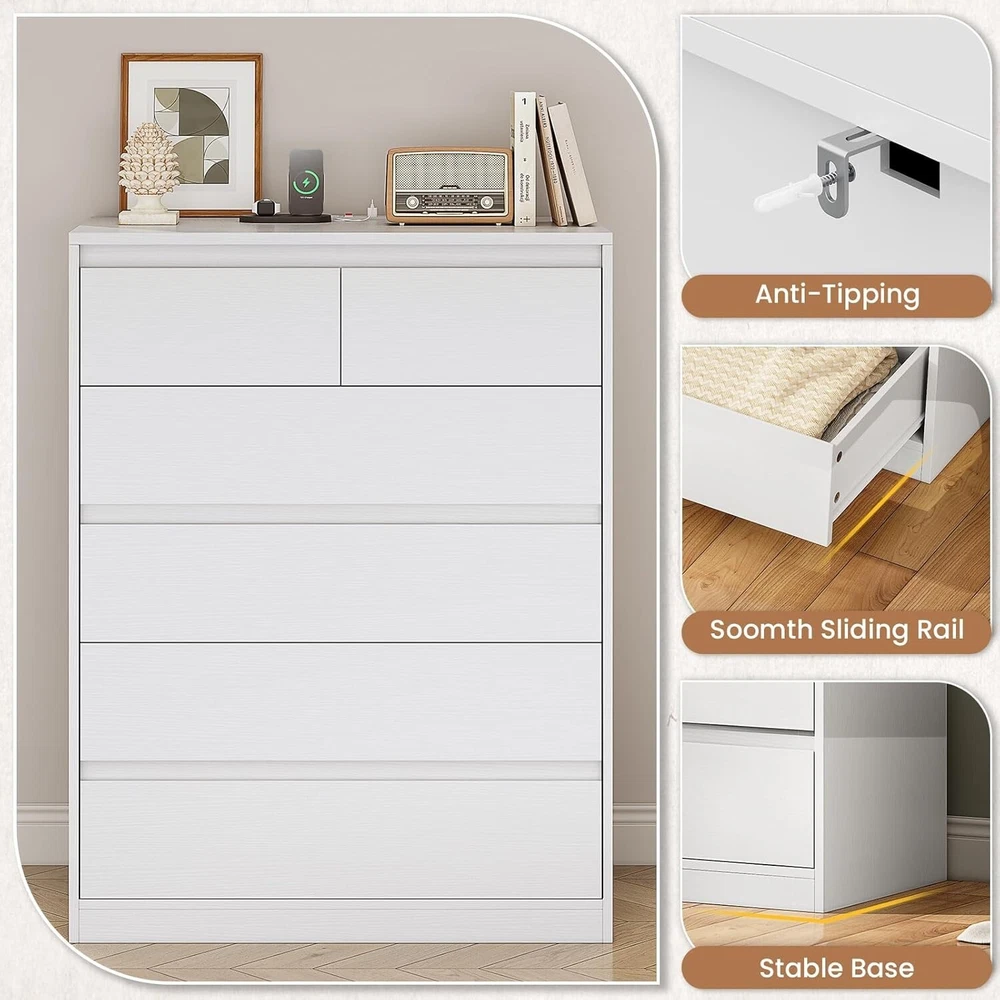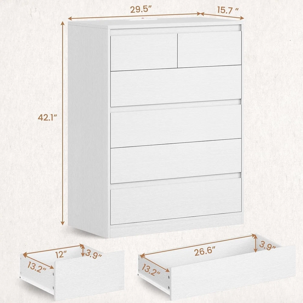 Product Description The white dresser is simple and modern in design. The simple modern style dresser is suitable for any room decor,making your bedroom or office looks more tidy and brighter.Besides, the chest of drawers comes with handle free design and a fashionable base that is both beauty and durable. The 6 drawer dresser is made of MDF to ensure stability and durability. The thickened table top and the dresser bottom can load up heavier weight. The carefully crafted design ensures long service time. The chest of drawers comes with an anti-tipping device to ensure stability and safety. The tall dressers for bedroom with 4 big drawers and 2 small drawers, providing powerful storage space to meet your organize needs. You can sort and organize your underwear, clothes, socks, toys, books, etc. You can use it to place books in the living room, or store office documents in the office. The tall dressers for bedroom with 4 big drawers and 2 small drawers, providing powerful storage space to meet your organize needs. You can sort and organize your underwear, clothes, socks, toys, books, etc. The dresser is both pretty and practical makes your room more clean and tidy.
