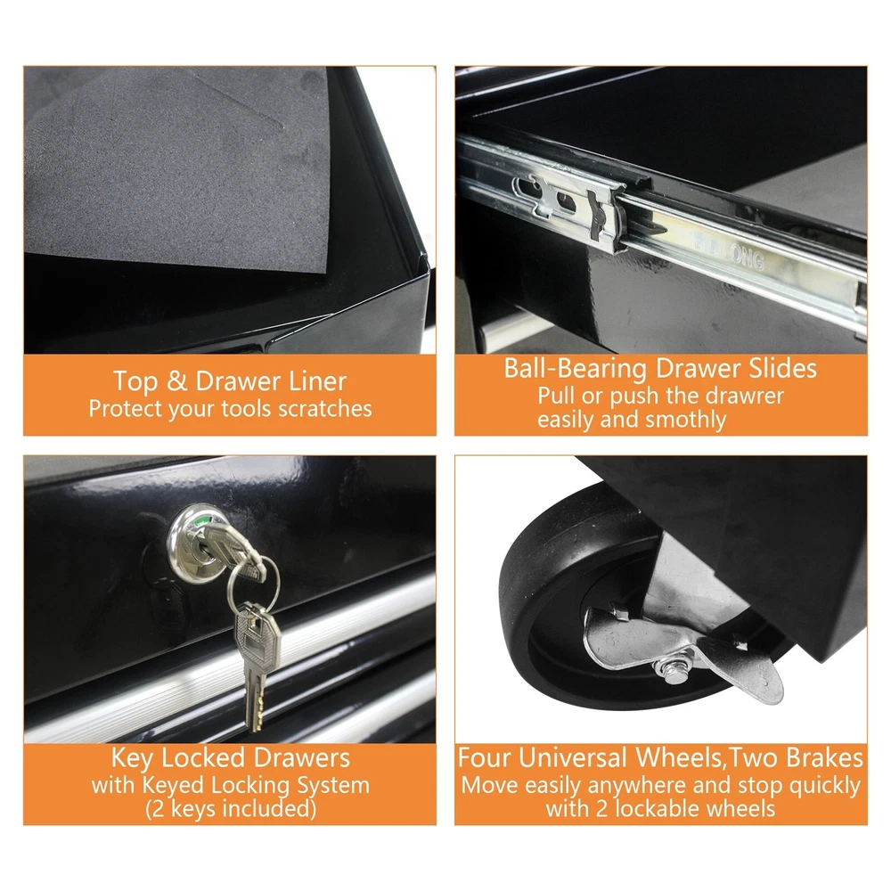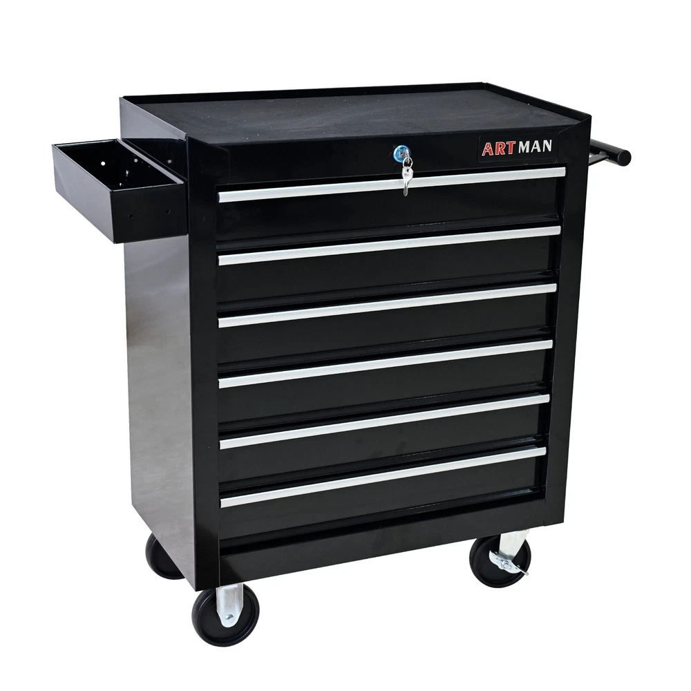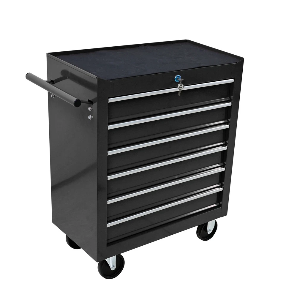 Package Size Length (in.): 26.37 Width (in.): 14.76 Height (in.): 27.95 Weight (lbs.): 57.09 Product Features 6 Drawers multifunctional tool cart with wheels The tool box is also lockable and can be used as a removable, attachable and mobile case The opening and closing of the drawers of the tool cabinet is very gentle thanks to the ball-bearing drawers The robust and powder-coated steel construction is used for high wear resistance. This assembly trolley has 4 steering wheels, 2 of which with parking brakes, so you can move the trolley freely in the garage, but also stop in one place Description Top&Drawer Liner Protect your tools scratches Ball-Bearing Drawer Slides Pull or push the drawer easily and smothly Key Locked Drawers With keyed locking system(2 keys in included) Flour Universal Wheels,Two Brakes Move easily anywhere and stop quickly with 2 lockable wheels Product Information Proudct Name 6 Drawers Workshop Tool Trolley Material Cold Rolled Steel Surface Finish Powder Coating Powder Coating 4" Casters (2PCS with brake and 2PCS without brake) Size 615*330*745 Drawers Dimension 540*300*85 Package Size 670*375*725 Color Black Net Weight 24KG Gross Weight 26KG