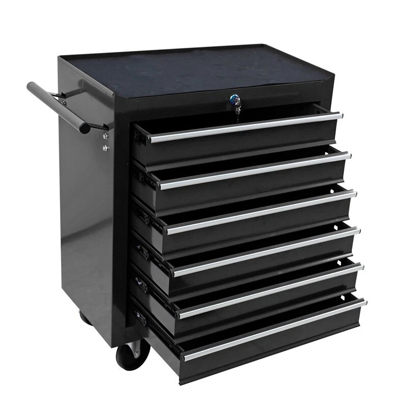 6 Drawers Tool Cart Workshop Rolling Tool Box Chest Storage Cabinet w/Lock & Key Features and Details: 6 Drawers multifunctional tool cart with wheels The tool box is also lockable and can be used as a removable, attachable and mobile case The opening and closing of the drawers of the tool cabinet is very gentle thanks to the ball-bearing drawers The robust and powder-coated steel construction is used for high wear resistance. This assembly trolley has 4 steering wheels, 2 of which with parking brakes, so you can move the trolley freely in the garage, but also stop in one place Specification: Color: Black Material:Cold Rolled Steel Product Dimensions:24.25"L12.99"W29.33"H Surface Finish :Powder Coating Powder Coating:4" Casters (2PCS with brake and 2PCS without brake) Drawers Dimension : 540*300*85 Weight (lbs.): 48.50