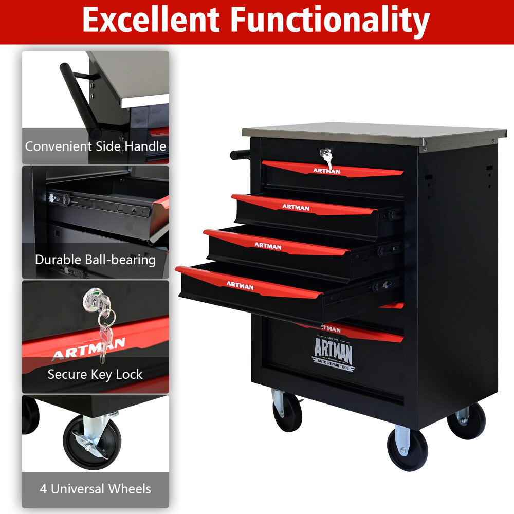 6 drawers with wheels multi-purpose tool car, black and blue color with more durable The tool box is also lockable and can be used as a removable, attachable and mobile case The opening and closing of the drawers of the tool cabinet is very gentle thanks to the ball-bearing drawers The robust and powder-coated steel construction is used for high wear resistance. This assembly trolley has 4 steering wheels, 2 of which with parking brakes, so you can move the trolley freely in the garage, but also stop in one place This is a set of cabinets, can use a round hook at the bottom of the table to connect another tool car, thus forming a combination.Description Smooth steel countertops are cleaner and more durable. 4 Universal Wheels With swivel casters could maneuver easily around work area. The wheels have locking mechanisms to prevent the tool cabinet from moving around on its own while in use. One Side with Pull Handle This product comes with a handle on one side, which not only helps to push and pull it more, but allows you to move it more freely Drawer Slides 15KG loading capacity ball bearing slide With Key Locking Protecting the tools and items stored inside Product Information Proudct Name 6 Drawers Workshop Tool Trolley Material Cold Rolled Steel Surface Finish Powder Coating Powder Coating 4" Casters (2PCS with brake and 2PCS without brake) Product Size (with wheels and countertops) 22.28*13.58*30.71INCH Product Size (without wheels and countertops) 20.63*12.99*25.16INCH Package Size 23.31*15.35*28.66INCH Color Black+Red Net Weight 54.90LBS Gross Weight 59.30LBS On Feb 3, 2025 at 18:57:44 PST, seller added the following information: