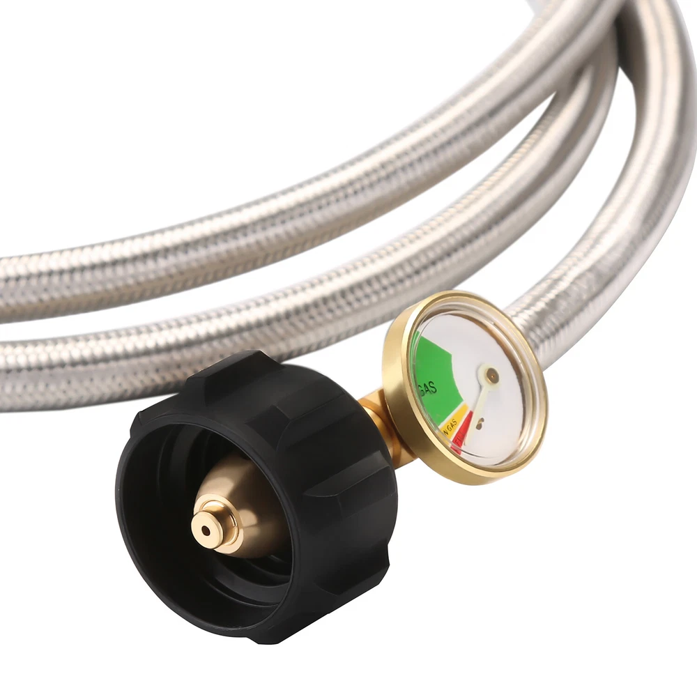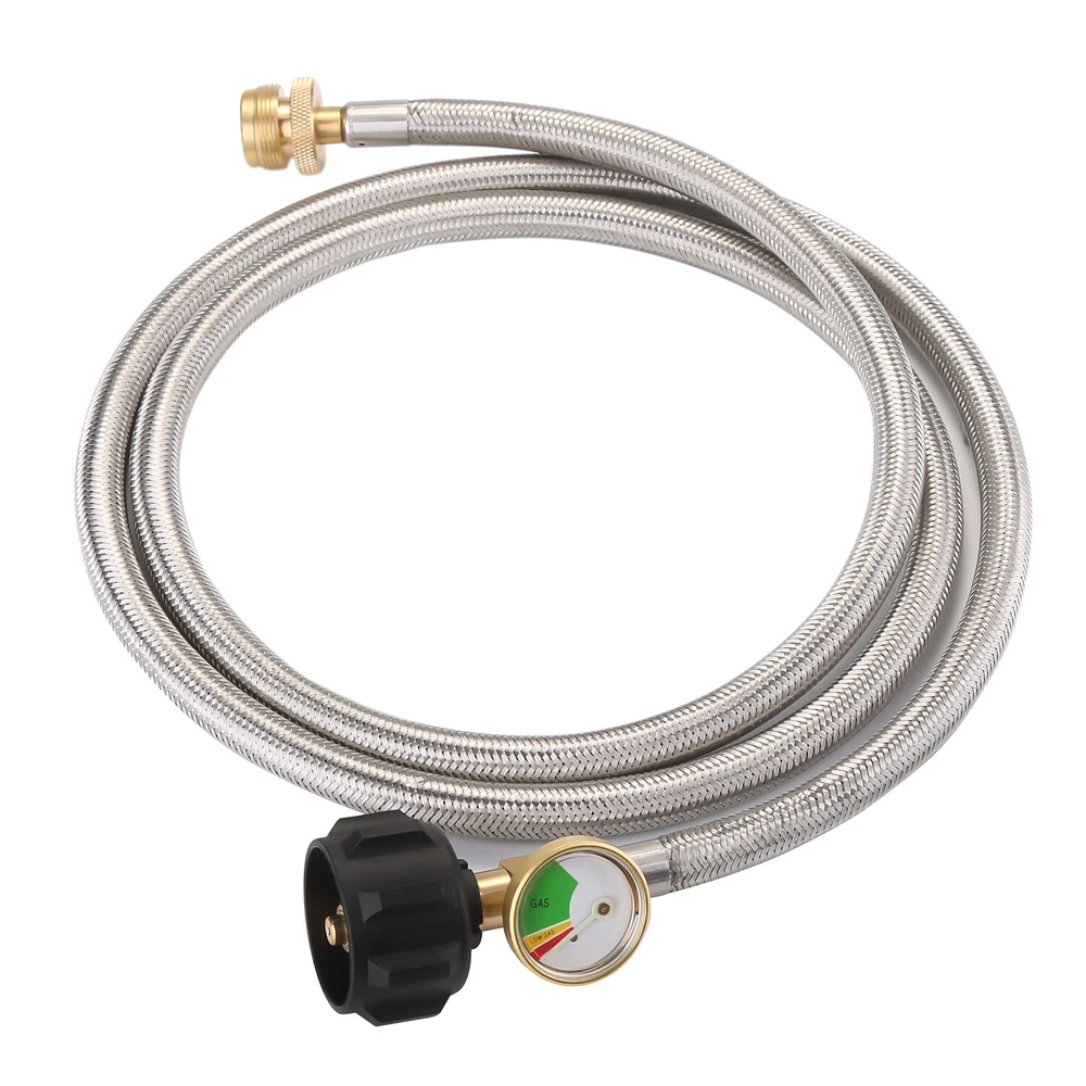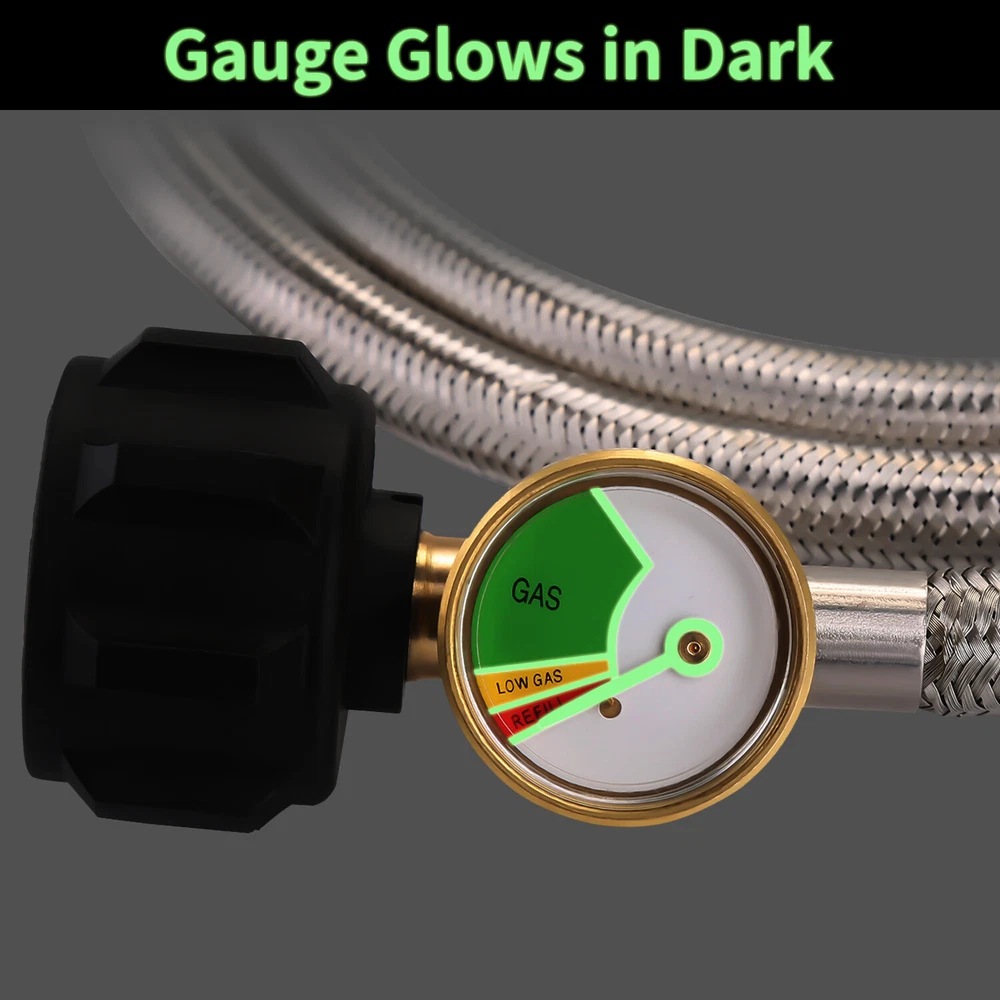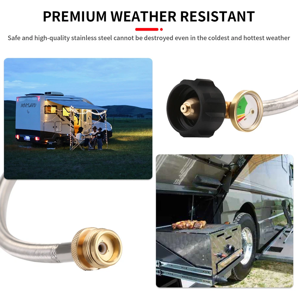6 FT Stainless Steel Braided Propane Adapter Hose with Propane Tank Gauge, 1 lb to 20 lb Conver ter for QCC1 / Type1 LP Tank to 1 LB Propane Stove, Tabletop Grill and More 1lb Portable Appliance Good Quality Material : 6 FT Propane adapter hose made of durable stainless steel braided with good anti corrosion & heat-resistance. Durable solid brass provide secured connections between appliance and tank. Wide Range of Application : Used for weber Q gas grill, Coleman camp stove, Buddy heater, portable heater,portable grill, tabletop grill and more 1lb portable appliance. Suitable for camping, tailgating, heating needs or having an outdoor cookout. Easy to Install: No tools required, equipped with hand-tighten hand wheel. Fits for Type1(QCC 1) propane bulk tanks and cylinders connections. Compitable: This 6ft stainless braided propane hose adapter with gauge is used to hook 1lb portable appliance to 5-40lb LP tank. Not only 1lb tank any more. One side connect to Acme nut(QCC1/Type1),the other side connect to male cylinder thread (1lb connection). Safety: Propane hose with gauge is CSA certificate to ensure air tightness and stability. Propane Tank Gauge helps you read and monitor the gas levels clearly and easily, and detect the dangerous leaks. Product Specification: Material: Stainless steel braided Length: 6 feet /72 inch Gas type: LP/LPG Inlet Pressure: 25-250PSI Apply to: outdoor heater, portable grill, propane stove , lantern and more. Warning!!! For your safety all Propane Appliances like gas grills, lanterns, heaters and stoves are Outdoor Use. Fully tightened at both propane tank side and grill side before using on your propane appliances to prevent leakage. Contact us We can be contacted at any time through eBay messages if you have any questions, comments or product requests. We will respond to you within 24 hours and do our best to help you out! We encourage our customers to contact us with any questions or concerns! We'd like to be sure you are completely satisfied with your purchase. Free & Fast Shipping All products in our store are shipped from the US warehouse and you don't need to pay any shipping fees! Free Return If you need to return the item you purchased, we will provide you with a shipping label.