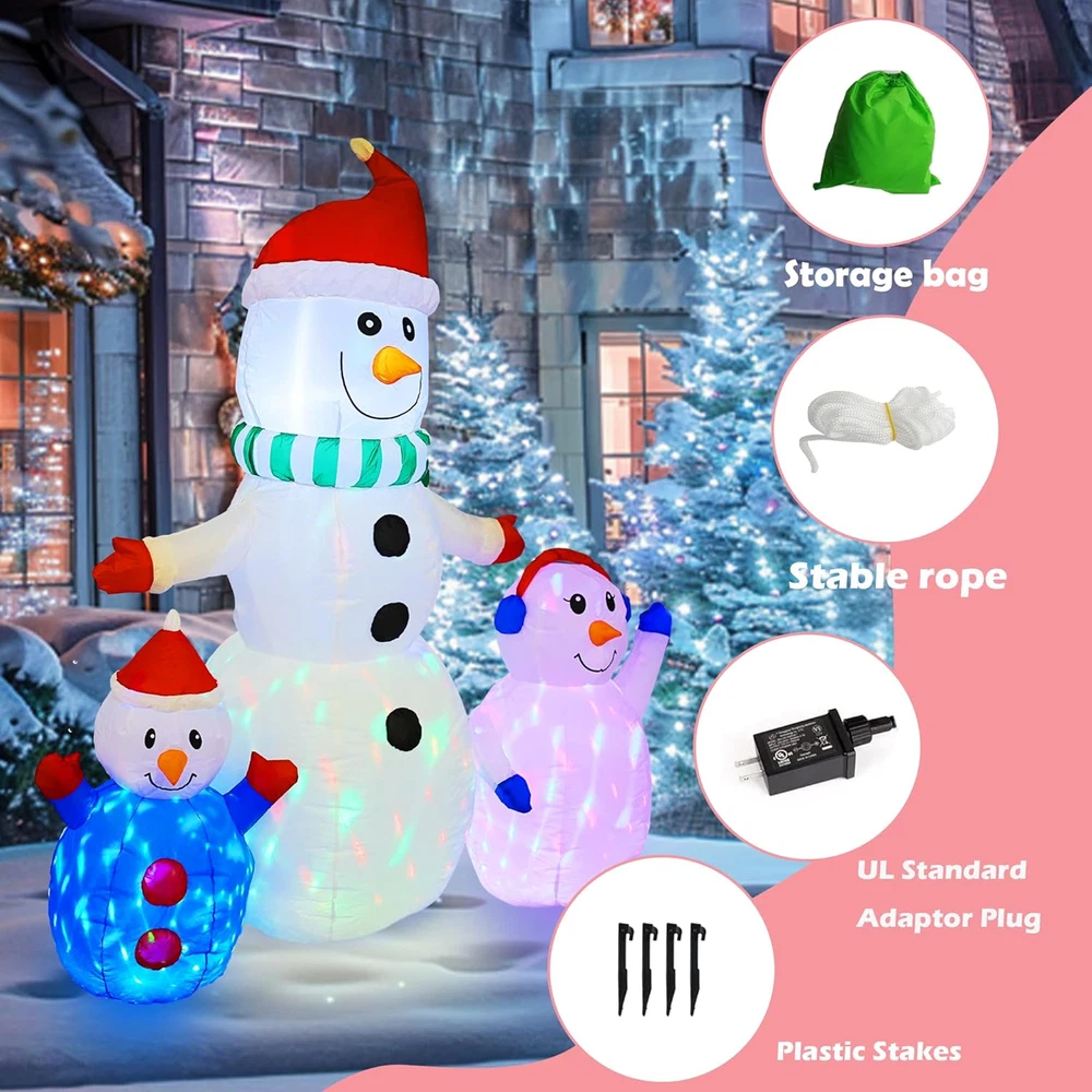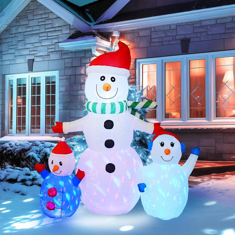 Store New Arrivals Add to Favorite View Feedback Contact Fast deliveries to the customer's home Quality customer service John Make the customers happy! 6 FT Christmas Inflatable Snowman Outdoor Decorations, Blow up Snowman Built-In Colorful Rotating LED, Waterproof Christmas Decoration for Yard Garden Lawn Xmas Holiday Decor Description Warm Embrace Design: Our trio of inflatable snowmen exudes a welcoming charm with outstretched arms, as if offering a warm hug. The base is adorned with rotating LED lights that cast a beautiful glow, enhancing the snowman's presence and making the night view enchanting. Colorful Rotating LED Lights: The interior of the inflatable snowman houses bright, colorful LED lights that create a mesmerizing atmosphere, especially during the evening hours. The lights dance around the snowman, evoking a sense of wonder and magic. Robust and Secure: Equipped with built-in 4 stakes and 2 tethers, our inflatable snowman is designed for stability and ground security. Crafted from high-strength, waterproof polyester that resists fading, it stands up to light rain and is suitable for both indoor and outdoor festivities. Effortless and Safe Inflation: Our snowman comes with a powerful built-in blower for quick inflation. Simply zip up the closure at the bottom, connect it to a power source, and watch as the inflatable expands to full size in under a minute, ensuring a safe and user-friendly experience. Ultimate Christmas Charm: This inflatable snowman is the epitome of winter joy and the quintessential outdoor Christmas decoration. It's perfect for adorning gardens, yards, and indoor spaces, creating a festive atmosphere that brings happiness and warmth to the holiday season. Product Description The video showcases the product in use. The video guides you through product setup. The video compares multiple products. The video shows the product being unpacked. Whimsical Design Trio of snowmen with welcoming outstretched arms. LED Light Base Adorned with rotating LED lights for a beautiful nighttime glow. Durable Material Crafted from high-strength, waterproof polyester that resists fading and is suitable for light rain. 1 Whimsical Design 2 LED Light Base 3 Durable Material Warm Embrace Inflatable Snowmen Our Inflatable Snowmen Trio brings a warm embrace to your Christmas decor, standing ready with outstretched arms to welcome friends and family. This charming group creates an enchanting night view with their rotating LED lights, perfect for spreading holiday cheer. Perfect for gardens, yards, and indoor spaces. Brings happiness and warmth to the holiday season with its iconic winter joy. MERRY CHRISTMAS Add to Cart Add to Cart Add to Cart Add to Cart Customer Reviews 4.3 out of 5 stars 1,038 3.9 out of 5 stars 296 3.4 out of 5 stars 285 3.9 out of 5 stars 296 4.1 out of 5 stars 284 4.2 out of 5 stars 15 4.5 out of 5 stars 225 Price $24.99 $ 24 . 99 $39.99 $ 39 . 99 $39.99 $ 39 . 99 $105.99 $ 105 . 99 $23.99 $ 23 . 99 $49.99 $ 49 . 99 $20.79 $ 20 . 79 Size 7.5" x7.5" x7.1"(Large) 20.5"L x 9"W x 29.5"H 24"L x 6"W x 16"H 24 "L x 9.7"W x 52"H 7.5" x7.5" x7.1"(Large) 6 FT 16.9"H x 10.8"W Power Supply Plug In Plug In Plug In Plug In Plug In Adapter / Lights ✔ ✔ ✔ ✔ ✔ ✔ ✘ Waterproof ✔ ✔ ✔ ✔ ✔ ✔ ✔ Outdoor ✔ ✔ ✔ ✔ ✔ ✔ ✔ Item Dimensions 3 x 4 x 5 inches Color White Light Color Multicolored Material Polyester Material Type Polyester Theme Christmas Occasion Christmas Additional Features Lighted ABOUT US We offer the best prices around on high quality products. Our E-store includes media such as books, movies, music and games while offering electronics, toys, sporting apparel, clothing, tools, general home, garden items and more. SHIPPING We are always working hard to ensure your package arrives as soon as possible. Please understand that some factors like weather, high postal traffic, and the performance of shipping companies are outside of our control. We offer free shipping to the lower 48 states and ship within 2 business days of payment, usually sooner. We do not accept P.O. Boxes. Please provide a physical address. For shipping outside of the continental USA, we only use eBay's Global Shipping Program. The item is shipped to KY and then sent to the rest of the world. International customers are responsible for all duties and taxes. Continue to 'check out' to calculate costs for shipping the item to your country. Messages regarding eBay's Global Shipping Program MUST be directed at eBay EXCLUSIVELY. RETURNS We offer a 30-Day Return Policy on items in which you are not completely satisfied with. You have the option of a full-refund or an exchange of the item. No returns are available on items shipped outside of the USA PAYMENT We accept PayPal. CONTACT US This page content is yet to come Please ad us to your favorite seller and visit again later Thank You CUSTOMER SATISFACTION We try our very best to make sure every customer is completely satisfied. If there's a problem, message us! We're happy to help. WE ACCEPT
