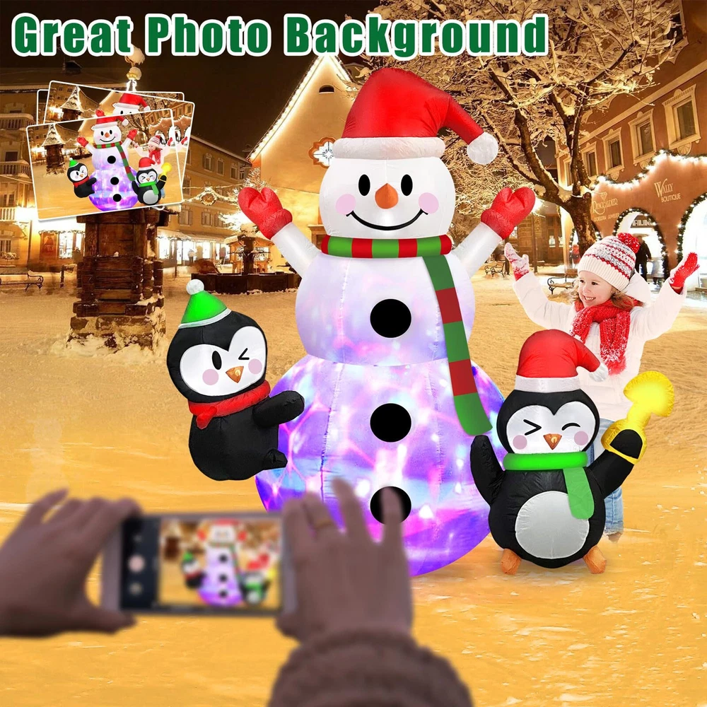Perfect Christmas Outdoor Decor: 6ft inflatable snowman with penguins can be used for your home, garden or Christmas party. This christmas decorations outside will create warm and fun memories Colorful Rotating LED Lights: Our christmas inflatables built-in colorful rotating LED lights that create a eye-catching display, setting a cheerful atmosphere for the holidays Premium Materials: Our Inflatable christmas blow ups decoration are made of waterproof 210T polyester fabric combined with excellent stitching to increase the durability, ensuring years of use Stable and Windproof: The christmas inflatables outdoor decorations has 2 built-in water bags, 6 stakes and 3 ties to secure the snowman inflatable to the ground increased weight and stability. Nice Gift for Kids: Your kids will be satisfied with the cute xmas inflatables outdoor decorations. Come with 1* inflatable snowman with 2 penguins, 6*stakes, 3*tethers, 2*sandbag and 1*manual