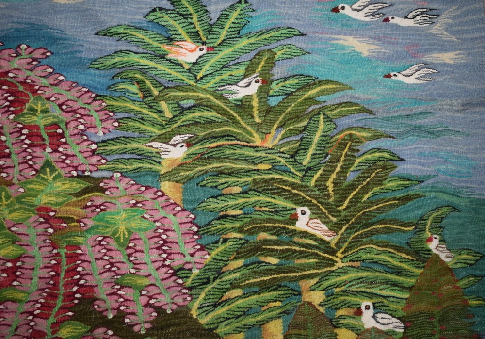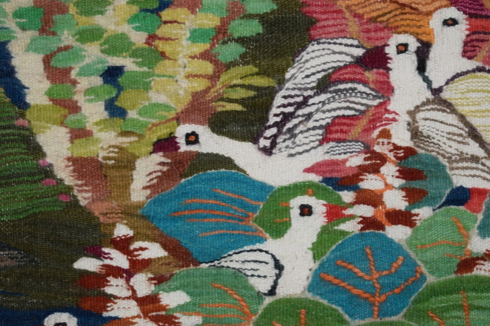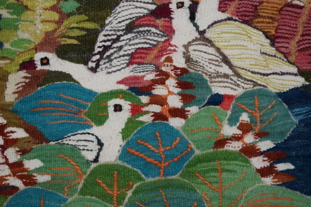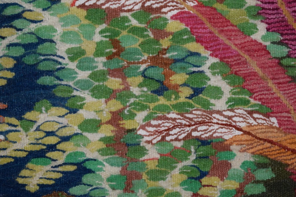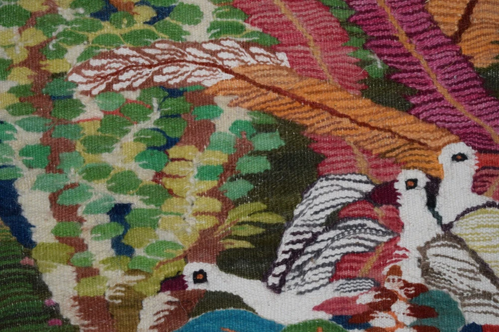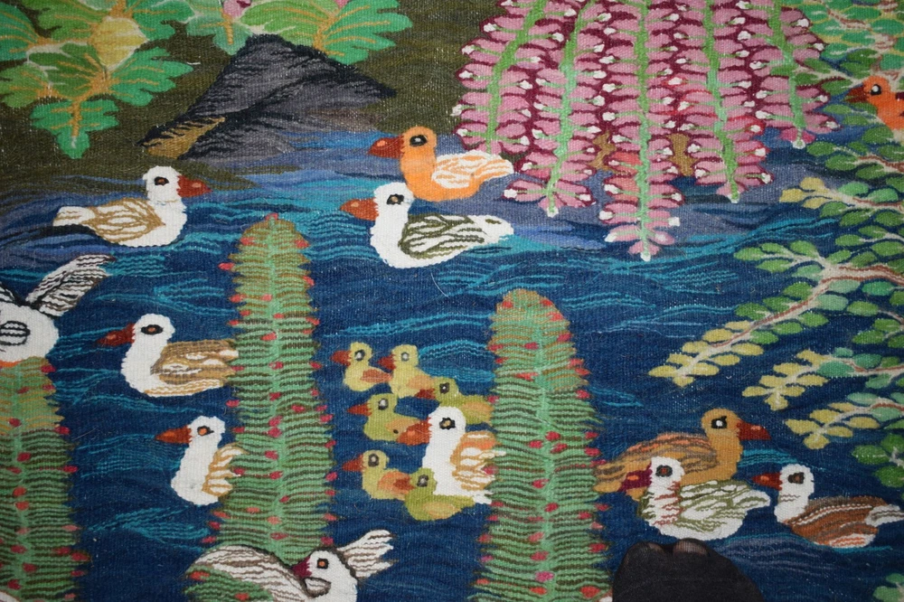 6 FT Handwoven Egyptian Kilim Rug Wall Hanging Tapestry Garden Ducks Birds Pink 6 FT Handwoven Egyptian Kilim Rug Wall Hanging Tapestry Garden Ducks Birds Pink Handwoven Egyptian Tapestry — Natural Dye Wool Thread — Artisan Wall Art — Wissa Wassef Style Experience the beauty of authentic Egyptian handwoven tapestry, crafted using natural plant-based dyes on high-quality wool threads. What makes each piece truly extraordinary is that the skilled artisans weave entirely from imagination — without sketches or guides — improvising every detail as they work. This rare mastery ensures that no two pieces are alike, making each tapestry a one-of-a-kind expression of artistic genius. The natural dyes give vibrant, long-lasting colors while being eco-friendly. This is a showpiece — a large, richly detailed scene with a cascading pink flowering tree at the center, surrounded by lush tropical plants, ferns, and succulents. Ducks swim in deep blue water, white birds perch among the foliage, and vibrant orange coral-like plants fill the lower half. Incredible color depth from top to bottom — greens, blues, pinks, oranges, and teals all woven together. Size: 6.0 x 3.8 ft / 71.5 x 46 inches / 182 x 117 cm (approx.) Can be used as a rug, wall hanging, or decorative throw