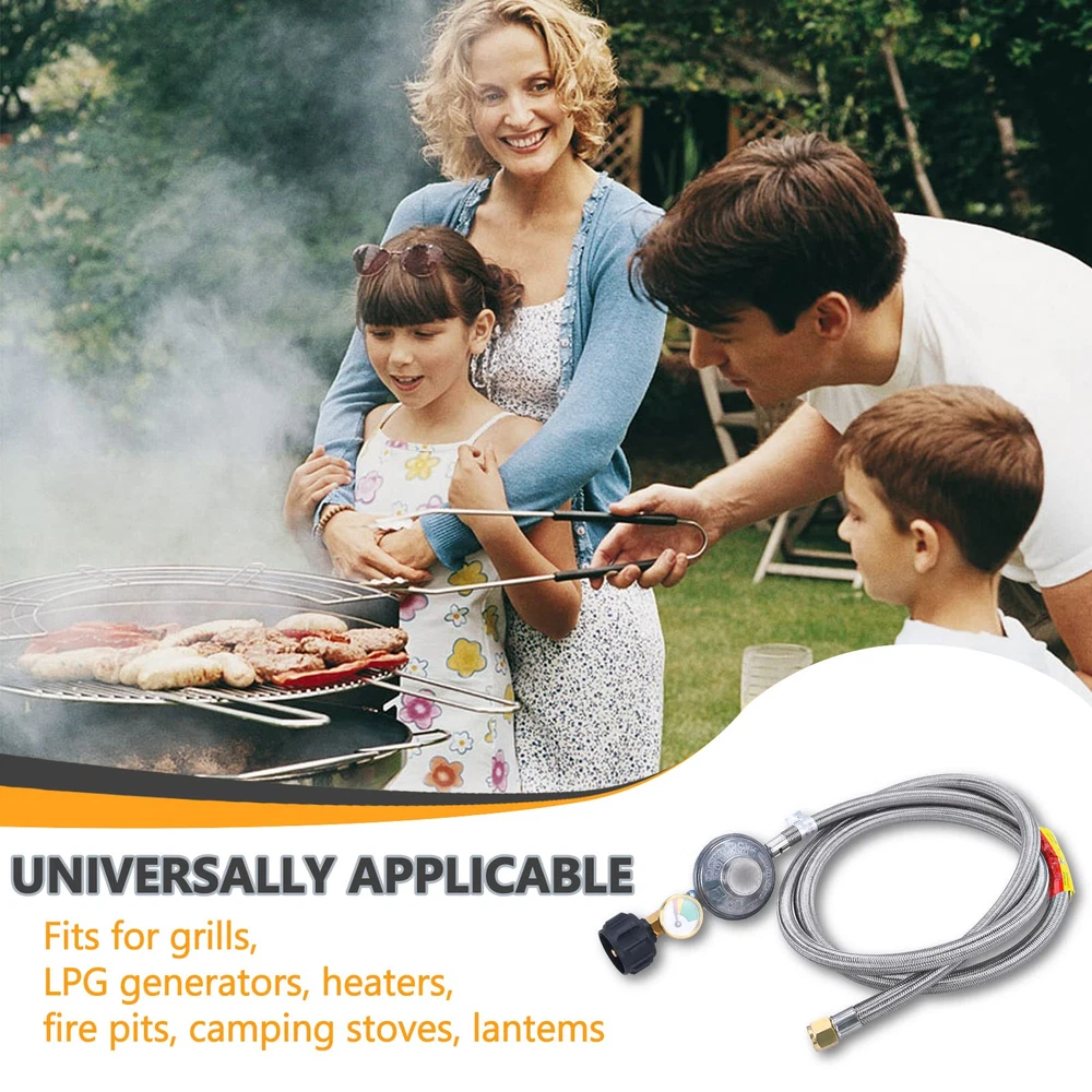 Stainless braided hose prevents whatever animals from chewing through it . The attached propane gauge can detect dangerous leaks and read fuel level at glance for Weber Genesis 300-series gas grills, Genesis Silver C, Genesis Gold ,Genesis Platinum , Spirit E-210/E-310 etc. and most of Char-broil gas grill with side burner,Dyna-Glo dgp350snp-d,mfa350bnp/mfa350cnp ge530bsp-d, dge486ssp-d, dge486gsp-d etc.,Uniflame GBC873W-C, GBC873W, GBC940WIR, GBC940WIR-C, GBC976W, GBC956W1-C, GBC1076WE-C, BH12-101-001-02 etc., most of Kenmore gas grill and most of Easy installation - No tools required, tool-less attachment to tank. It is normal if you hear noise in the regulator, it is the resonance of the gas in the regulator. Connects to QCC1/Type1 LP tanks and cylinders,fits to gas grills, heaters ,fire pit table and most QCC1/Type 1 low pressure gas application.Great for BBQ, camping, tailgating, heating needs or having an outdoor cookout. Provides secure, air-tight connection between grill or fire pit and tank, no gas leaks, ensures safety while using grill, no issues with regulator or gas, air flow is kept stable and at appropriate levels
