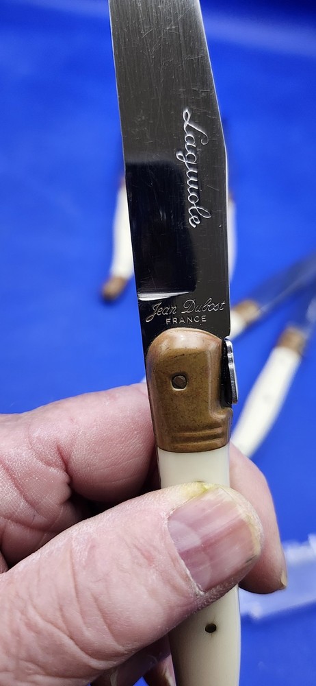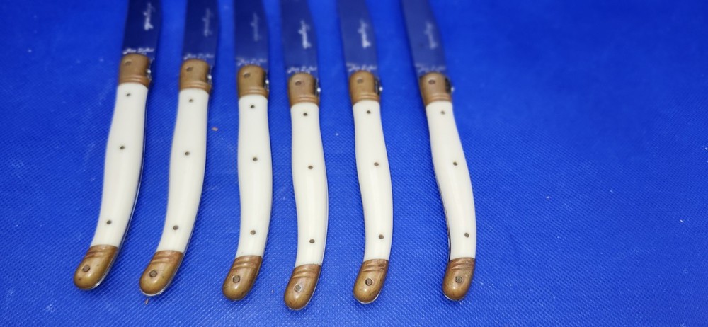 Material: Brass, Stainless Steel Color: Beige Brand: Laguiole Country/Region of Manufacture: France Features: With Handles Blade Length: 4 1/2" Set Includes: Steak Knife Blade Edge: Straight Type: Knife Set Model: laguiole Number of Items in Set: 6