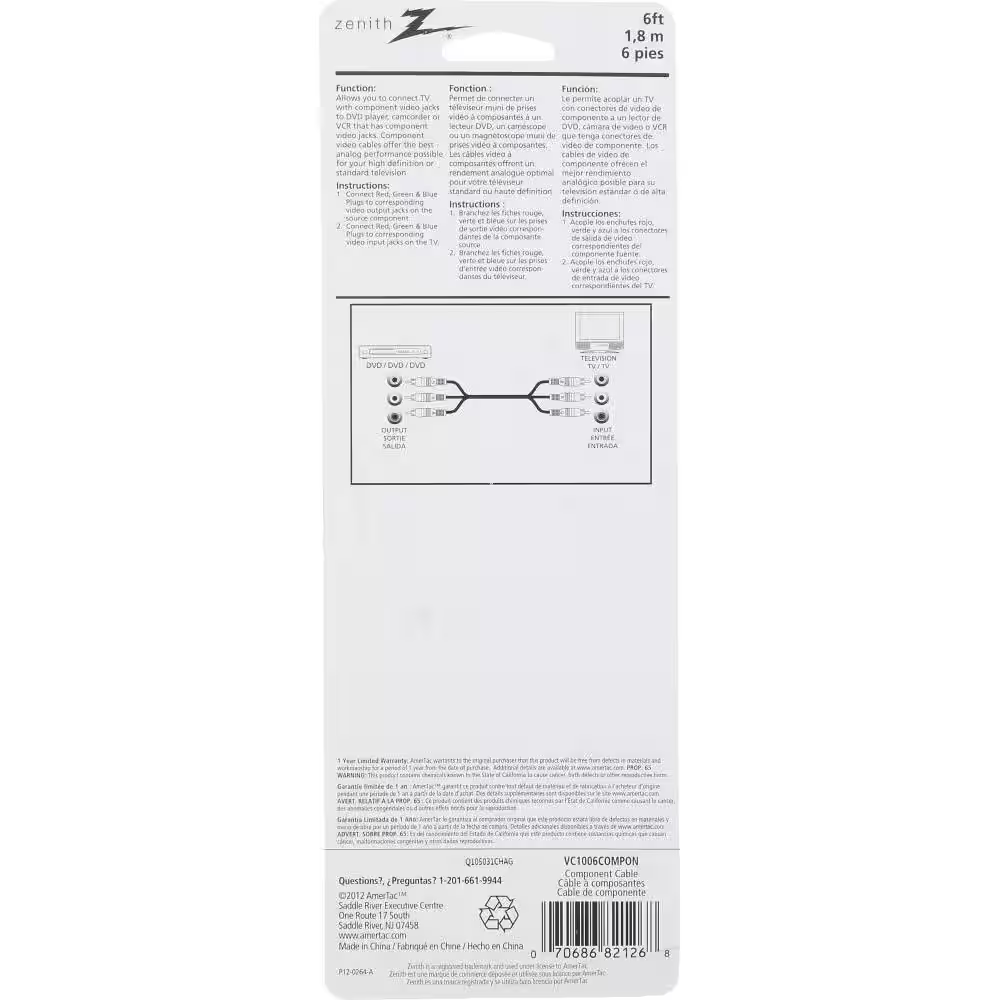 Fast Shipping On All Items 30 Days Money Guarantee Customer Support Excellent Service 100% Satisfaction Satisfaction Guaranteed 6 Ft. Video Component Cable, Black Specification Cable Type Component Video Cables Color Family Black Features No Additional Features Returnable Non-Returnable Manufacturer Warranty 1 Year Limited Warranty Product Length (ft) 6 ft 6.0 ft. Item Description Connects TV to VCR, DVD player, camcorder, or other devices Cable separates signals to provide well-defined videos Molded strain relief offers complete protection of connectors The Zenith Video Component Cable (6 ft.) connects your TV with your DVD player, camcorder, VCR, or other devices with component video jacks. This cable provides the best analog performance possible for high definition or standard television viewing. AmerTac manufacturing brands offer complete lines of distinctive decorative home accent products that include trend-setting wall plates, money-saving LED night lights, innovative under-cabinet lighting, and battery-operated LED lights. We also offer utility product lines including energy-saving timers, dimmers, and lighting controls, as well as an extensive offering of consumer electronics accessories for the home and office. About us We offer the best prices around on high quality products. Our E-store includes media such as books, movies, music and games while offering electronics, toys, sporting apparel, clothing, tools, general home, garden items and more. Shipping We are always working hard to ensure your package arrives as soon as possible. Please understand that some factors like weather, high postal traffic, and the performance of shipping companies are outside of our control. We offer free shipping to the lower 48 states and ship within 2-3 business days of payment, usually sooner. We do not accept P.O. Boxes. Please provide a physical address. For shipping outside of the continental USA, we only use eBay's Global Shipping Program.The item is shipped to KY and then sent to the rest of the world. International customers are responsible for all duties and taxes. Continue to check out to calculate costs for shipping the item to your country. Messages regarding eBay's Global Shipping Program MUST be directed at eBay EXCLUSIVELY. Returns We offer a 30-Day Return Policy on items in which you are not completely satisfied with. You have the option of a full-refund or an exchange of the item. No returns are available on items shipped outside of the USA Satisfaction We try over very best to make sure every customer is completely satisfied. If there's a problem, message us! We're happy to help. Payment Options Shop With Confidence