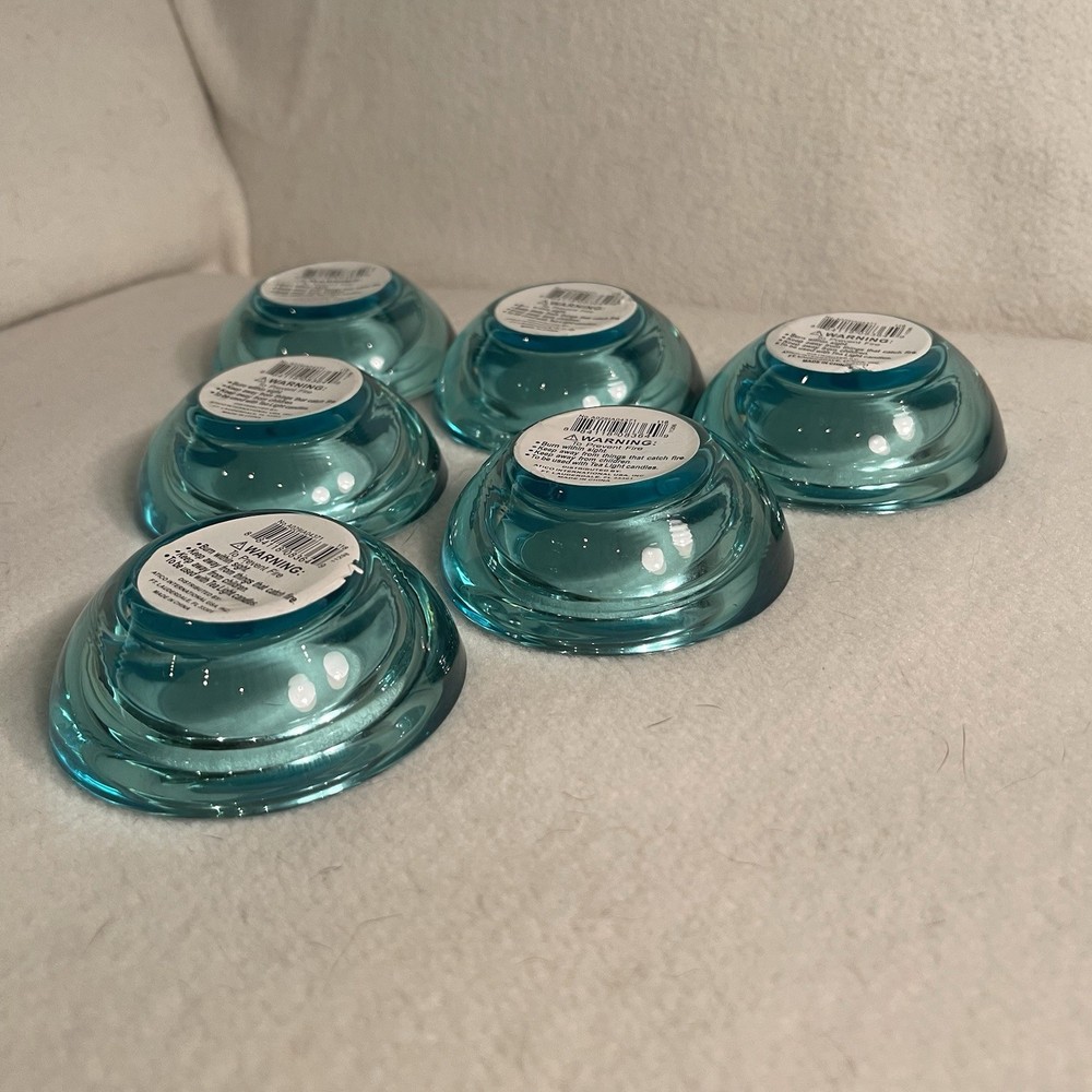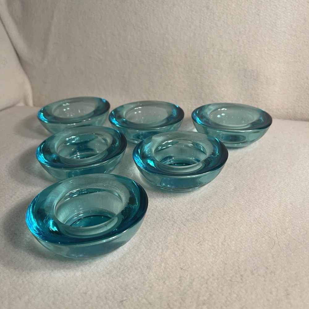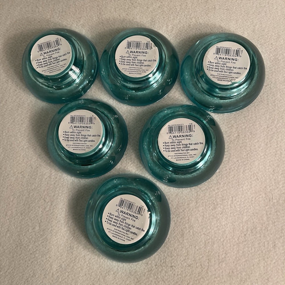 This set of 6 glass turquoise tea light candle votive holders features a solid round shape, with dimensions of 3 inches in length and height, and 3 inches in width. They are suitable for tea lights and can stand freely on any room, adding a modern and decorative touch to the space. The holders are perfect for Christmas, holiday, and romantic themes, with a smooth turquoise finish that adds a touch of elegance to any room. Made in China, these small glass holders are a stylish and functional addition to your home. Excellent condition. No chips or cracks.