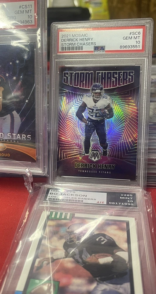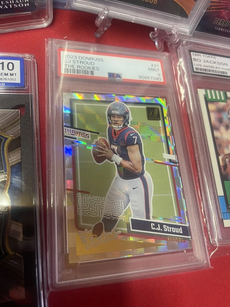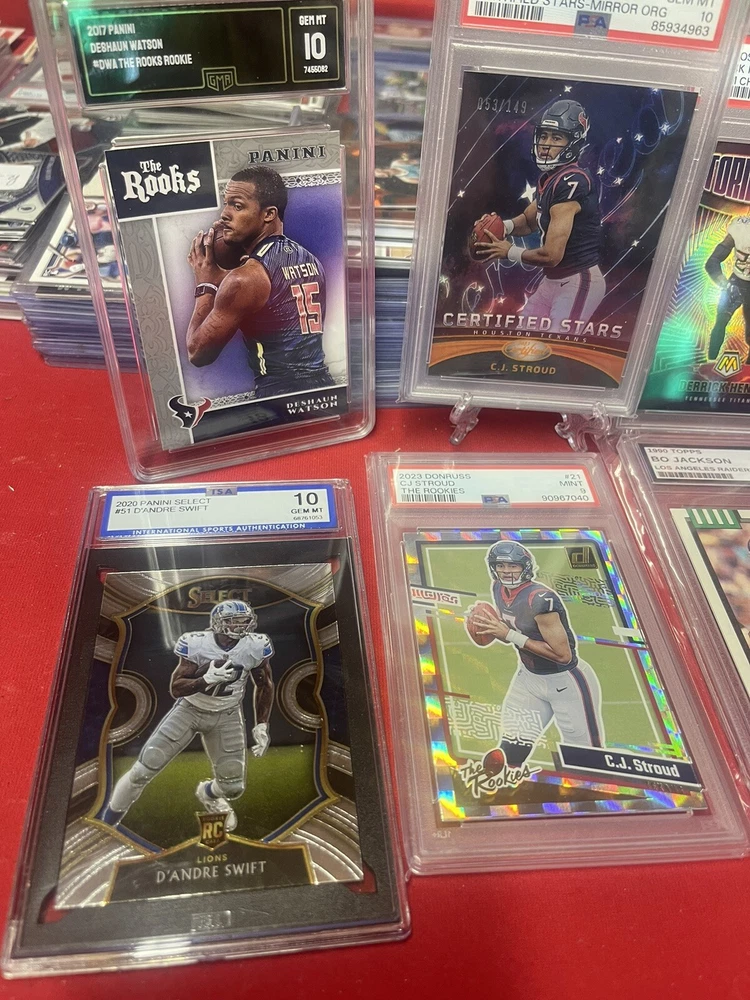 This lot features six high-grade sports trading cards, including some of the most sought-after players in the National Football League. The cards are from Panini and come in standard size. None of the cards are autographed, but they do have features like serial numbered, short print, base set, exclusive, rookie, collector's edition, and insert. The lot includes players like Deshaun Watson, D'Andre Swift, Derrick Henry, and CJ Stroud. The cards are all original. These cards are well-represented, and the lot is perfect for anyone who wants to add some high-quality cards to their collection. Just the Certified Stars card is worth $250+ get your moneys worth by adding 5 more graded cards for dirt cheap. Don’t worry about loosing money on this one!