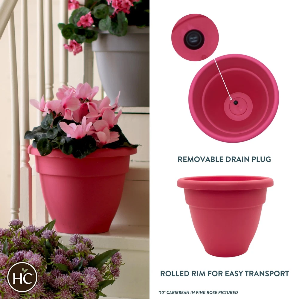 These colorful planters are perfect to beautify any area, outdoor or indoor. Lightweight and durable, these pots are weatherproof, so they can be left outside without the worry of them cracking or color fading. Grow a wide range of plants in these containers such as vegetables, ornamentals, herbs, and more. These pots nclude drain plug to avoid overwatering of your plants. DURABLE & LIGHTWEIGHT - Made from polypropylene plastic, these plant pots are sturdy and lightweight. The rolled rim helps you to easily move the container, even when it is full of soil. It won't break or crack when lifting. DRAINAGE HOLE WITH REMOVABLE PLUG – Remove the plug for drainage or leave it in. The contoured base of these pots helps protect plants from excess watering. TRADITIONAL DESIGN - Trendy colors and a classic look allow this decorative pot to fit into any indoor & outdoor setting. These plastic plant pots are UV resistant and will not crack or color-fade over time. GREAT FOR A VARIETY OF PLANTS - These round planters come in several sizes and are great for indoor houseplants, as well as outdoor gardening on your patio, porch or deck. Use them to grow vegetables, flowers, herbs, snake plants and more. MADE IN THE USA - For over 35 years, has been manufacturing horitcultural containers. This pot was proudly manufacturer at our factory in Ohio.