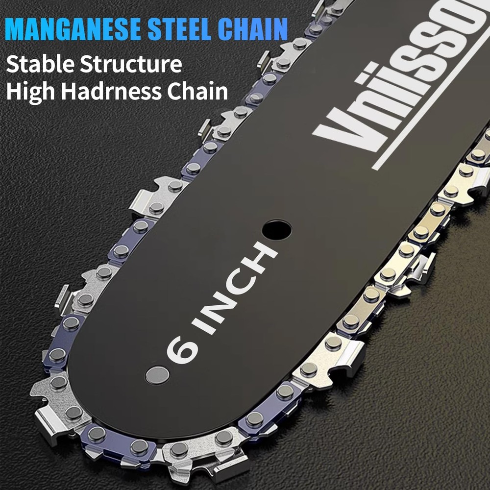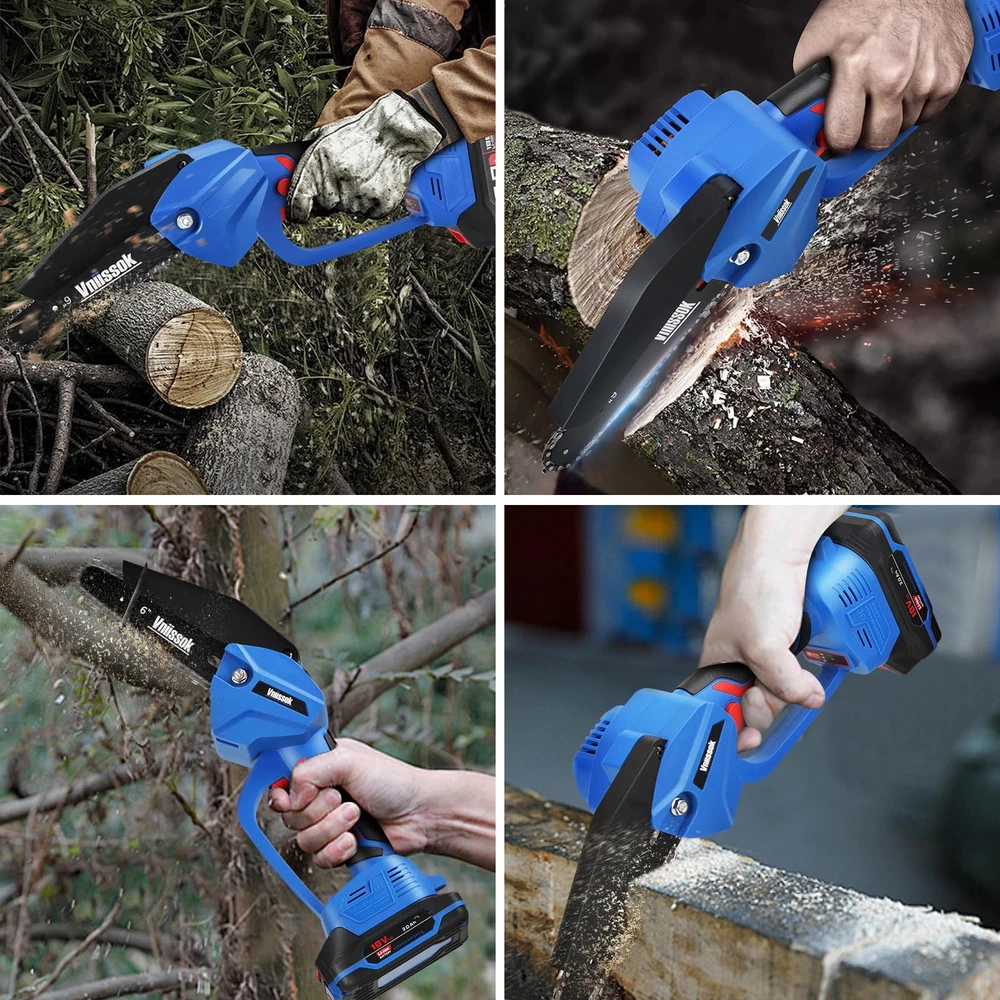The cordless handheld chainsaw with 2 Pack 18V removable, Lithium-ion batteries with self-overload and temperature protection provide a much longer battery life. Hand chain saw can make much quicker and more effective work. You can put it into work immediately after receiving this mini cordless chainsaw and just installing the battery, very convenient. We equip you with an extra chain and installation tools. When not in use, remove the battery pack for added safety. đ 6 Inch Mini Chainsaw Perfect Tool for Dad, Mom, Friends, Husband, DIYer đ ăUSEFUL YARD TOOLS WITH AWESOME CUTTING POWERă Super handheld chainsaw adapts a high-quality guide chain that lasts longer than other mini chainsaws. Cut 6-inch branches with no effort, like a hot knife through butter. Smoothly cutting thicker pieces of wood that other chainsaws struggle with, make easy work of tree trimming, camping & gardening. Finish more work in less time! ăNOT INTIMIDATING, WOMAN FRIENDLYă Our chain saw is small in size, not scary like a large chain saw. It's easy to handle and work like a champ, friendly to the elderly, women, arthritis patients. Due to its lightweight and soft anti-slip handle, women are easy to operate and will not be tired after working for a long time. ăLARGE CAPACITY BATTERY PACKă The mini electric chainsaw is equipped with 2000mAh removable & rechargeable battery, the cordless mini chainsaw will finish all your cutting, even in the field! Charging at any time, convenient and fast.If you do not use it for a long time, please remember to fully charge the battery first, for a better experience the next time you use it. ăCONVENIENT AND SAFE DESIGNă You can put it into work immediately after receiving this mini cordless chainsaw and just installing the battery, very convenient. Security lock prevents accidental activation and Safety baffles to prevent the wood from splashing.. The simple operation also makes it beginner-friendly. ăEVERYTHING YOU NEED IS HEREă 1 x Cordless Chainsaw, 2 x 18V 2000mAh Batteries, 2 x Chains , 1 x Guide Plate , 1 x Quick Charger , 1x Screwdriver, 1 x Instruction Manual, 1 x Storage Box. Enjoy the double battery life. After the chain wears out, you can also replace it by yourself. ăPERFECT FOR THE MIDDLE SIZED LOGS/BRANCHESă This handheld mini chainsaw is PERFECT to make quick work of small logs and large branches. This is best for small, branches and tighter areas that a 12 in chainsaw will not work. It holds well in hand and shaped. Making wood cutting a breeze! ăEASY TO CARRY ă Our lightweight battery chainsaw is small and convenient, quick and easy to assemble, just need 1 minute for all install.Ideal for both home and work, it effortlessly fells common trees or large logs with ease and efficiency. ăWIDELY USED AND IDEAL GIFTă The cordless handheld chainsaw can be used for general tree trimming, garden art, and shrub trimming, as well as for forest harvesting, wood cutting, and other activities. Suitable for gardens, farms, parks, forests, pastures, orchards, indoors and other places. Mini chainsaw cordless is very friendly for the women and elderly. It's an amazing gift for your Mom,Dad,grandparents!