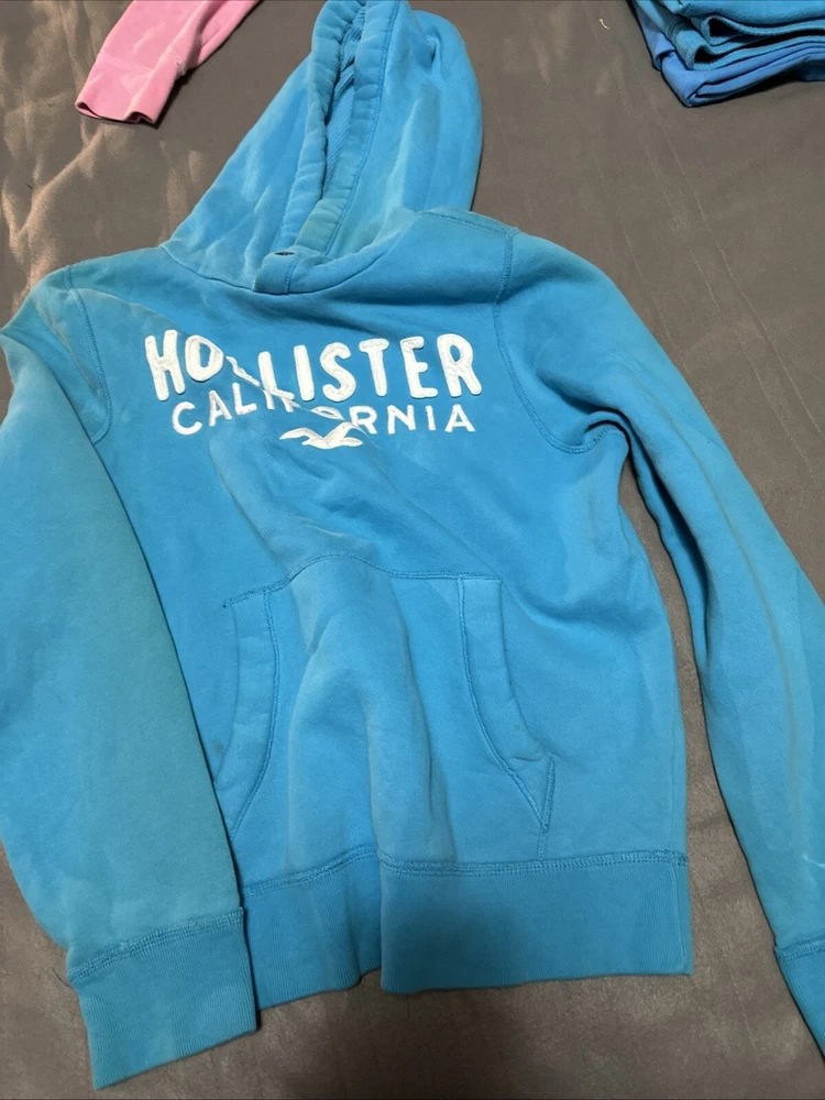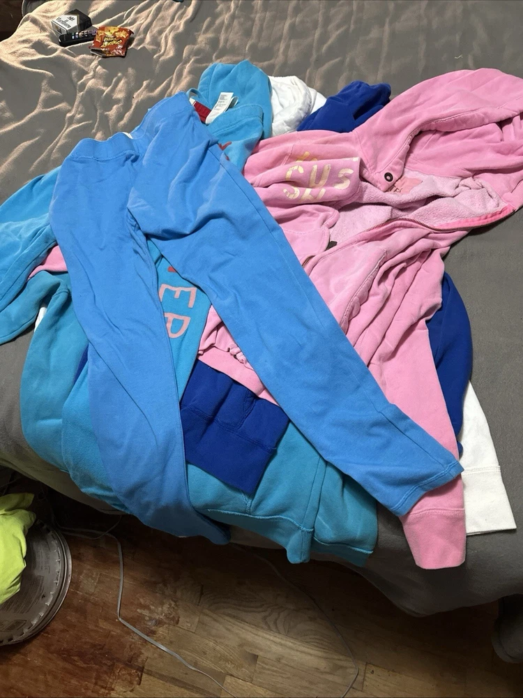 The lighter blue hoodie looks like ut had smoke film on the arms and shoulders. The other 5 pieces are in food condition for there afe