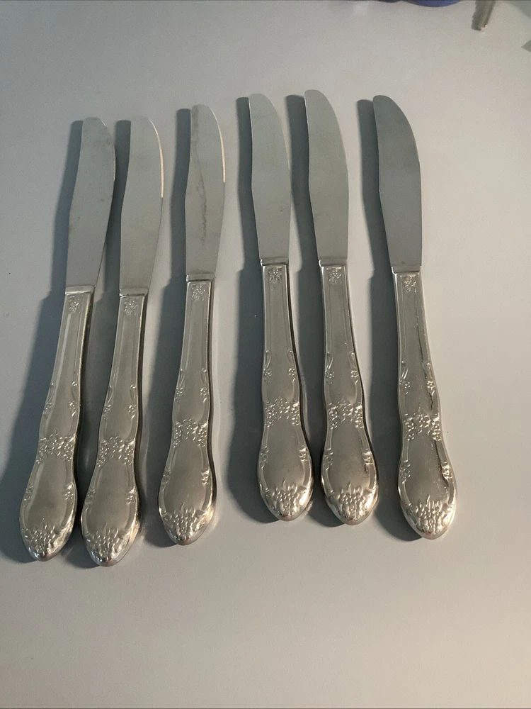 You are getting six dinner night. They are in good. Use condition with every day uses and scratches. They are about 8 1/2 inches long.