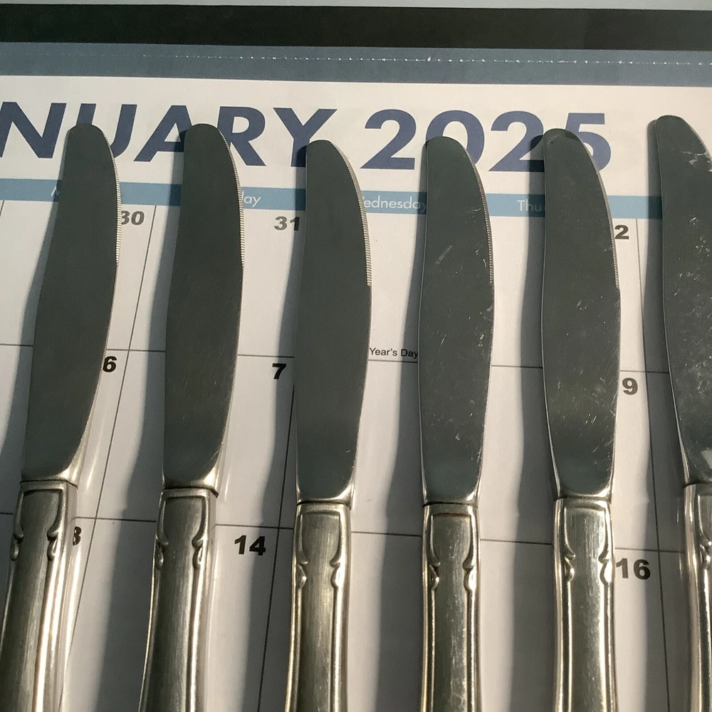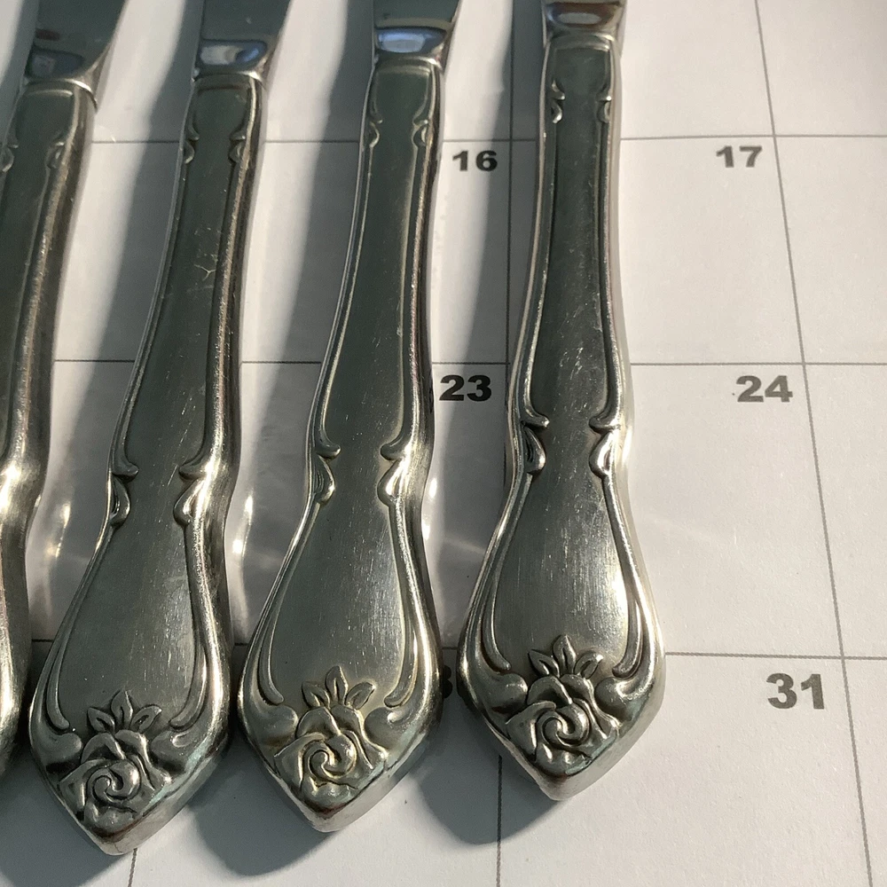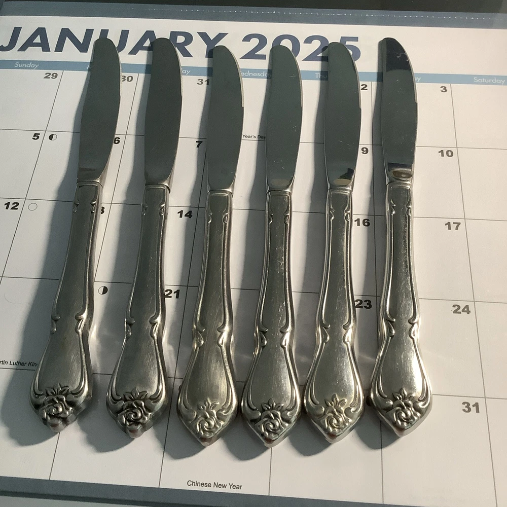 You are getting six dinner knives. They are about 8 1/2 inches long and they are in good. Use condition with every day uses and scratches.