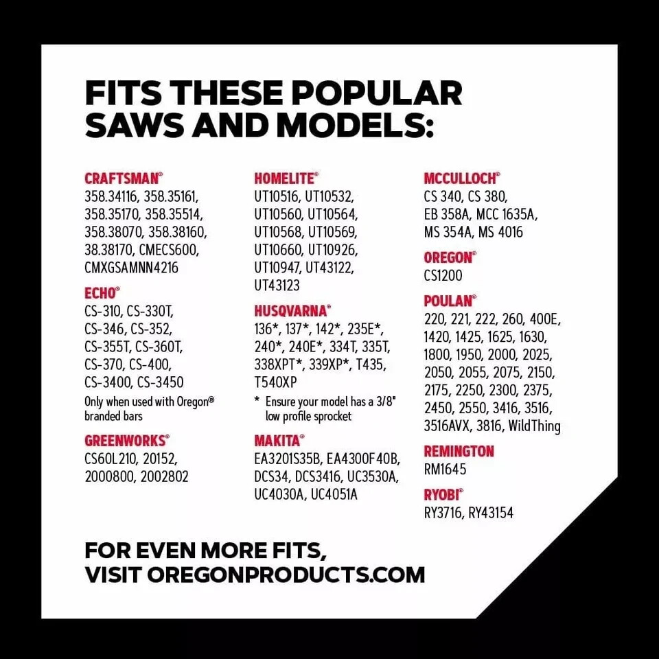 The Oregon S56T 2 Pack Saw Chain is designed to fit all chainsaw brands, with models that require a 3/8 Inch pitch, .050 Inch (1.3 mm) gauge, with 56 drive links. Fits chainsaw models from several brands including Makita, Echo, Husqvarna, Craftsman, Poulan and more Product Details 2 x durable, low-kickback, low-vibration chains help reduce user fatigue for increased periods of work- For all chainsaws brands that run 3/8 Inch Pitch, .050 Inch (1.3 mm) gauge, 56 drive links Fits these chainsaw models: Echo CS-400, CS-310, CS-352 and CS-370, Poulan 2150 and 3816, Makita EA4300F40B, Ryobi RY3716 and other similar models Precision, heat-treated semi-chisel chain cuts smoothly with a higher tolerance for debris Built-in Lubri-Tec automatic oiling system extends the life of your chain by delivering oil to key parts of the chain so you can work smarter with less downtime and maintenance Tough, long-lasting chrome outer layer and hardened rivets help reduce wear and allow for fewer chain adjustments For saw sizes up to 42 cc This saw chain met the kickback performance requirement of ANSI B175.1-2012 when tested according to the provisions of ANSI B175.1-2012. Low-kickback saw chain meets the kickback performance requirement of CSA Standard Z62.3. Allis Chalmers Black & Decker Black Max Chicago Craftsman Dayton Dolmar Earthwise Echo Efco Green Machine Greenworks Homelite Husqvarna John Deere Jonsered Kobalt Makita Mastercraft McCulloch Oregon Partner Pioneer Poulan Powerhorse Red Max Remington Ryobi Shindaiwa Skil Solo Sun Joe Sunrise Tanaka Troy-Bilt Wen Yardworks Zombi Replacement Guide Husqvarna Power Care Stihl TriLink