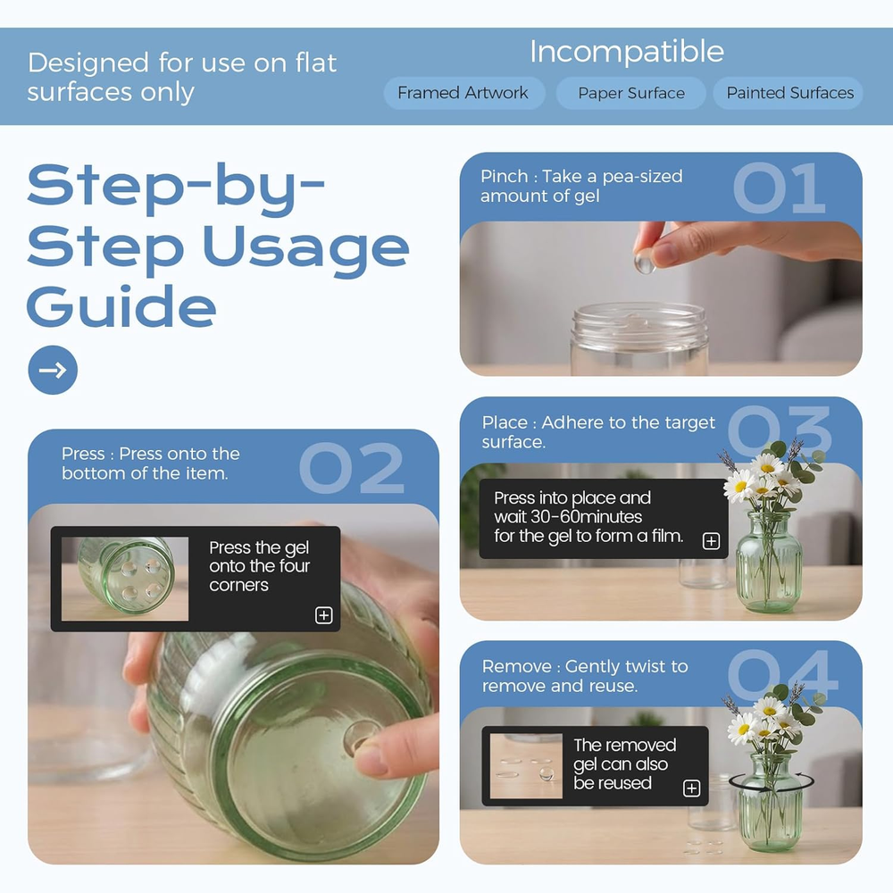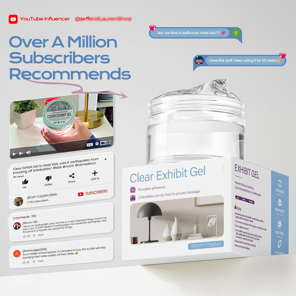 Store New Arrivals Add to Favorite View Feedback Contact 6 Oz Clear Exhibit Gel, Reusable Museum Exhibit Putty to Keep Collections in Place, Removable & No Residue Exhibit Wax Fixed Decorations and Collection to Prevent Falling, Vibration. Description Item Package Quantity 1 Style Transparent Mounting Special Feature Clear, Non Toxic Item Volume 6 Fluid Ounces Unit Count 6.0 Color Clear Viscosity High Viscosity Water Resistance Level Not Water Resistant Number of Pieces 1 Item Weight 7 ounces Viscosity Level High Package Information jar Full Cure Time 6E+1 Minutes Item Form Gel Package Dimensions 4.21 x 4.17 x 3.11 inches Clear Exhibit Gel: Using RUIOT clear museum exhibit gel to firmly fix your collection to the flat surface to prevent it from falling off due to vibration or accidental touch, providing long-lasting and invisible protection for your collection. Residue Free & Removable: Ruiot Museum exhibit putty does not cure or harden, and is no residue left after removal, easy to adjust layout without damaging the surface. Clear exhibit gel can over 200 uses without compromising adhesion. Versatile & Easy Use: Museum exhibit wax can be used on a variety of smooth surfaces. Form a pea-sized exhibit gel, stick it on the bottom of the object, press it on the surface, and wait 30 minutes. Whether it's plastic, wood, glass, metal, or ceramics, this putty offers versatile adhesion, prolonging the lifespan of your valuable collectibles. Premium material: Transparent exhibit gel made from natural materials, safe for pets and environment. It's removable, no odor, non-yellowing, shock-resistant, and non-slip, specially designed for museum exhibit display and valuable protection. Note: 1. Only for flat surfaces. Not suitable for walls, sloping surfaces, hanging objects and paper materials. 2. Do not use on any surface with micropores as it will leave marks. 3. Do not apply on raw wood. 4.For small items, avoid using excessive gel. If too much gel is applied, allow it to sit for half an hour before removing the squeezed-out portion. Satisfaction: Your satisfaction is our persistent pursuit. If you encounter any problems while using it or any spills caused by shipping, please contact us and our customer team will solve it for you within 24 hours. Product description YouTube Influencer with Over a Million Subscribers Recommends Brand Products ABOUT US We offer the best prices around on high quality products. Our E-store includes media such as books, movies, music and games while offering electronics, toys, sporting apparel, clothing, tools, general home, garden items and more. SHIPPING We are always working hard to ensure your package arrives as soon as possible. Please understand that some factors like weather, high postal traffic, and the performance of shipping companies are outside of our control. We offer free shipping to the lower 48 states and ship within 2 business days of payment, usually sooner. We do not accept P.O. Boxes. Please provide a physical address. For shipping outside of the continental USA, we only use eBay's Global Shipping Program.The item is shipped to KY and then sent to the rest of the world. International customers are responsible for all duties and taxes. Continue to check out in order to calculate costs for shipping the item to your country. Messages regarding eBay's Global Shipping Program MUST be directed at eBay EXCLUSIVELY. RETURNS We offer a 30-Day Return Policy on items which you are not completely satisfied with. You have the option for a full-refund or an exchange of the item. No returns are available on items shipped outside of the USA. PAYMENT We accept PayPal. CONTACT US This page content is yet to come Please ad us to your favorite seller and visit again later Thank You CUSTOMER SATISFACTION We try our very best to make sure every customer is completely satisfied. If there's a problem, message us! We're happy to help. WE ACCEPT Copyright © 2021 AutoDS. | All Rights Reserved