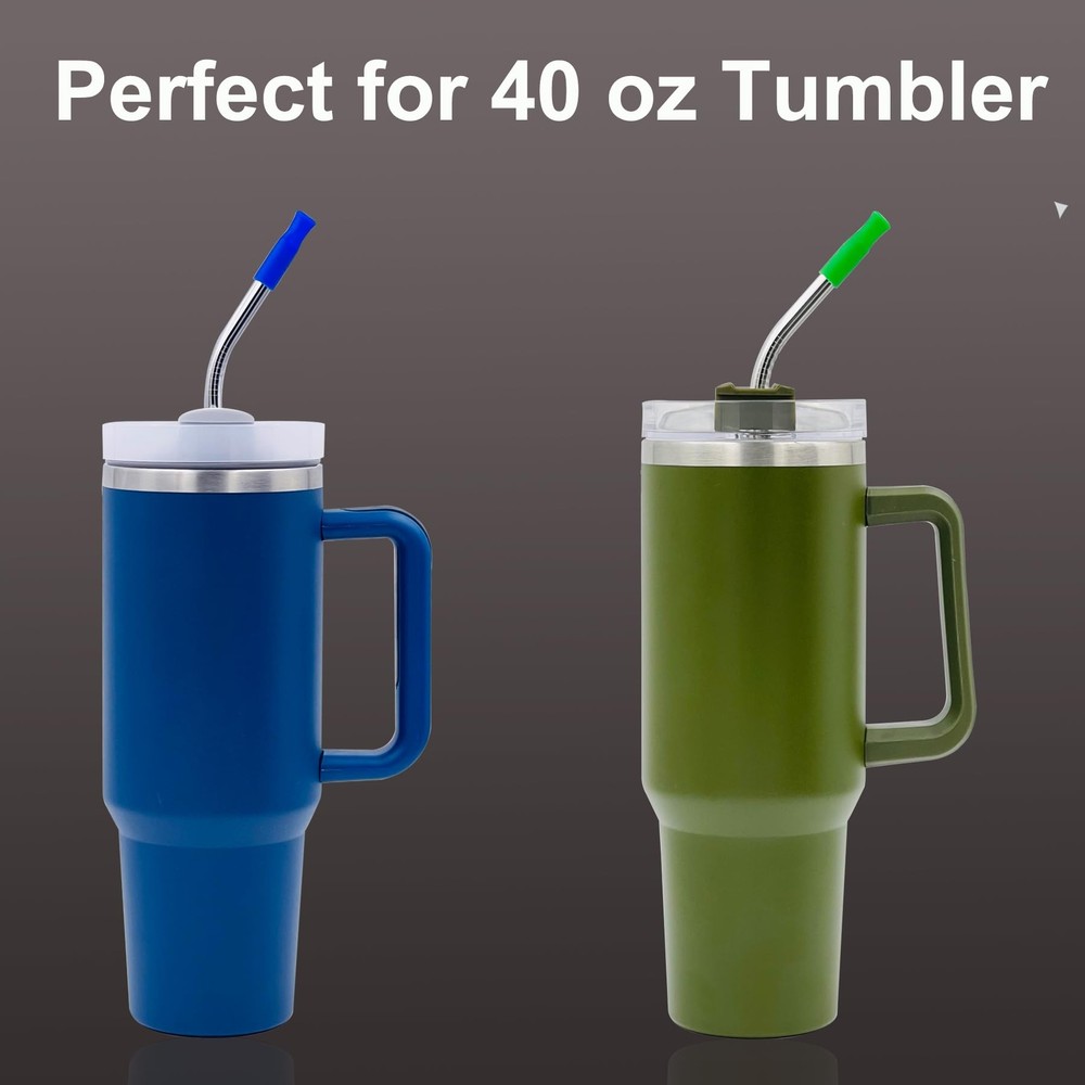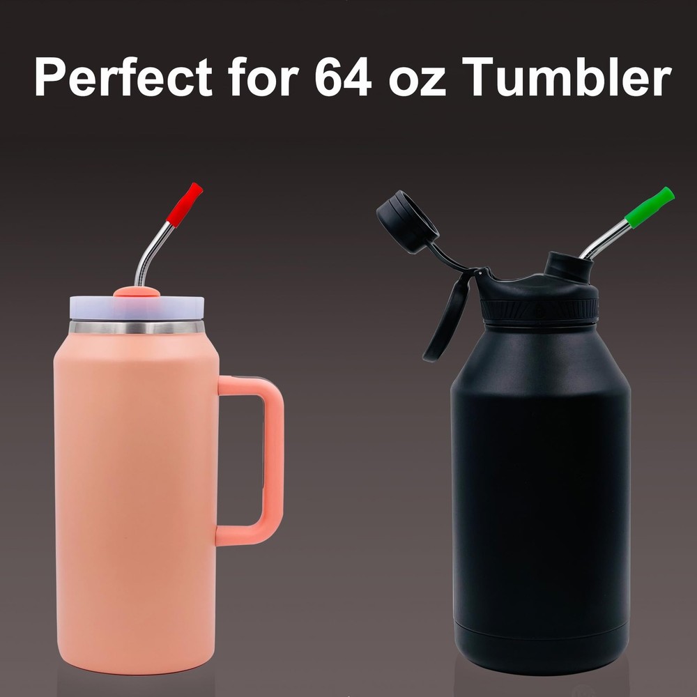 Wide Application: These extra long bent stainless steel straws can easily drink from your 32 40 64 oz tumbler Premium Material: Our ultra long reusable curved metal straws are made of food grade 18/8 stainless steel which ensures they won’t rust, corrode, become brittle and no yucky metallic taste Huge Size: 13" Length, 0.32" outer diameter, they have the perfect length to fit your 40 oz & 64 oz travel tumbler!!! Please the Lid Hole of container to ensure our 8mm metal straws can be put in your tall tumblers before purchasing it Reusable Silicone Tips: Our 8mm silicone straw tips are made of food grade silicoen, BPA free, non-toxic and odorless, they are good to pretect our teeth from the metal touch Easy To Clean & Dishwasher Safe: It comes with 2 cleaning brushes, this brush easily fits into the straw, that you have no worries about contamination being left behind What You Get: 6 Pieces 13inch bent metal straws + 6pcs silicone tips + 2 cleaning brushes
