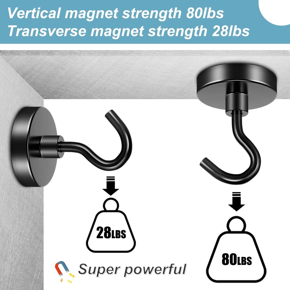 About FINDMAG 80LBS Magnetic Hooks Manufacturer_minimum_age : 120 months Data based on scientific measurement Grade: 5 Vertical Tension: 80 LBS Horizontal Tension: 28 LBS 1. We used A3 high quality steel as the test floor. 2. After many measurements, we have obtained scientific and rigorous measurements by pulling the hook at a uniform speed on professional equipment. Do you need to hang something in your home, warehouse, garage, office ... FINDMAG Magnetic hooks can be used anywhere in home, school, warehouse, garage, office or even on a cruise wherever there is a magnetic or metal surface. Hundreds of uses perfect for kitchen utensils, tools, filing cabinets, locker, fridge, mechanics, steel doors, hanging lights, decorations, cruises, and so much more! š¬ćIndustrial GradećIt is Neodymium Magnetic hook, Grade 5. Made of neodymium magnets and steel, permanent magnetic and durable. Compact and lightweight with strong force, which can be strongly attracted by iron, steel, nickel and other ferromagnetic material. š¬ćBearing CapacityćIt can Bear up to 80 lbs, the Power Reduced by 2/3 When Using it Horizontally (Please Always Reminded That the Magnetic Power Would Affected by the Surface, Material and Some Other Factors). š¬ćVersatile UsećThese magnetic hooks are fairly small and don't take up too much space. Perfect use for hang little gadgets, such as hang keys, hats, towels, cups, apron, purse, industrial tools, kitchen utensils, shed tools, filing cabinets, child safety, mechanics, wiring, washing lines, removing nails/screws, steel doors. š¬ćPerfect HooksćMagnetic hook is an ideal choice for hanging small things in bathroom, kitchen, living room, indoor, outdoor and workshop wherever there are iron or steel. š¬ćProfessional BrandćWe are professional magnet sellers and you can find any magnet you want in our store. Search FINDMAG MAGNETS. Find the magnet you want!